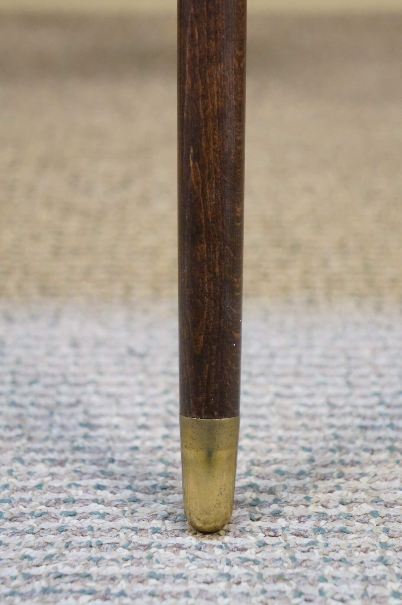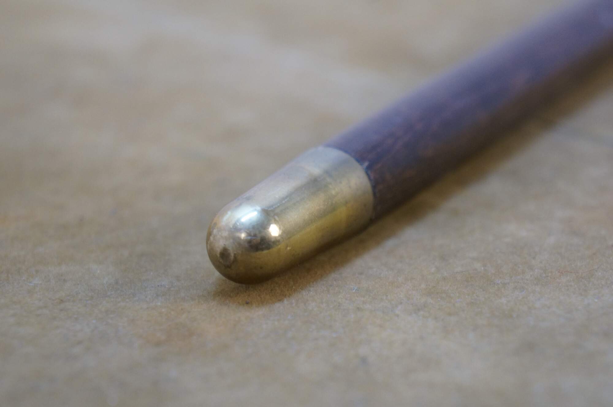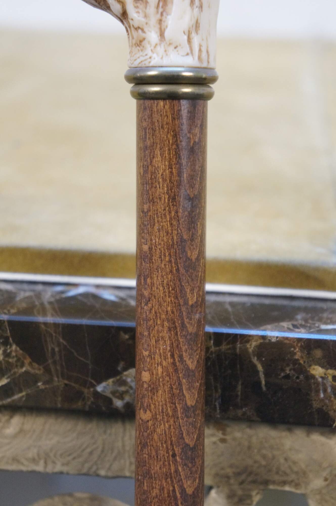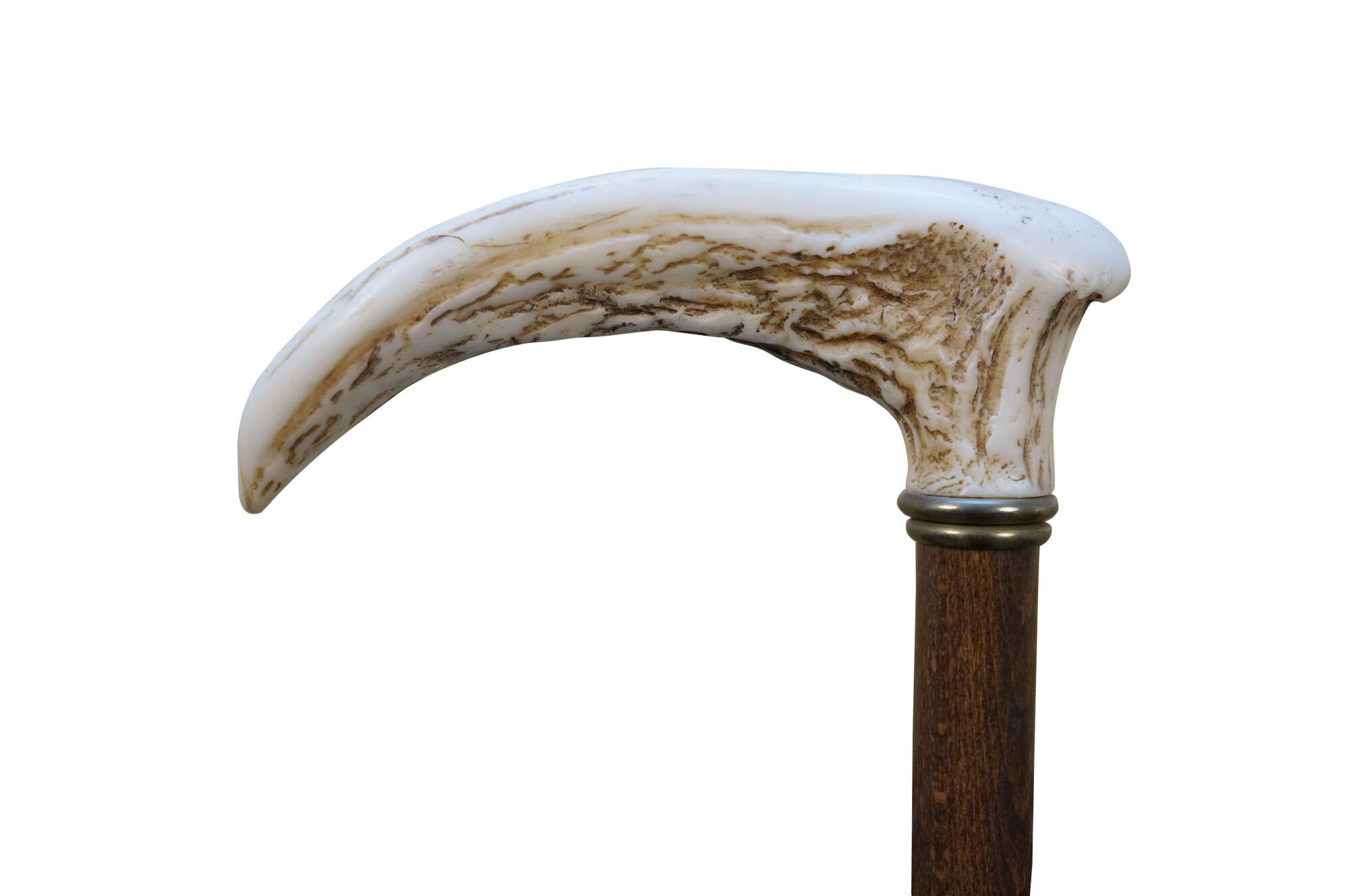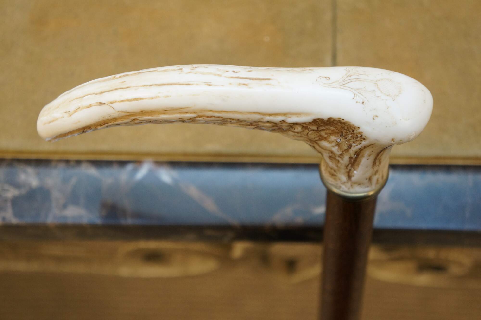 Vintage oak wood walking stick / cane with brass ferrule and collar, topped with a naturally curved L shaped stag horn / antler handle, etched along the top with the image of a Scottish thistle.