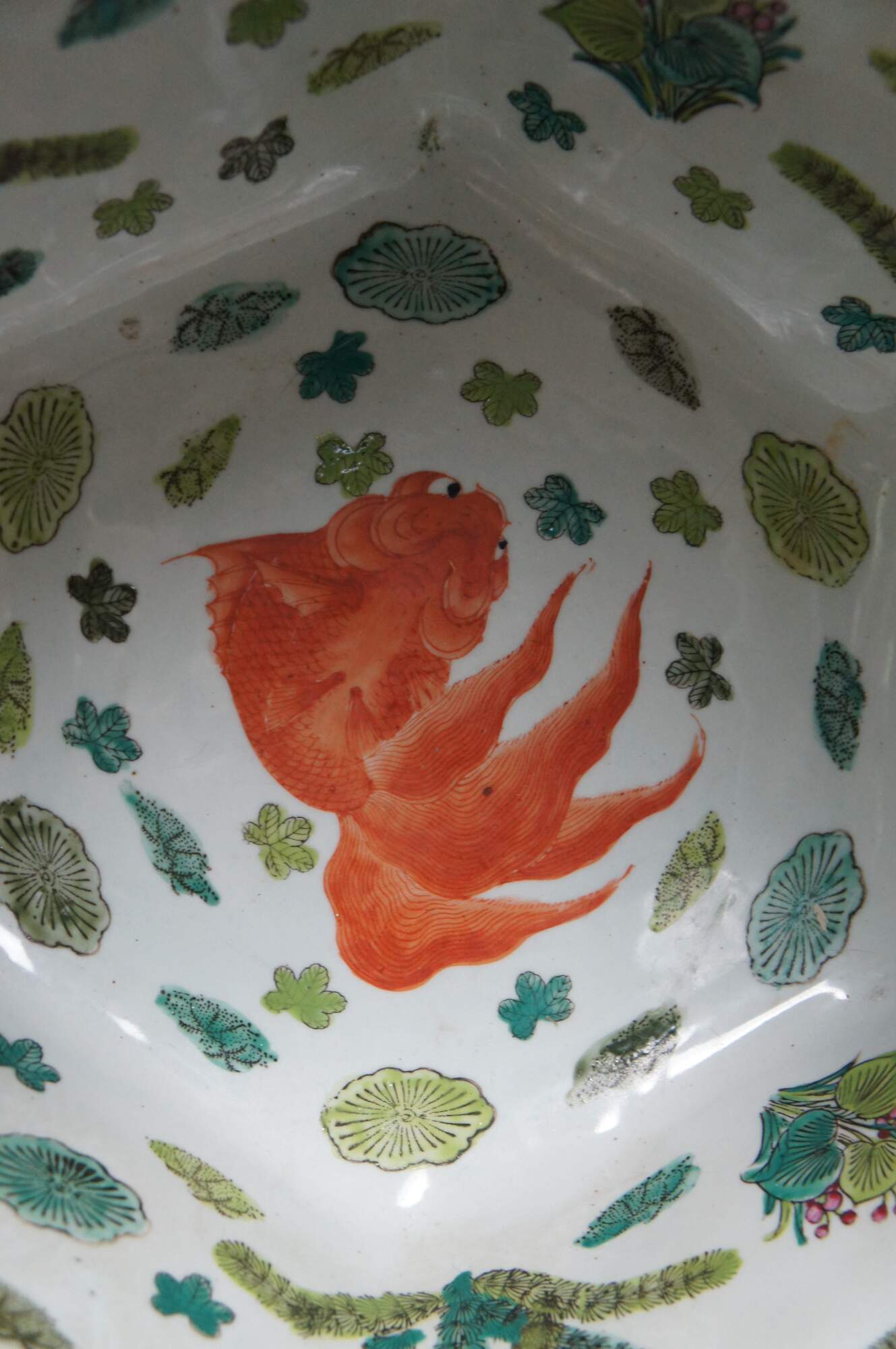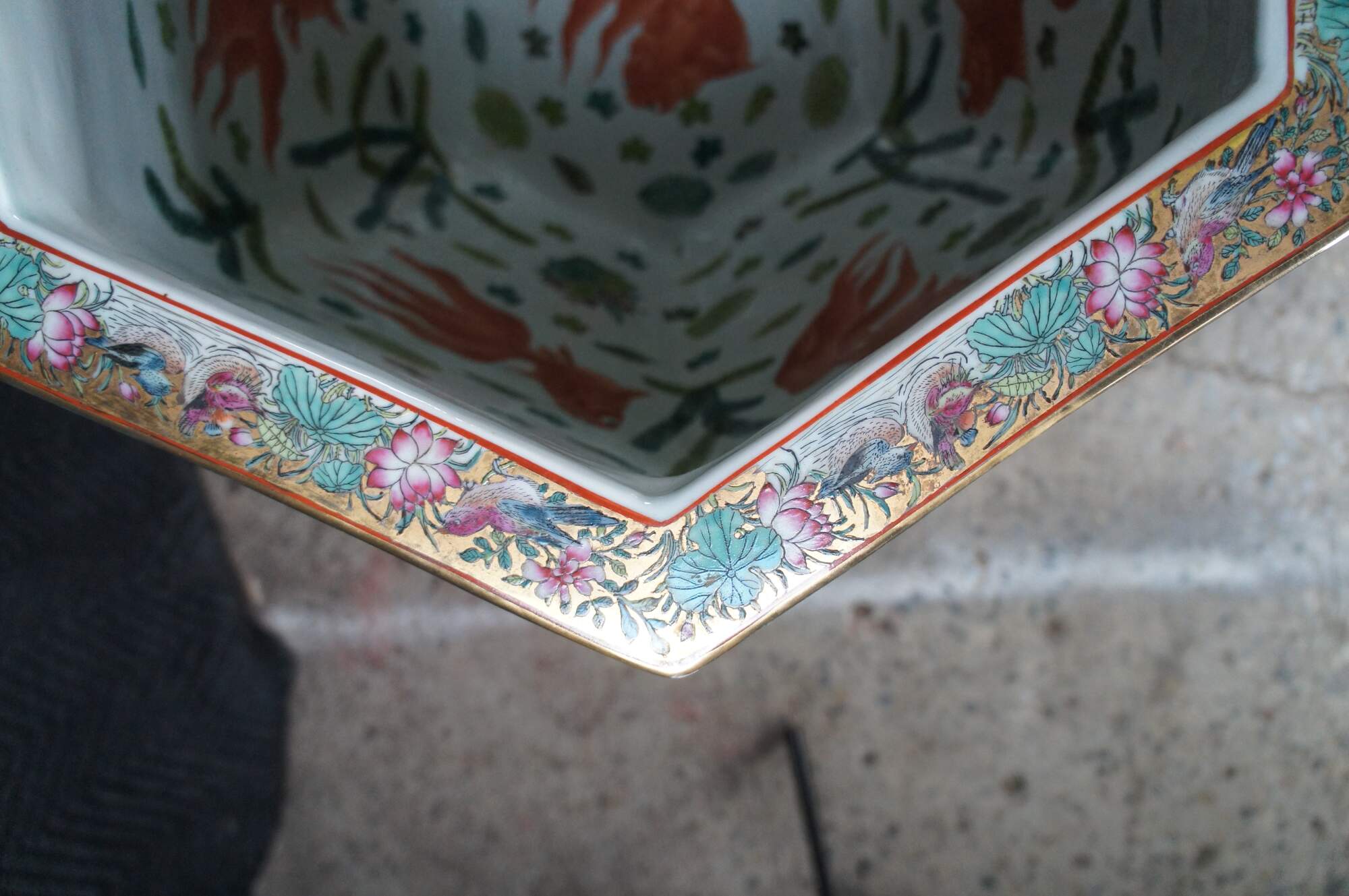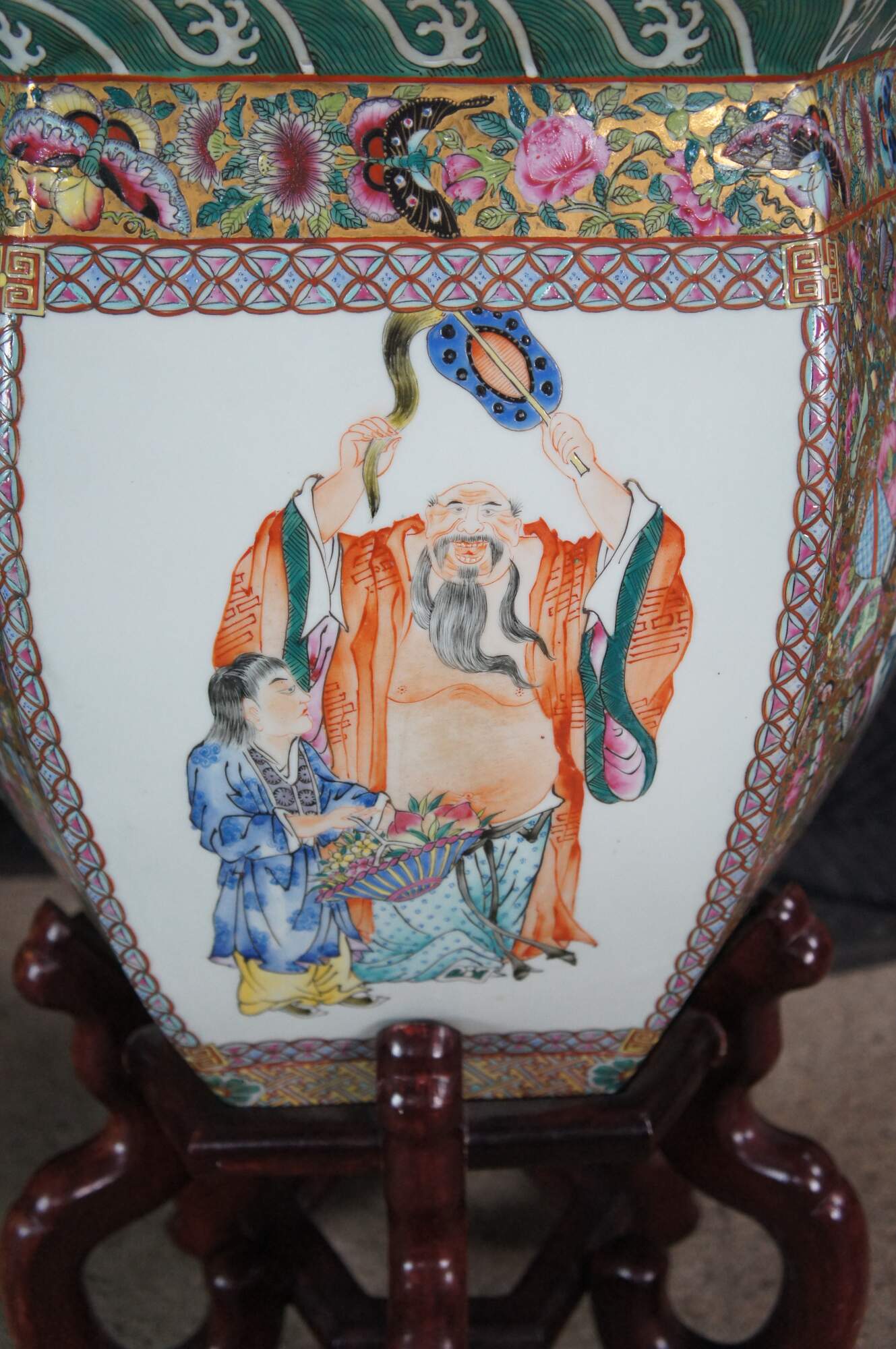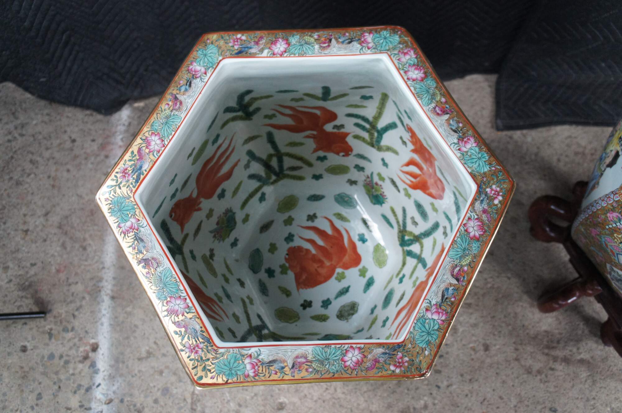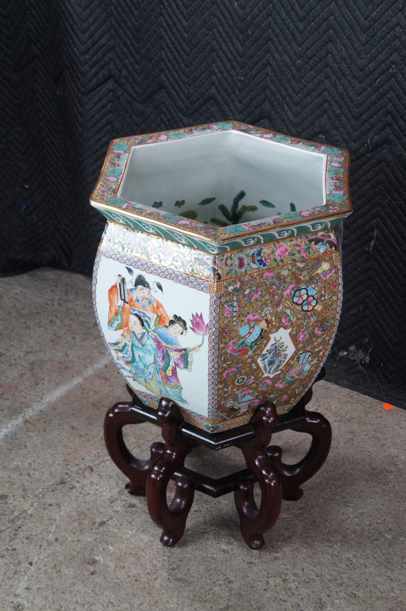 An equisite pair of 20th century Chinese Famille Rose Planters, Jardinieries or Cache Pots. Feature ornately decorated heaxagonal polychrome porcelain form with koi fish painted along the inside. The exterior has a beautiful alternating pattern of oriental figures set between a flowing pattern of insects, chrysanthemums, foliate and decorative wares over gold. A true pair with mirrored scenes. One shows two musicians with a geisha or dancer holding a lotus flower. Another shows three wise men or elders and the last shows a large man with child holding a basket of flowers. The lip of each vase has a vibrant green repeating wavecrest pattern along the outside and the tops have a colorful scene of birds, foliate and lotus flowers. The vase rest on wooden scrolled stands and are stamped along the base. A chrarming addition and statement in any space!