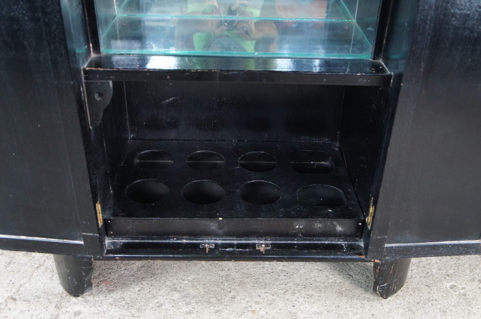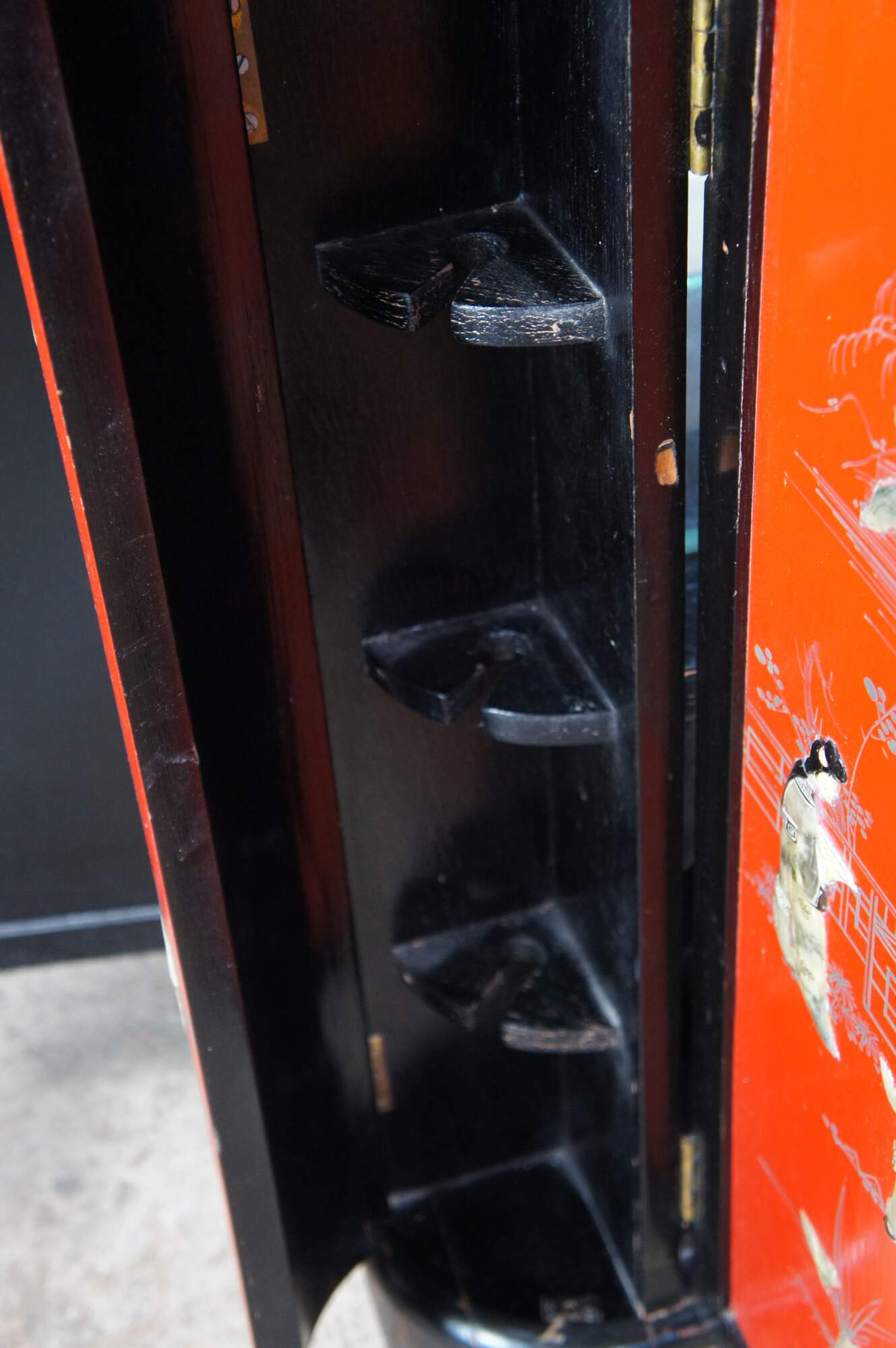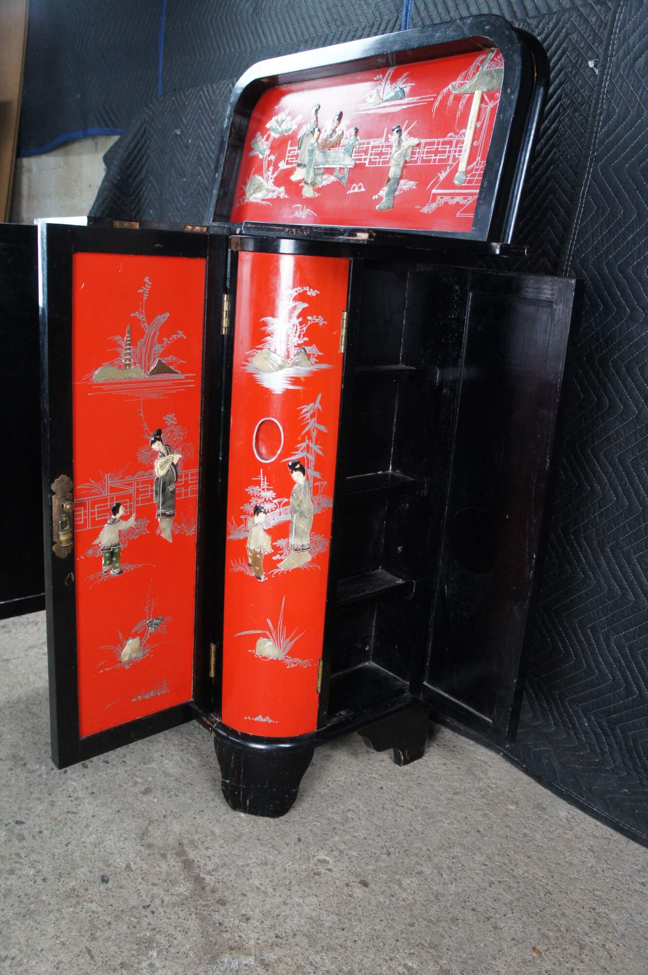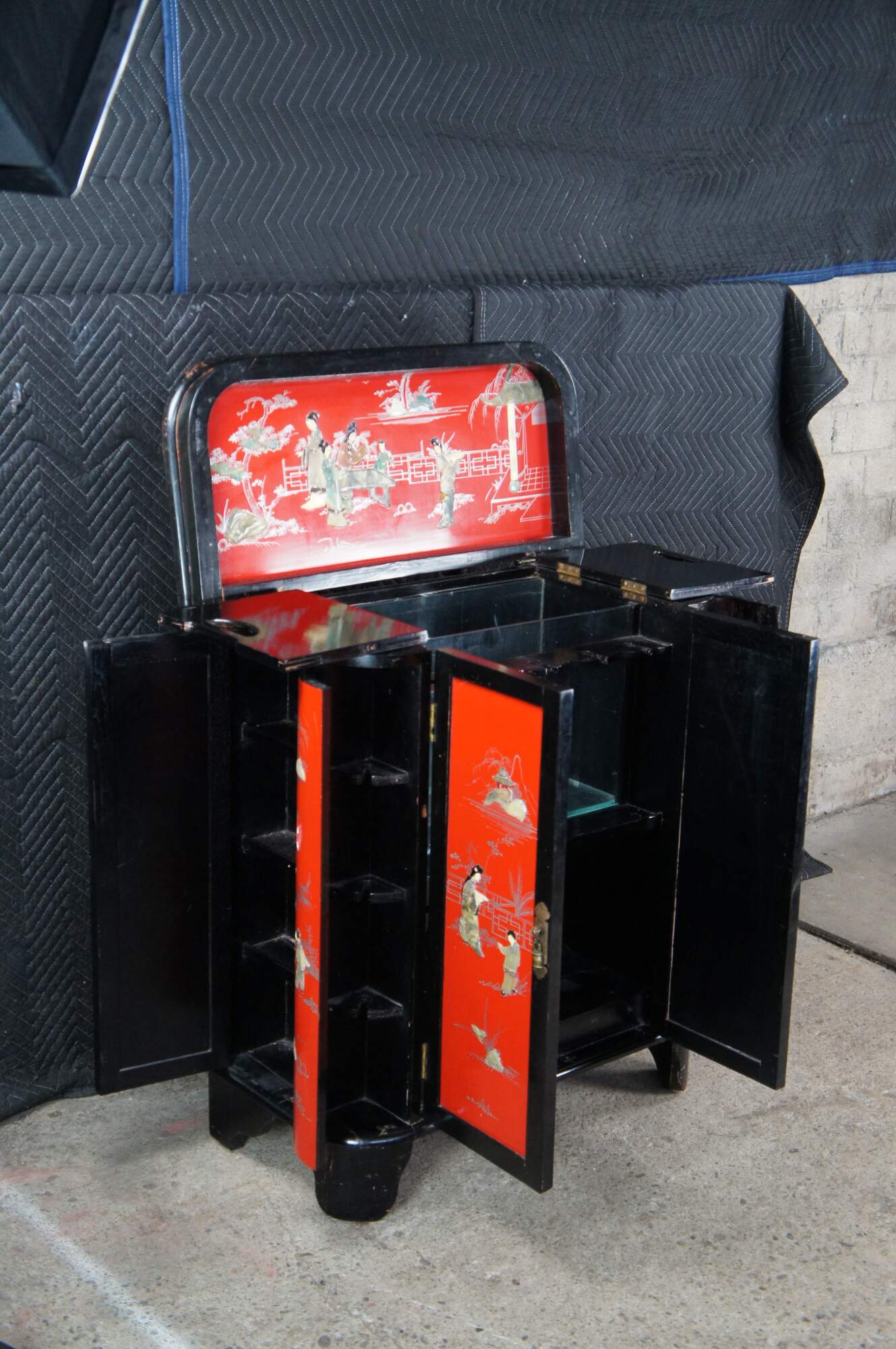 Mid-20th Century Chinese Red and Black Lacquer Soapstone Inlaid Dry Bar, circa 1960s. Features a demilune form with a flip-top opening to a mirrored area for glassware and bottles as well as hanging glasses. The lower section has a pullout with space for 8 additional bottles. Each front corner opens with hanging space for 3 additional goblets or cordials. Along the back side, there are two additional hidden doors that open to 3 shelves for more glassware. The cabinet is decorated in a traditional oriental motif with painted pagoda and geisha scenes featuring raised soapstone elements and figures. A fun addition to any space.