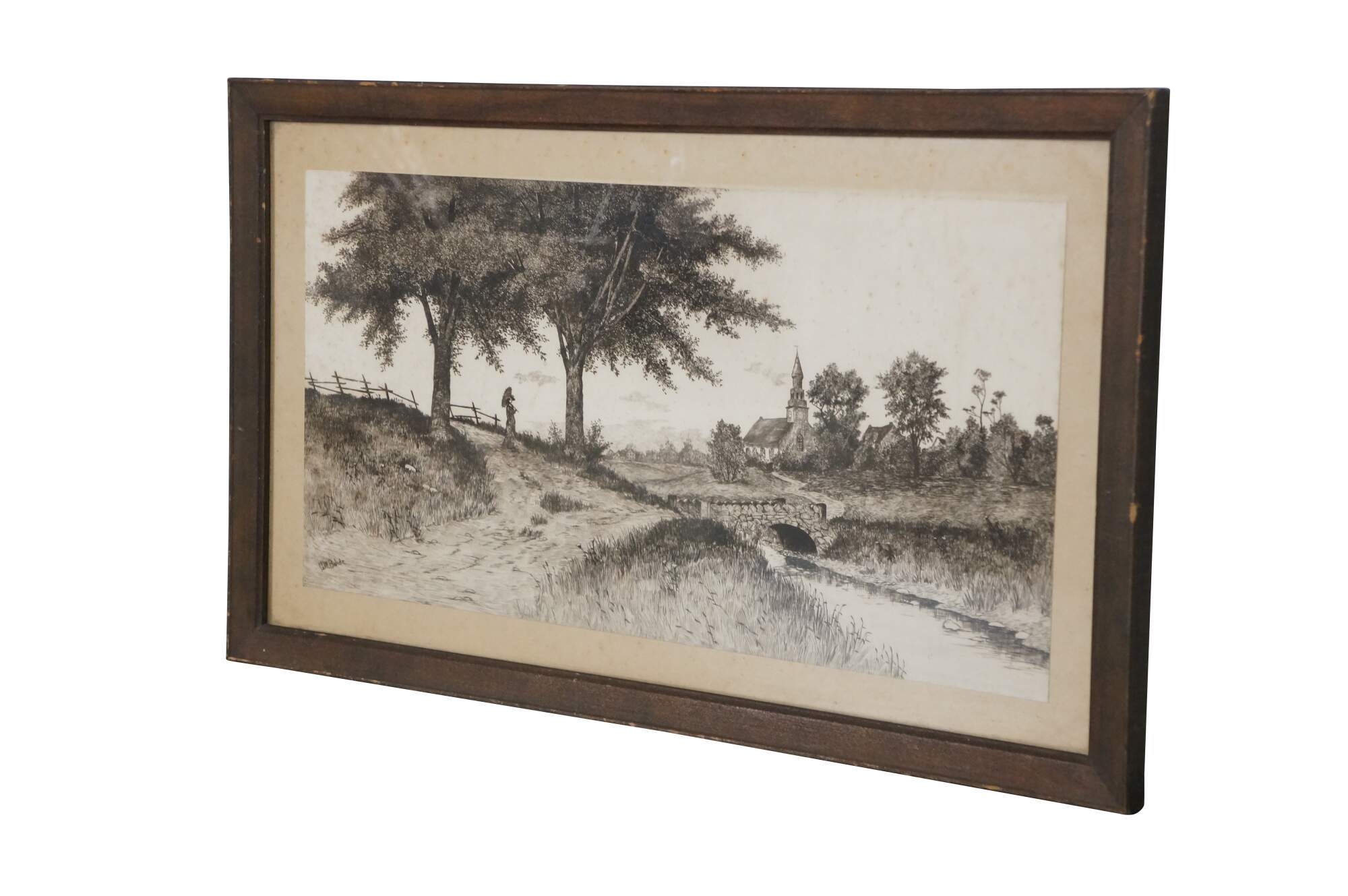 Late 19th century black and white etching by George William Bohde (American, 1870-1939). Landscape showing a woman in Victorian dress, walking on a path near a stream with a stone bridge and a country church. Signed in plate. Plain beveled wood frame; white mat.