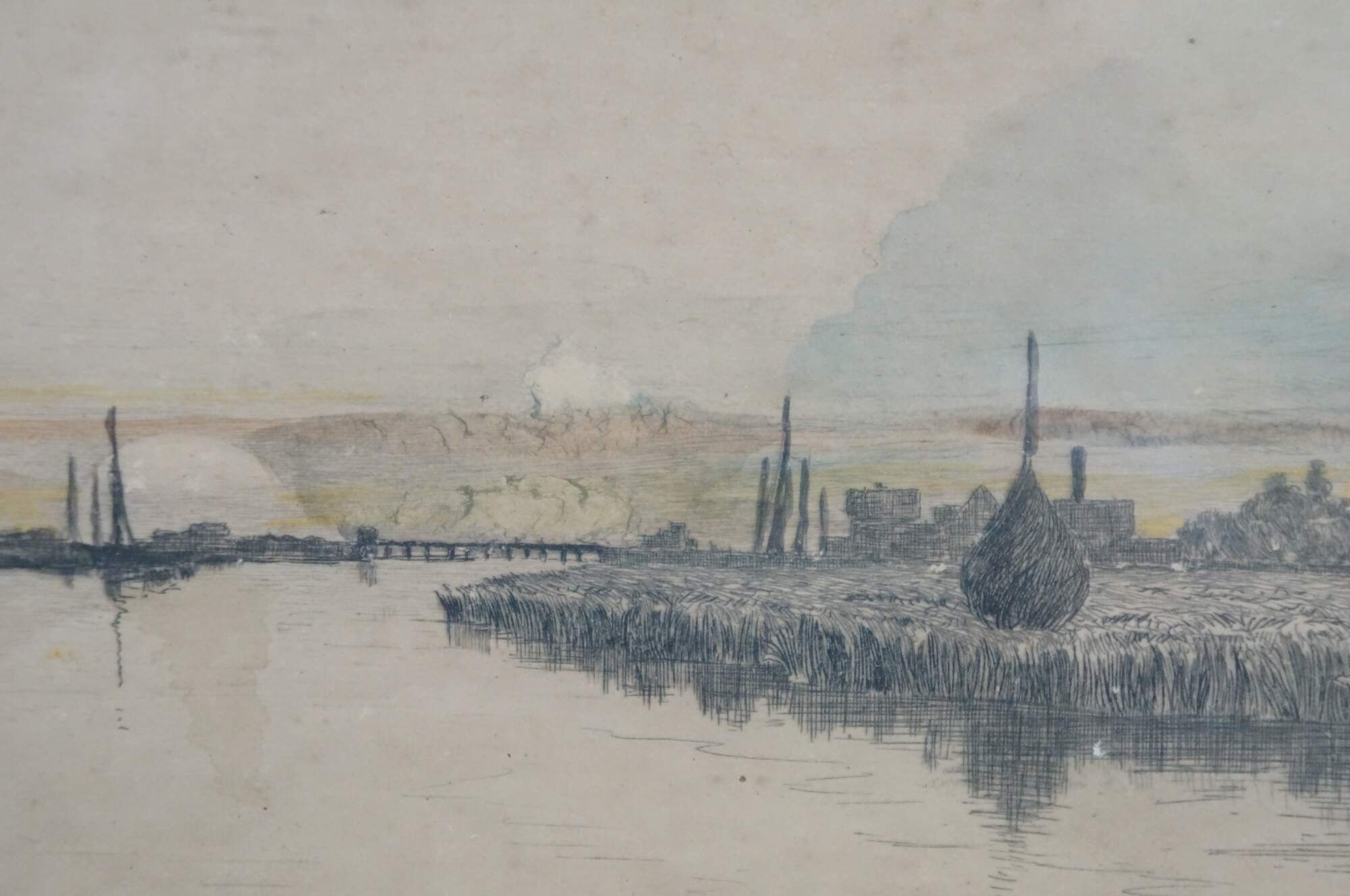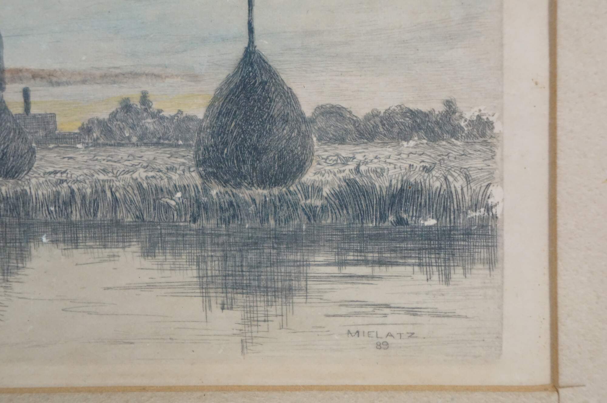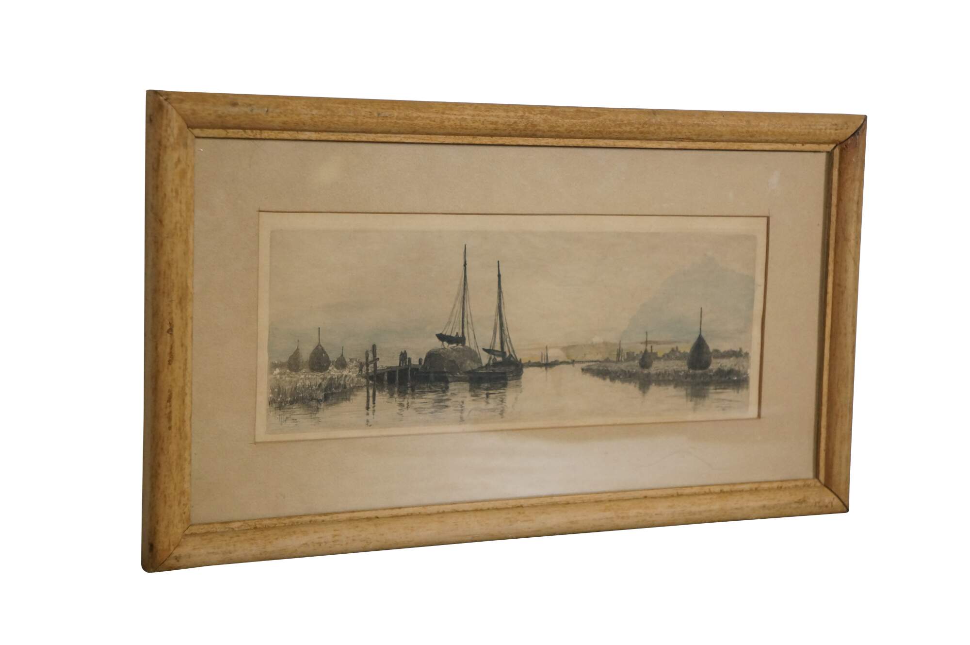Late 19th century hand colored etching by Charles Frederick Mielatz. Panoramic landscape / waterscape view of a river / causeway with boats. Signed in plate / dated 89. Unstained, rounded wood frame; beige mat.