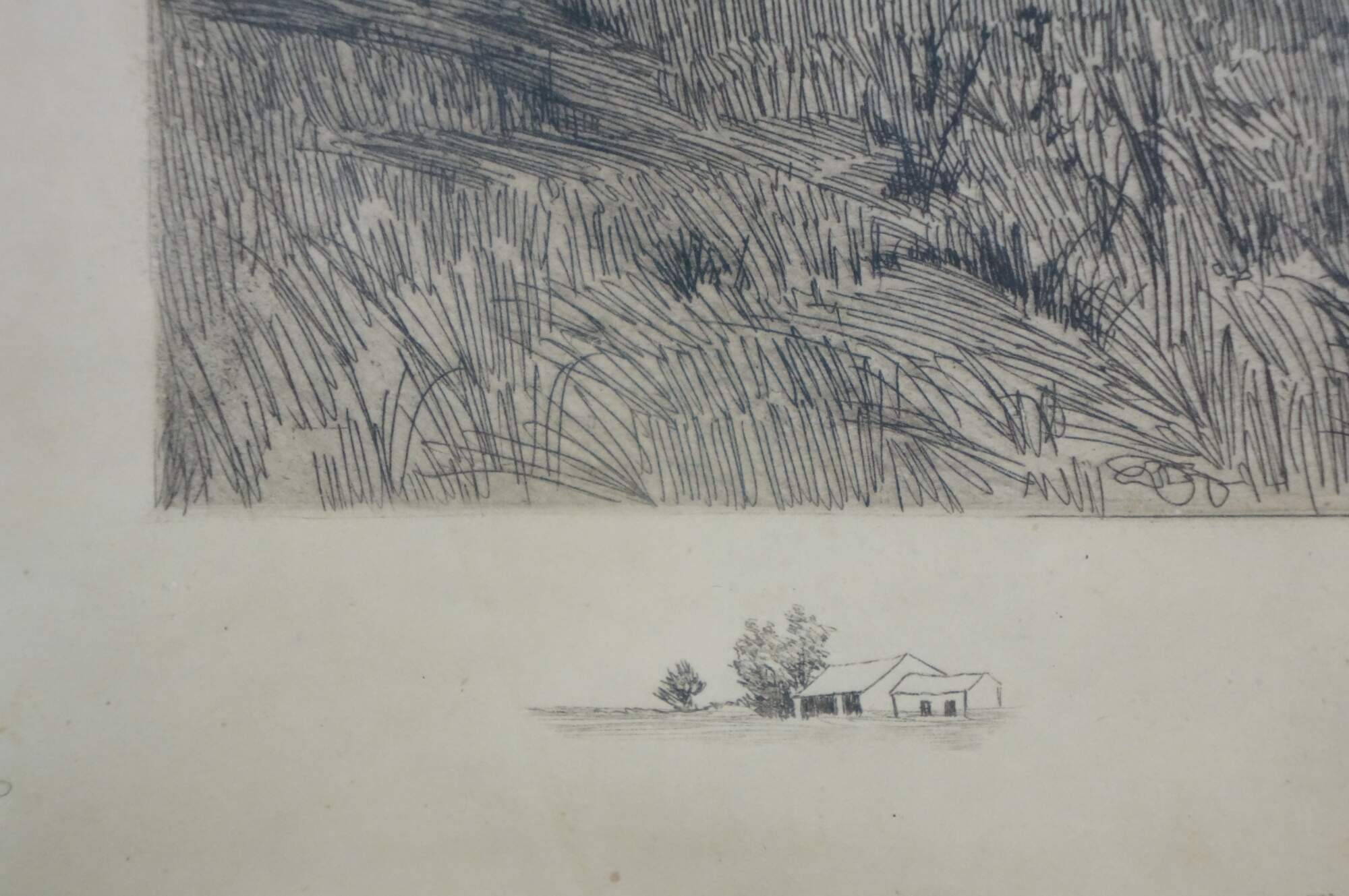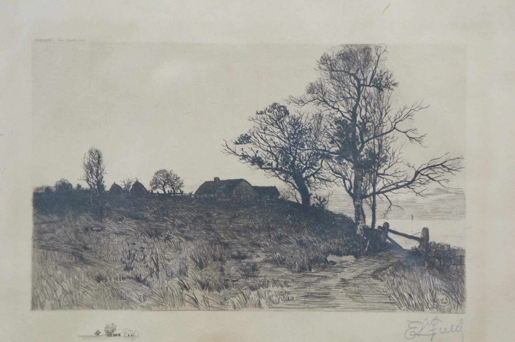 Late 19th century black and white etching by Edward Loyal Fields. Landscape showing a country lane and a house on a hill. Remarke of a farmhouse, lower left. Signed in plate, right. Pencil signed, lower right. Grooved white plastic over wood with gilt scallop shell trim; white mat.