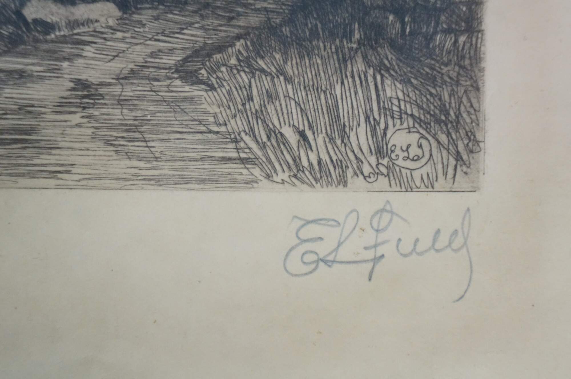 "Edward Loyal Fields (January 4, 1856 – March 22, 1914) (aka E. L. Field ; Edward L. Field ; E. Loyal Field ; Edward Field) was an American artist renowned for his rural landscape drawings and etchings. He utilized various mediums, including pen and ink, oil, watercolor, and graphite, and his primary techniques encompassed drawing, painting, and etching. Fields is especially noted for his idyllic depictions of towns, farmhouses, and landscapes. Edward Loyal Fields was born on January 4, 1856, in Galesburg, Knox, Illinois, to Loyal Case Field, a machinist, inventor, and manufacturer of machinery, and Clara Armeda (Davison) Field, a housewife. He grew up with three siblings—Frank Smith Field, Kate Elnora Field, and Carrie Luella Field—though the latter two sadly died in infancy. Fields spent the first part of his life in the Midwest, residing in Galesburg from 1856 to 1874, and briefly in 1880. In 1874, he relocated to Ithaca, New York, where he began studying at Cornell University. His formal art education started here and continued until 1878. Following this, Fields moved to Paris, France, to study at the esteemed Academie Julian under Charles Auguste Carolus Emile Duran, from 1878 to 1879. Duran’s influence was significant in shaping Fields’s artistic style and approach. Fields began to identify as a professional artist by 1880. His work, characterized by detailed rural landscape drawings and etchings, was recognized across the Midwest, East Coast, and Europe. Fields moved between various locations throughout his career. He resided in Paris from 1879 to 1882, in New York from 1885 to 1900, and again from 1905 to 1914, as well as in Delaware, New York from 1900 to 1905. Brief periods were also spent in Boston, Halifax, London, Nutley, and Delaware. Throughout his career, Fields exhibited his work with prestigious art establishments, including the Salmagundi in New York, National Academy of Design in New York, Pennsylvania Academy of the Fine Arts in Philadelphia, Carnegie in Pittsburgh, and Chicago Art Institute. Fields was a resident artist member at Salmagundi from 1899 until his death in 1914, where his work was highly praised, winning the Inness prize in 1904 and the Shaw prize in 1905. Fields married Flora (Stark) Field on November 9, 1891, in Bloomsbury, England. They had one daughter, Catherine Field, who was born in Nutley, New Jersey, in 1892. Fields died on March 22, 1914, in New York, New York, from pneumonia. He was 58 years old. His legacy continues to influence and inspire artists and art enthusiasts worldwide, serving as a testament to his exceptional talent and passion for rural landscape artistry." (Source: Salmagundi)