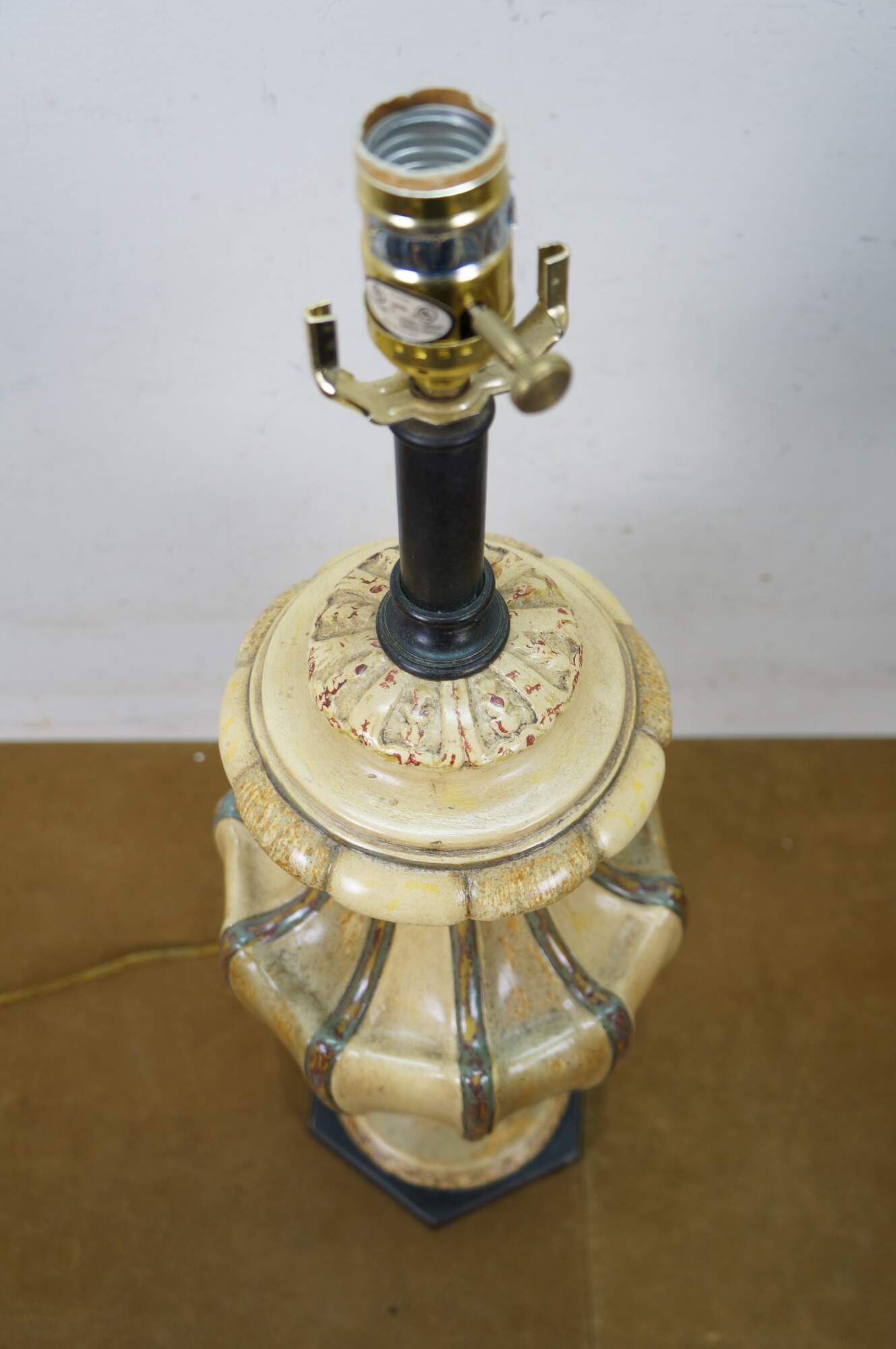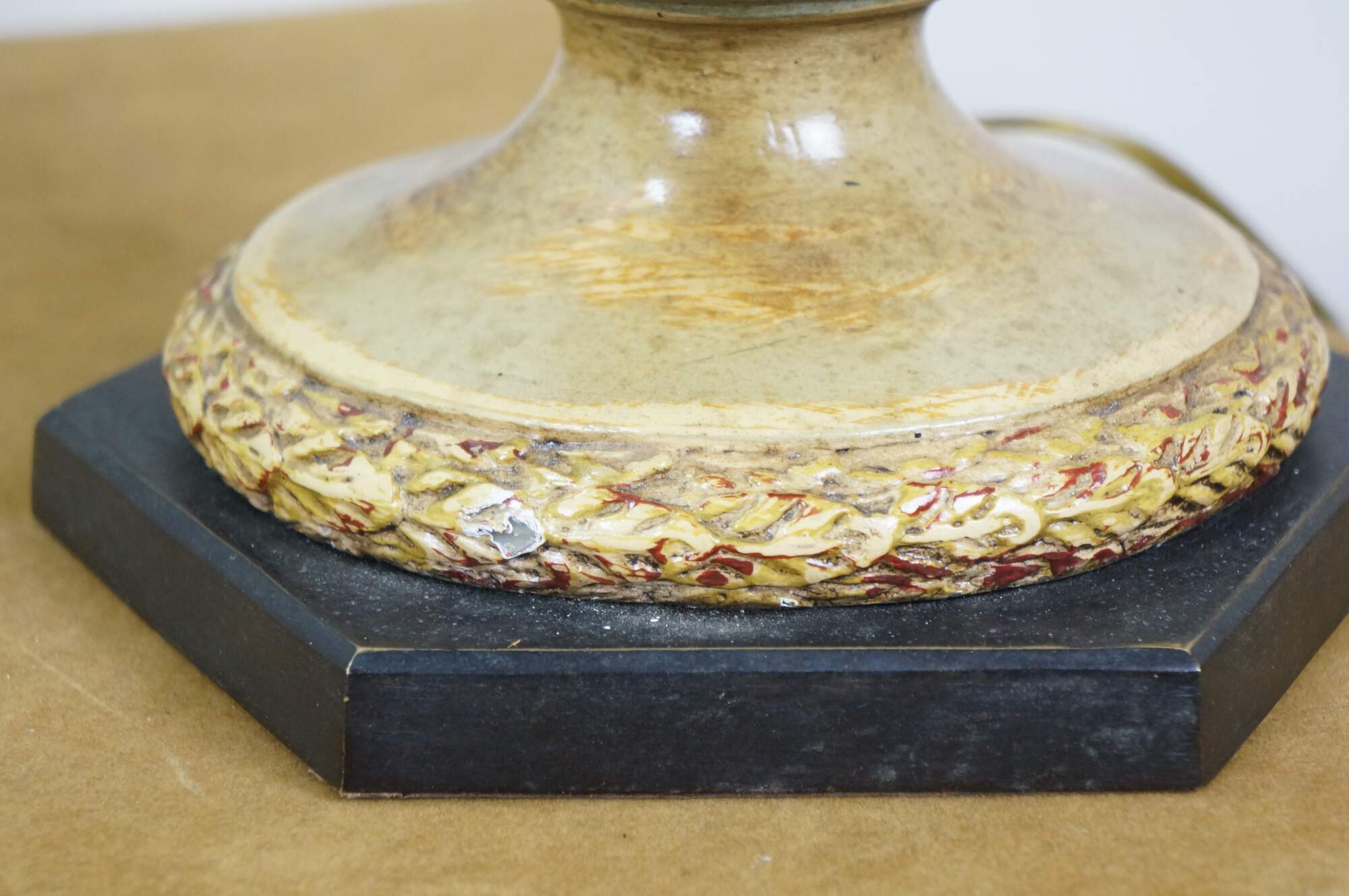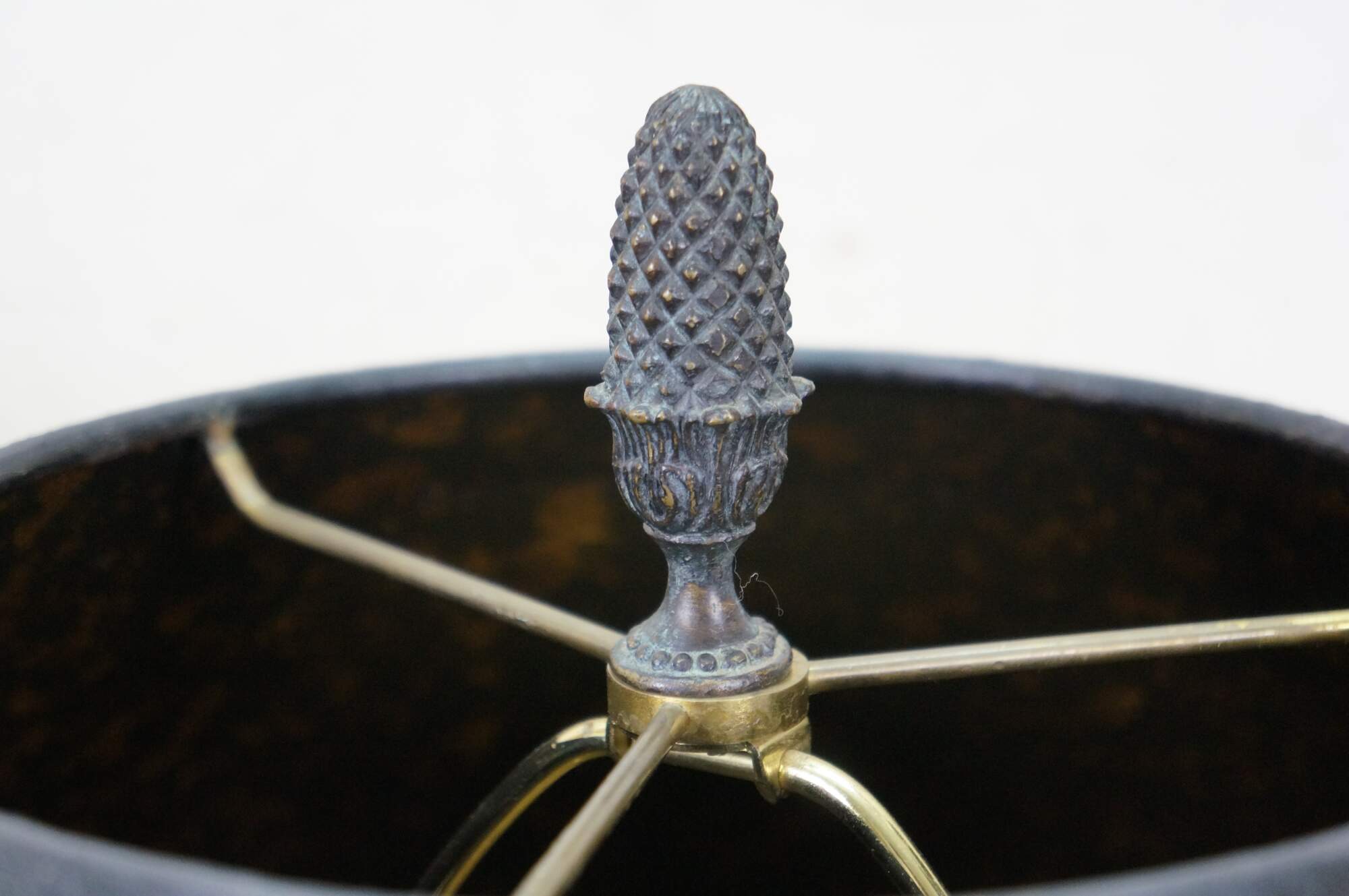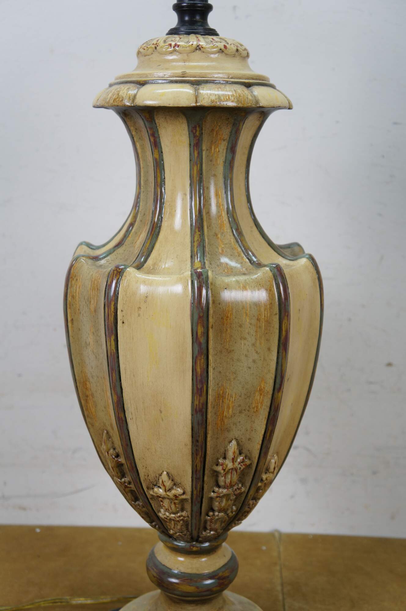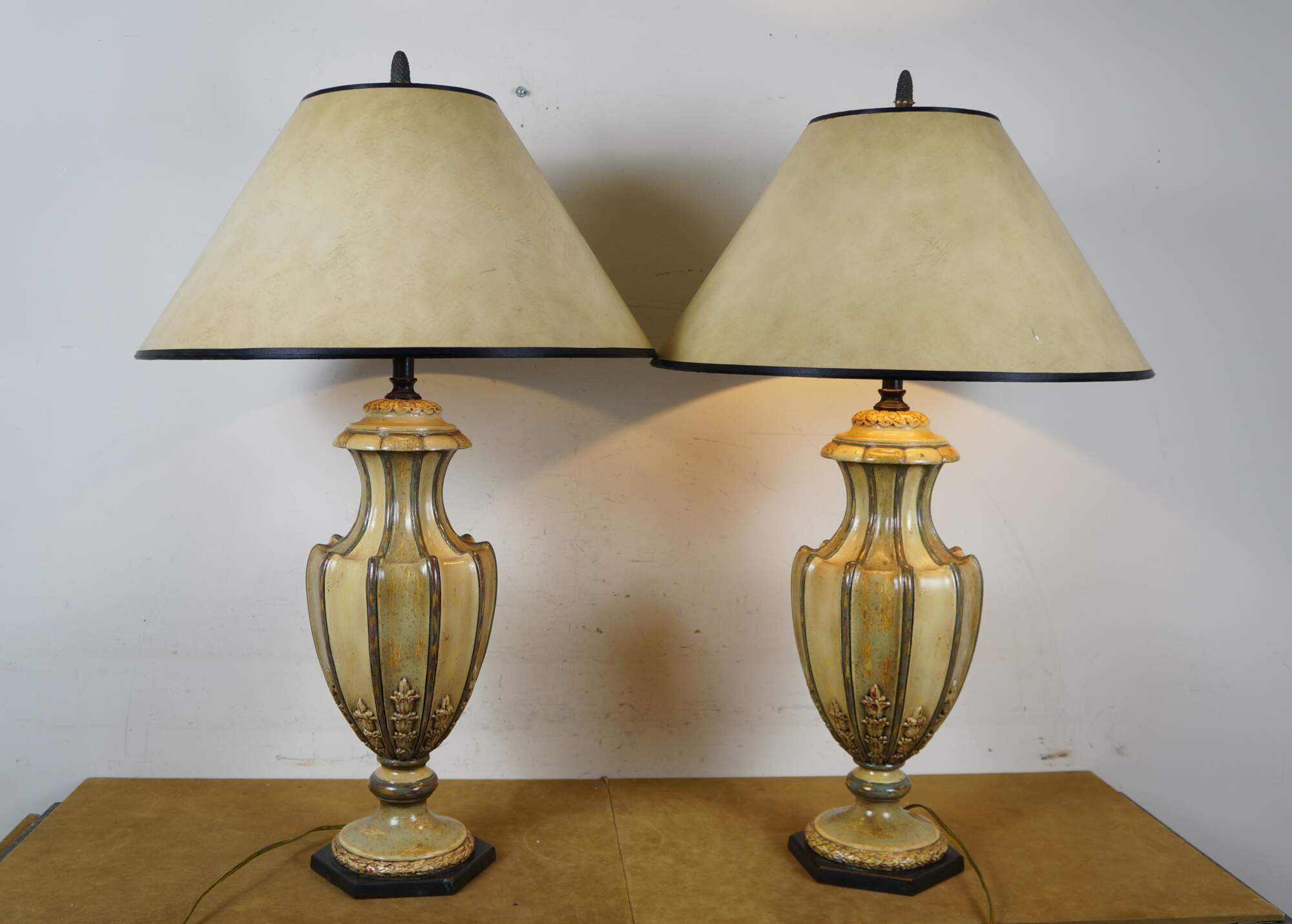 Pair of late 20th to early 21st century resin vase / urn shaped table lamps. Neoclassically inspired styling twith a painted antiqued finish and ancanthus leaf details, set on hexagonal wood bases. Includes harps, pineapple shaped bronze finials and beige paper shades with foild interiors.