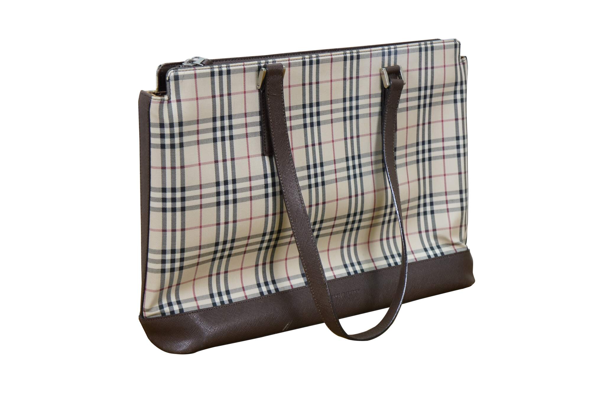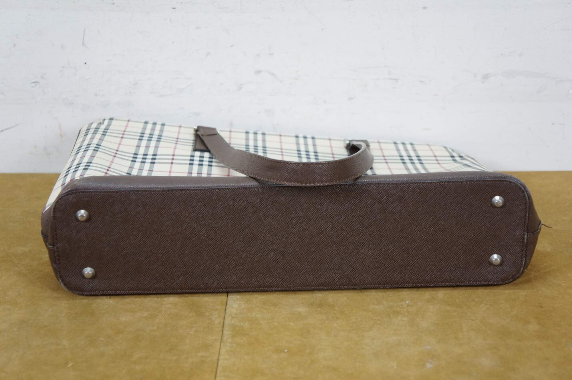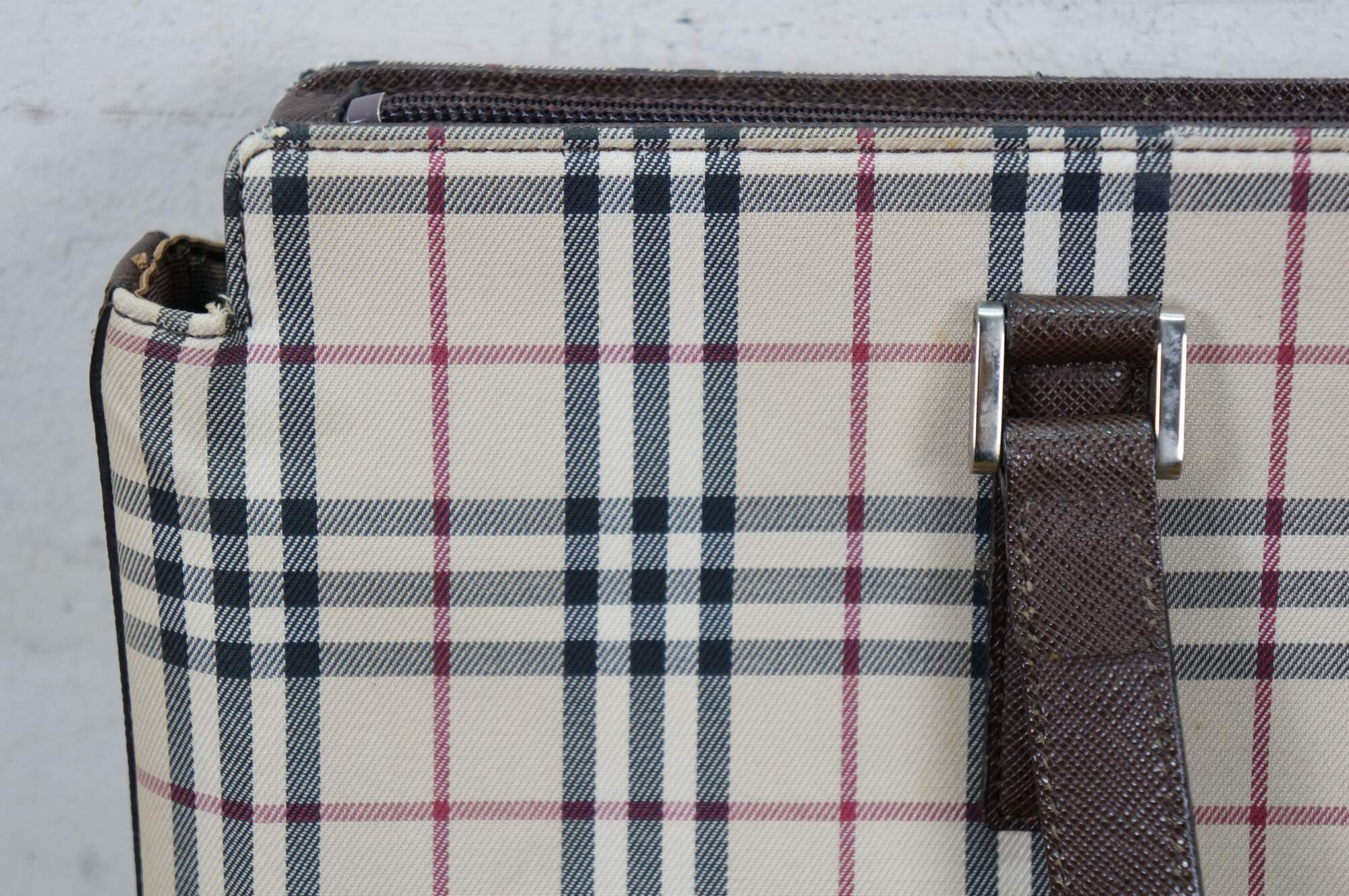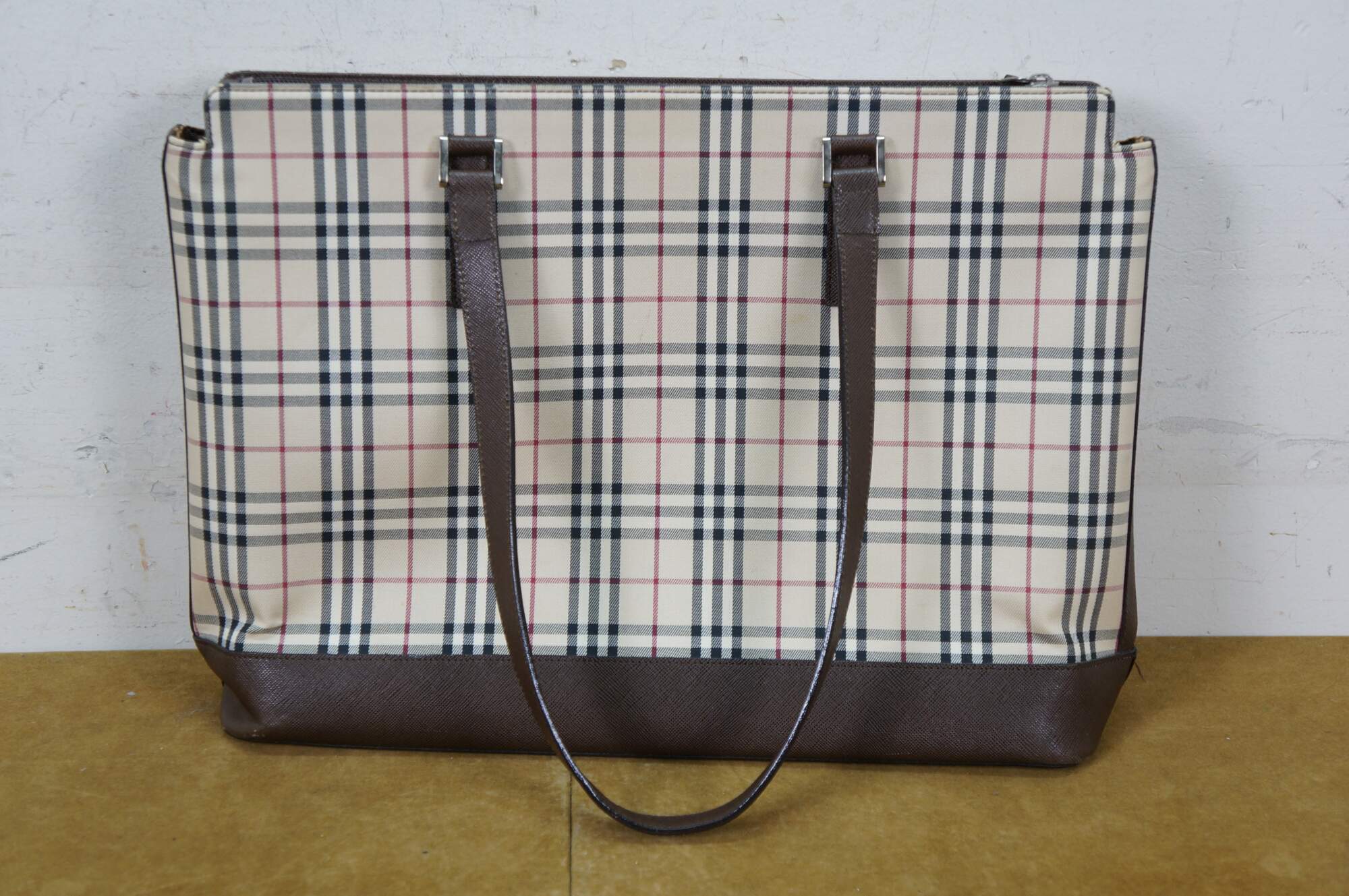Vintage Burberry tote bag / purse in beige Nova check coated canvas with dark brown leather base, trim and double handles. Silver tone feet on base. Two large slip pockets flanking center compartment with zipper closure. Two interior slip pockets and one interior zippered pocket. Brown fabric lining.