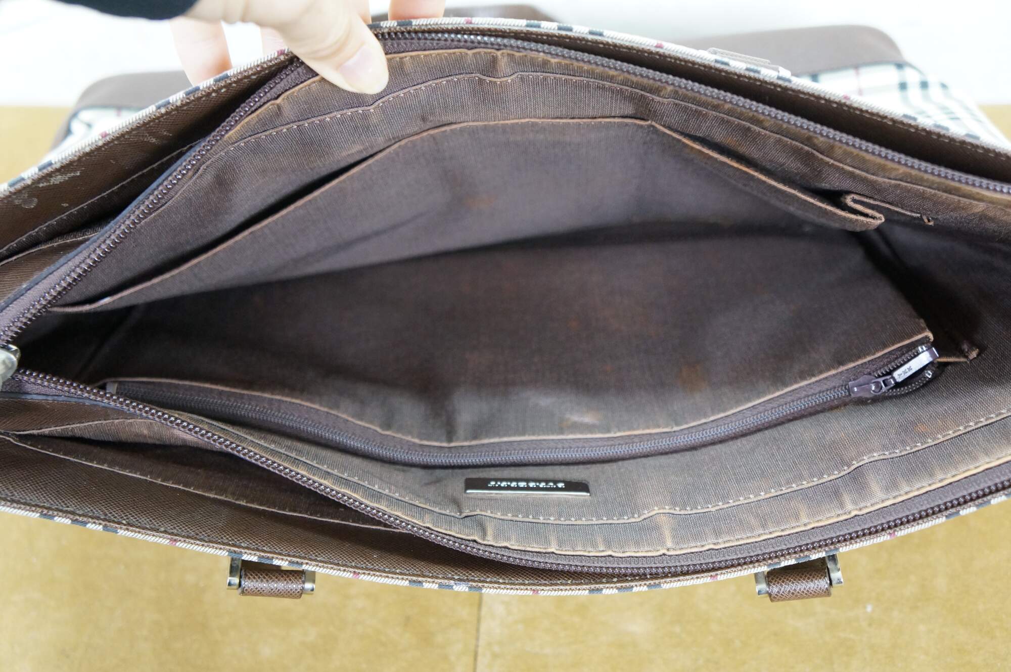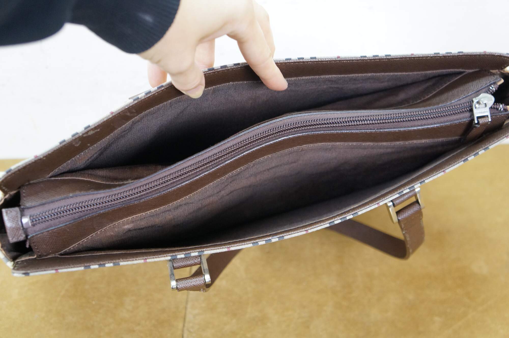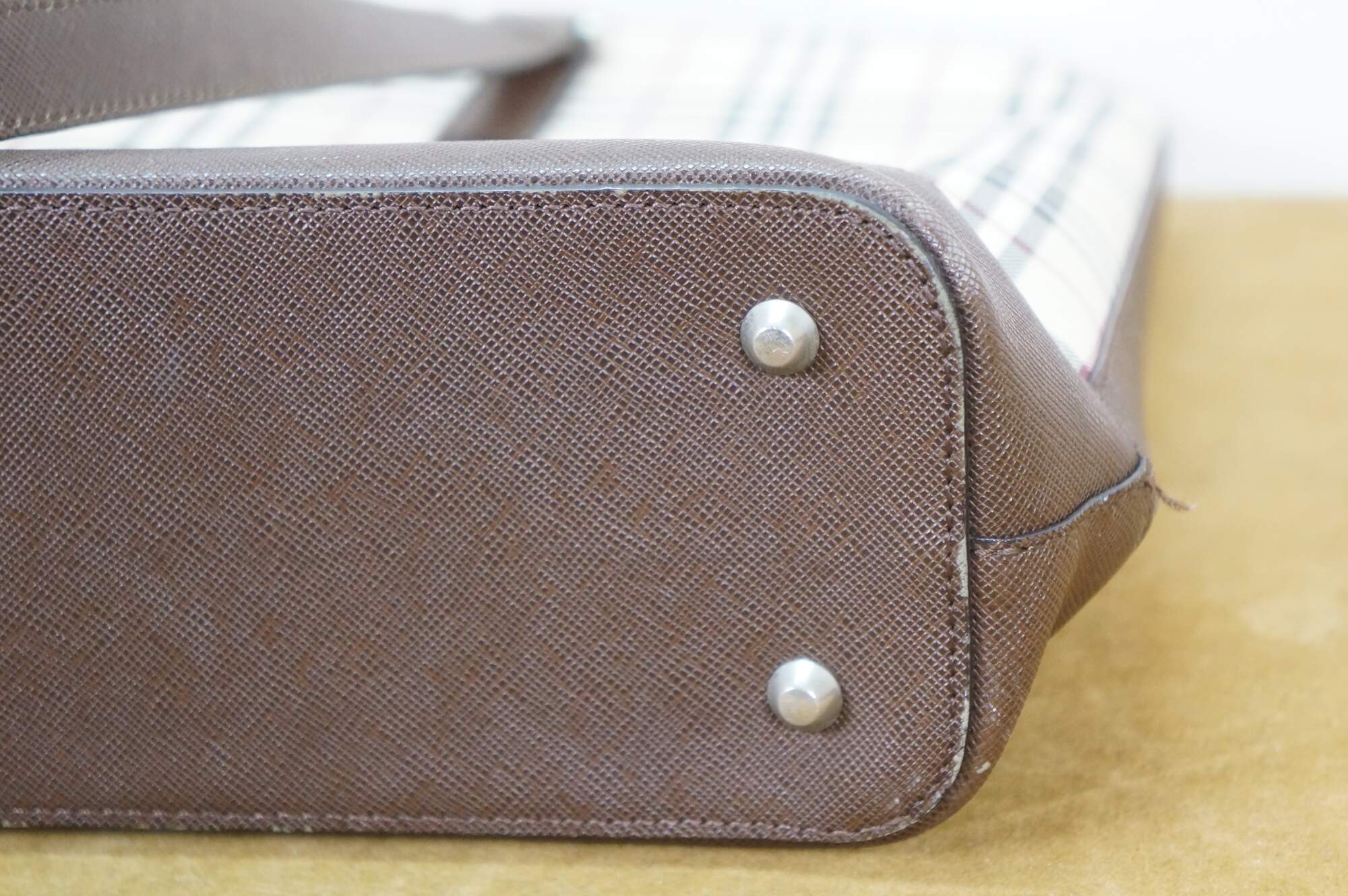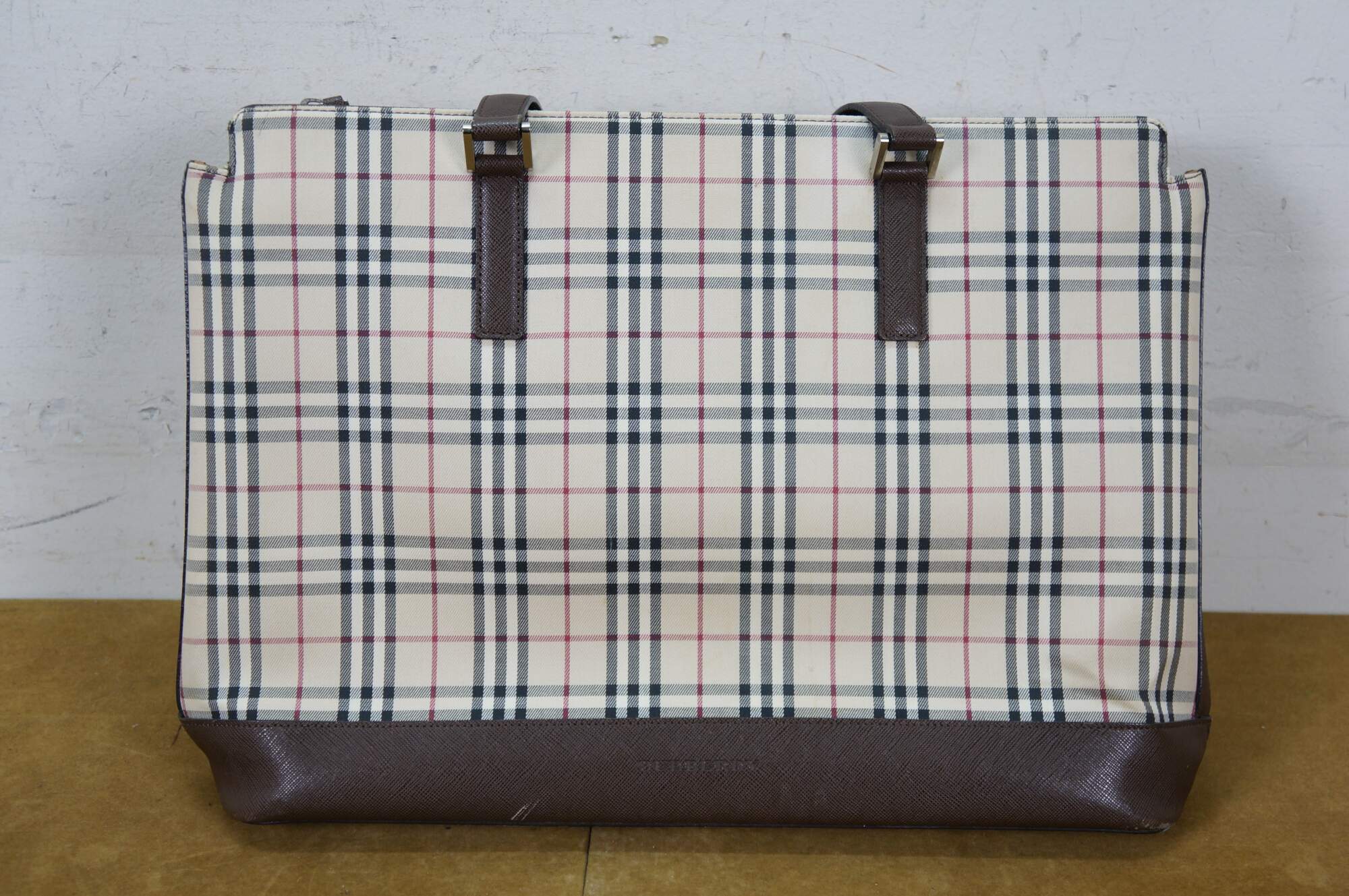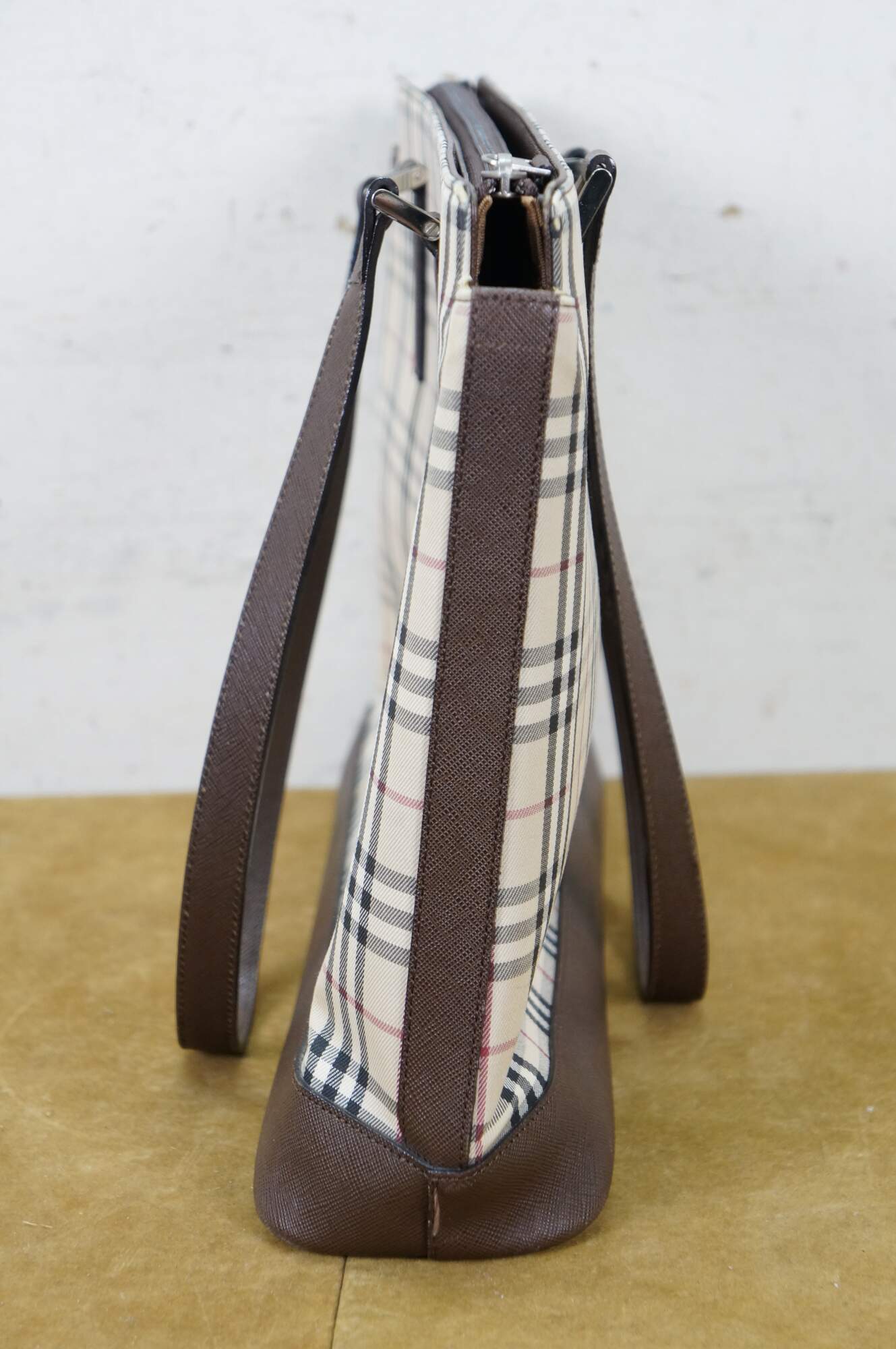 Vintage Burberry tote bag / purse in beige Nova check coated canvas with dark brown leather base, trim and double handles. Silver tone feet on base. Two large slip pockets flanking center compartment with zipper closure. Two interior slip pockets and one interior zippered pocket. Brown fabric lining.