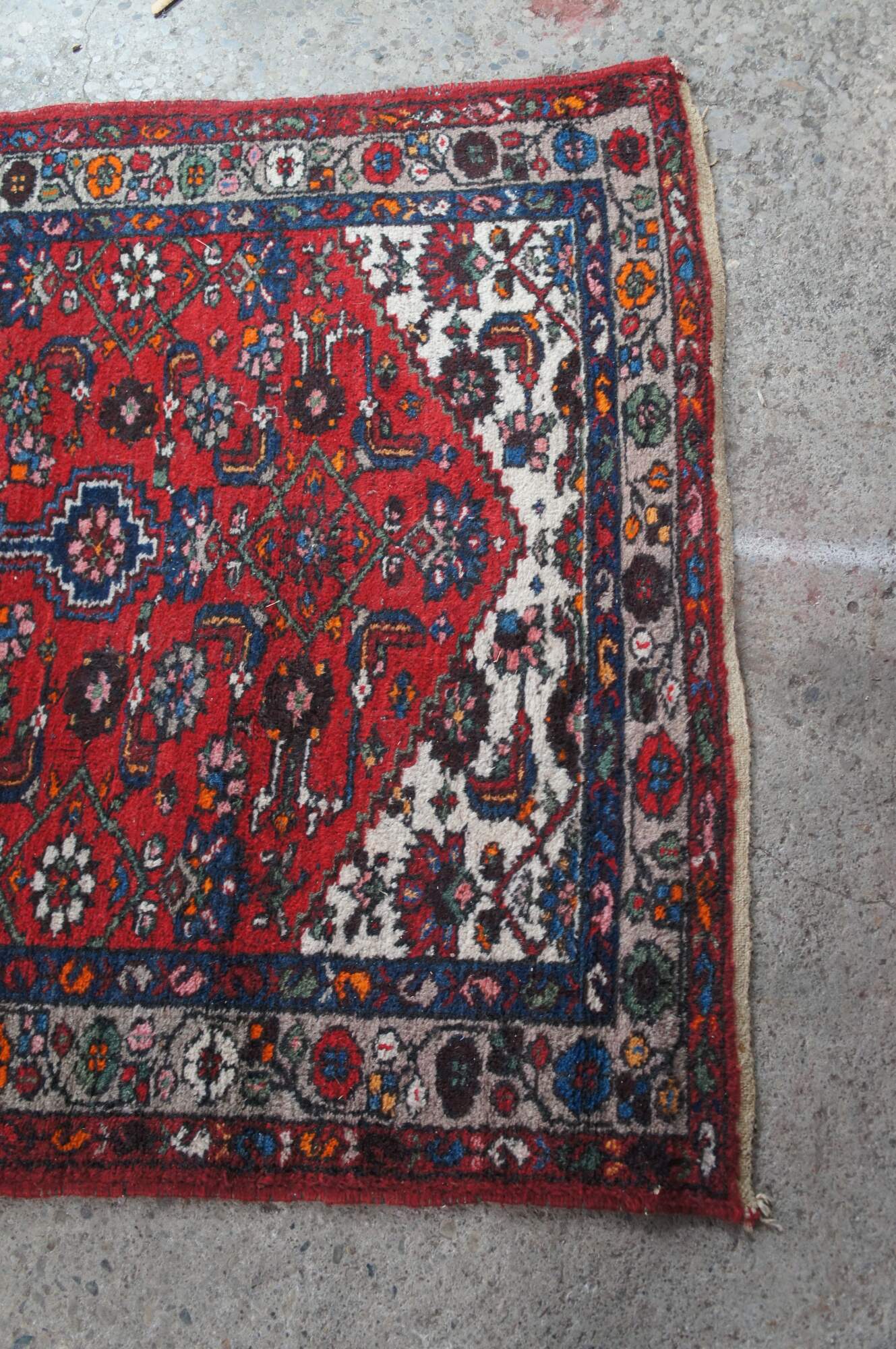 An oriental area rug or carpet, circa 1980s. Features a red foreground with geometric medallion and foliate fetail. Features shades of blue, green, orange and beige