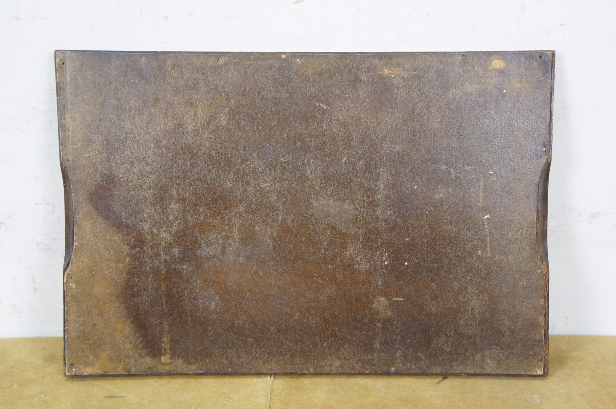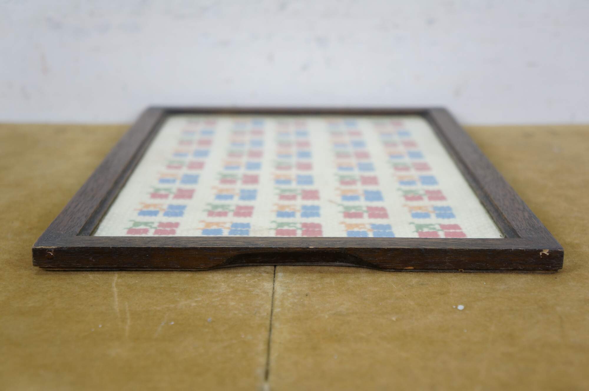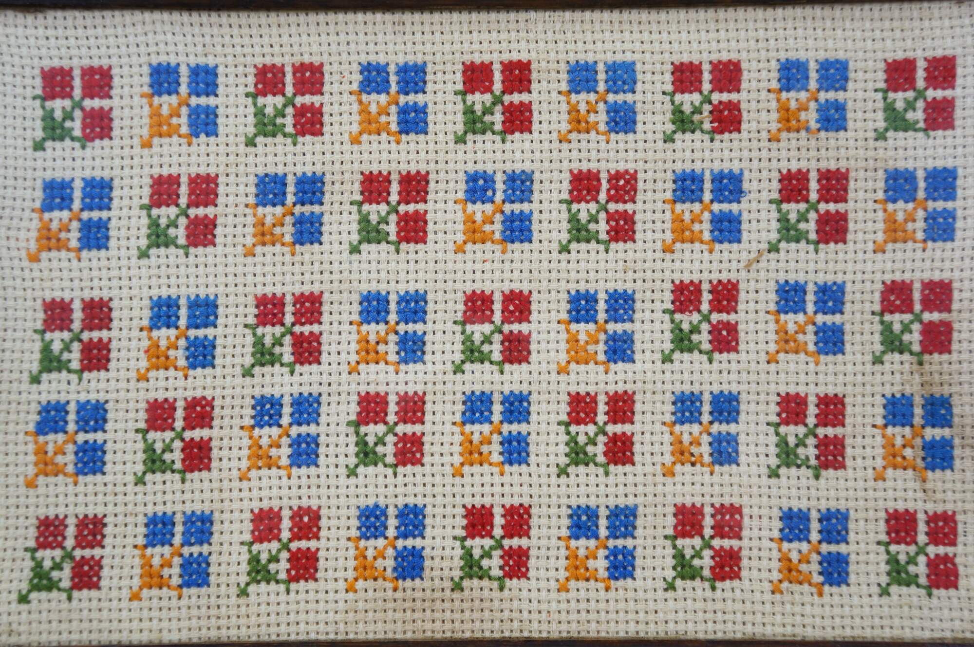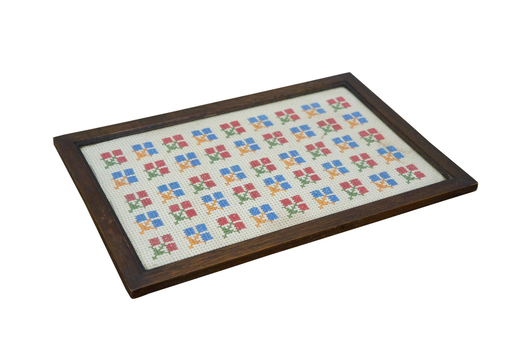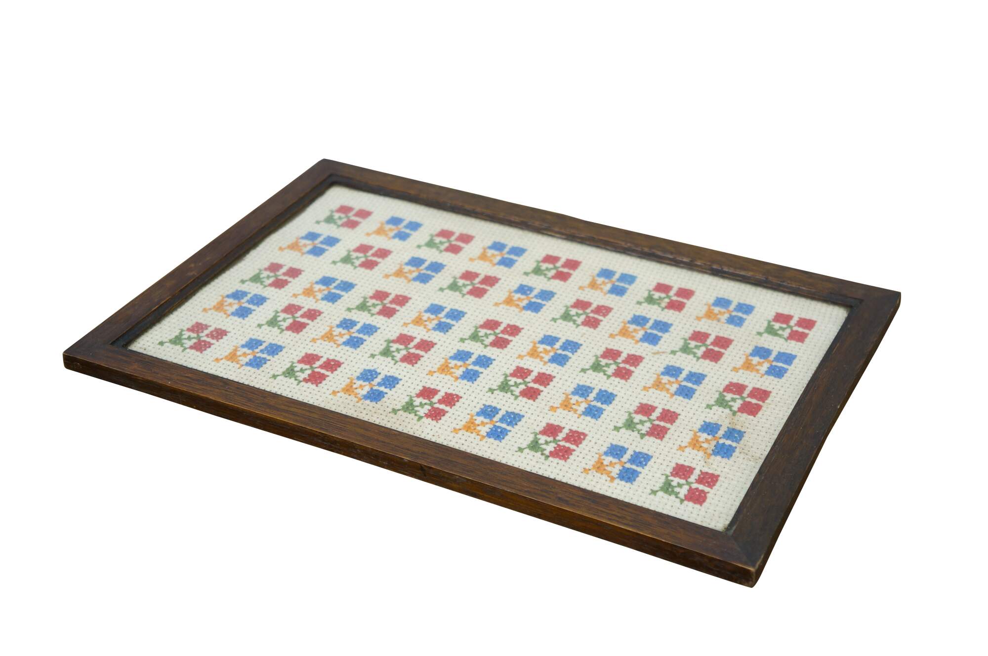 Antique oak folk art vanity tray, inset with a cross stitch fabric under glass decorated with a repeating pattern of red and blue flowers.
