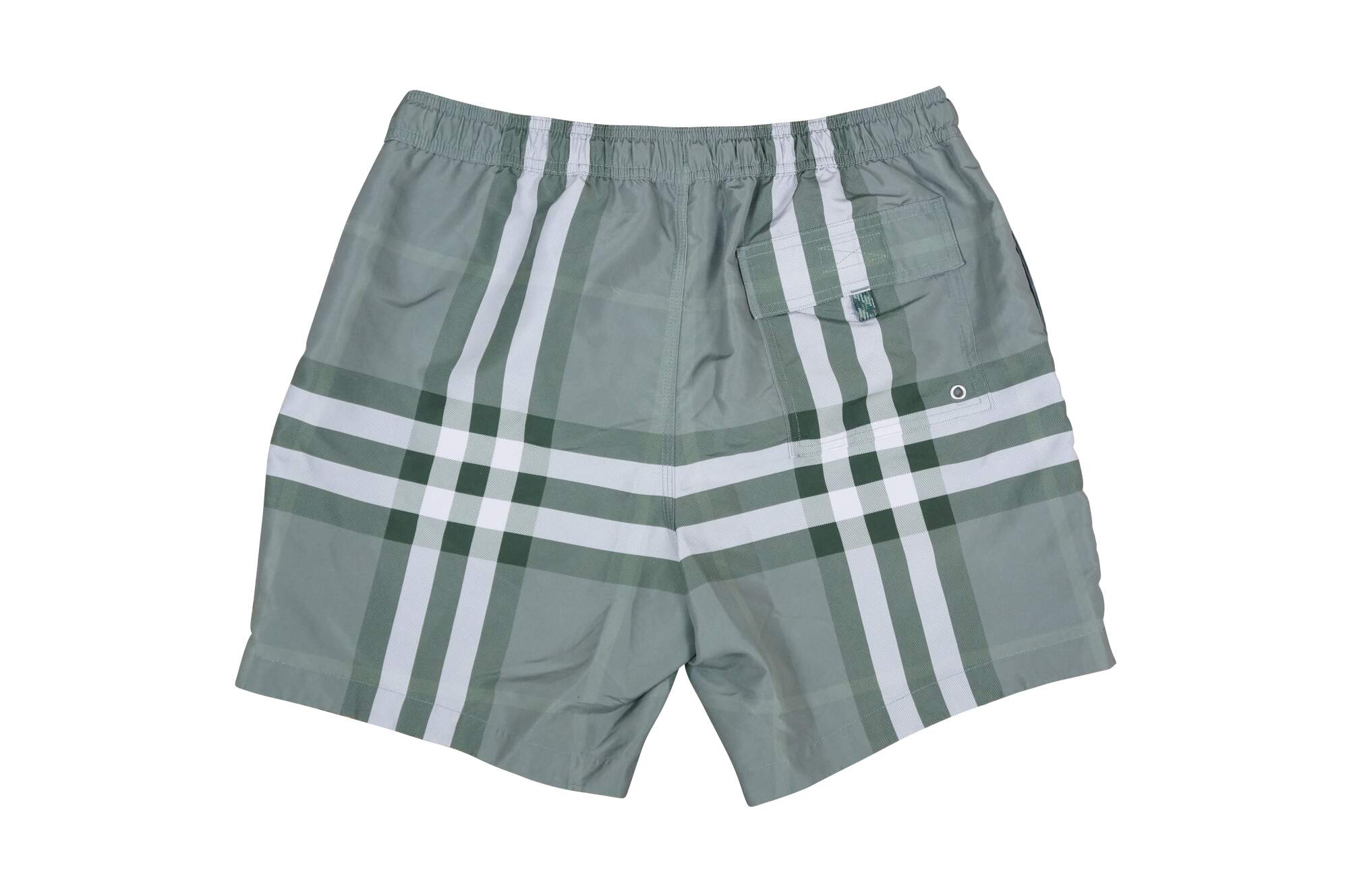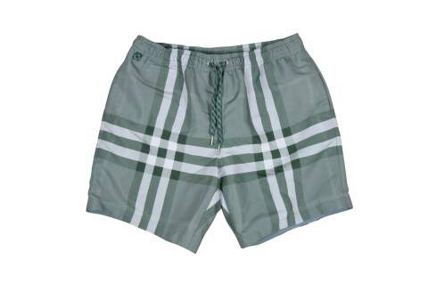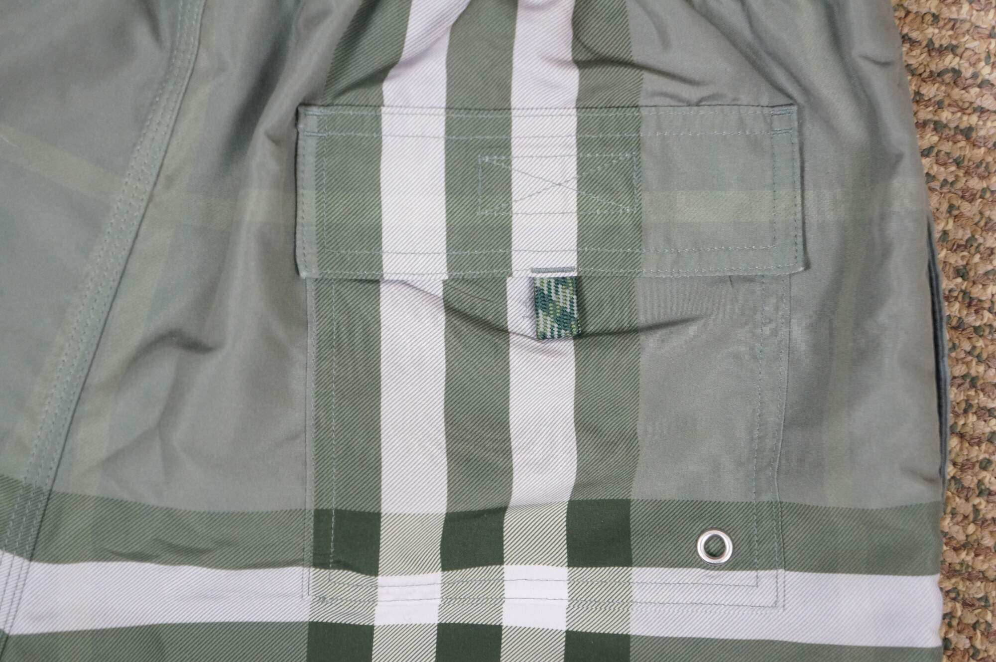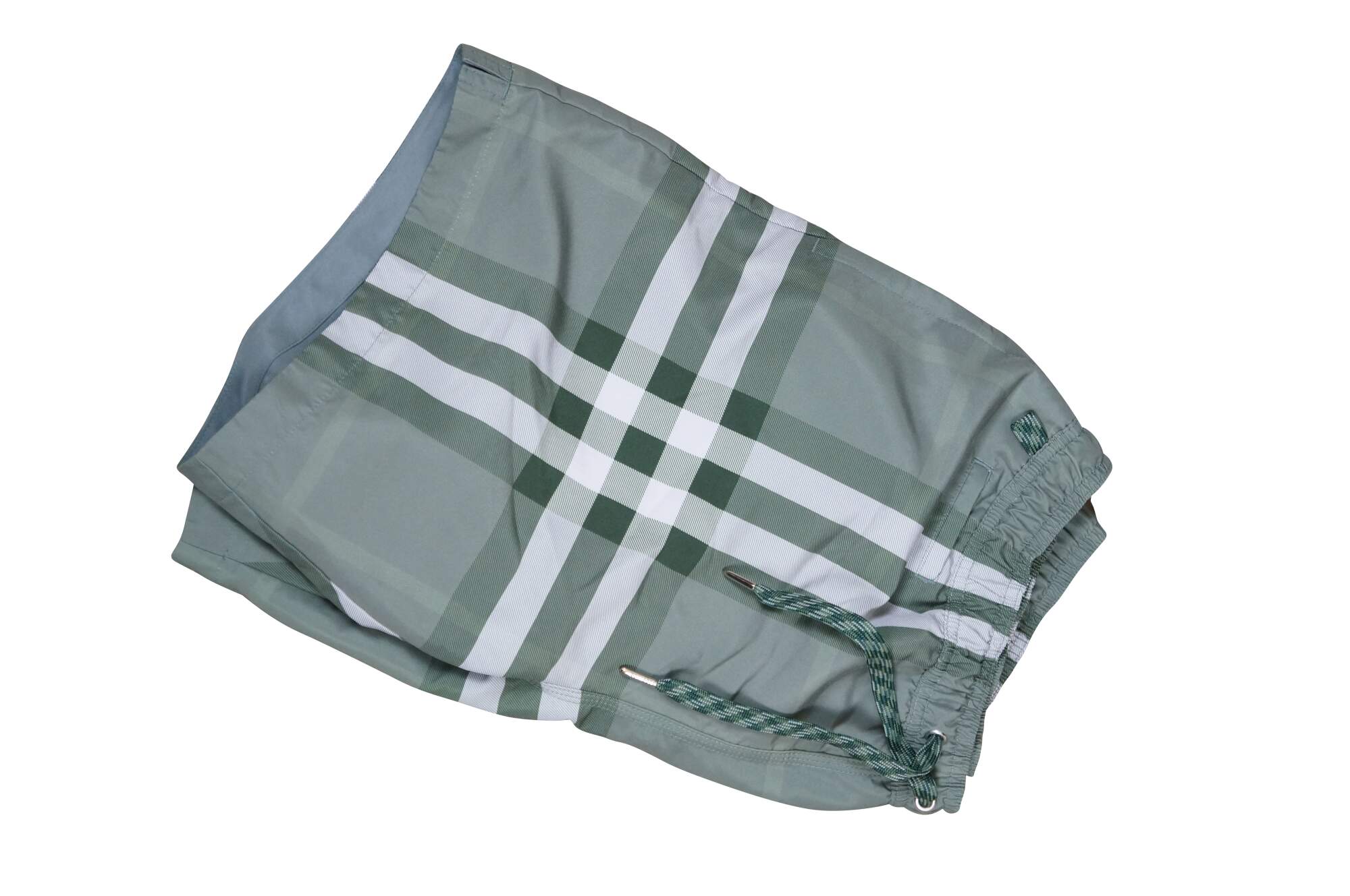 Vintage Burberry London England men's sage green plaid swim shorts / swim trunks. Two front side pockets; key loop; right hand watch pocket. One velcro flap back pocket. Elastic and drawstring waist. Mesh lining. Made in Thailand.