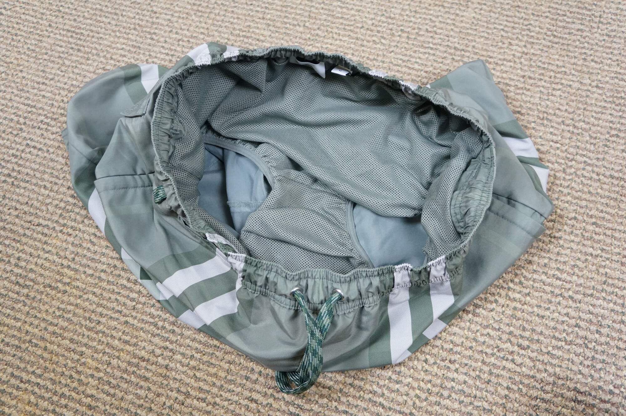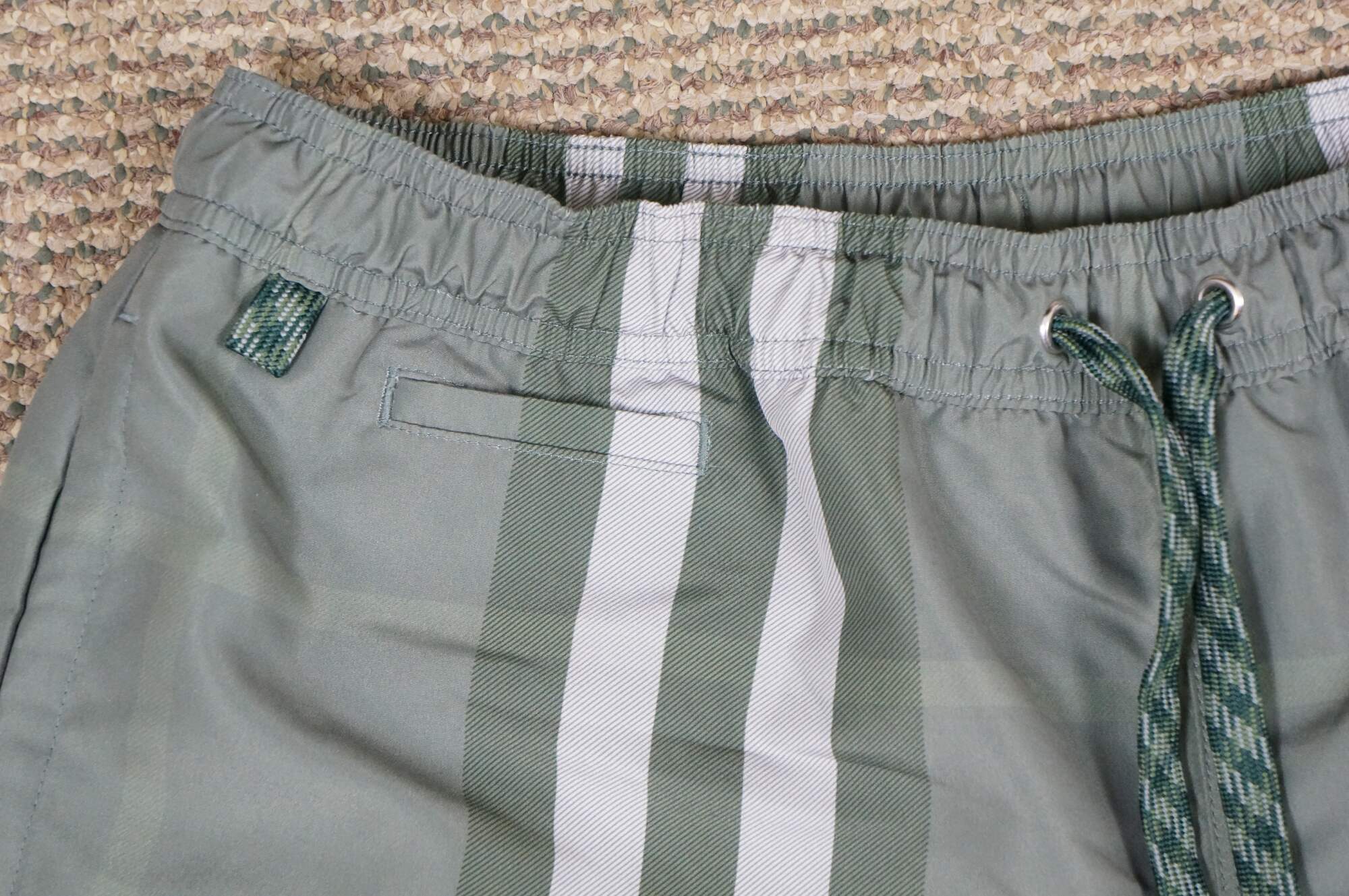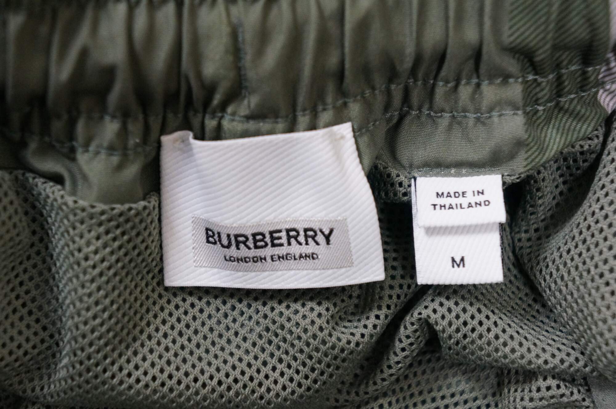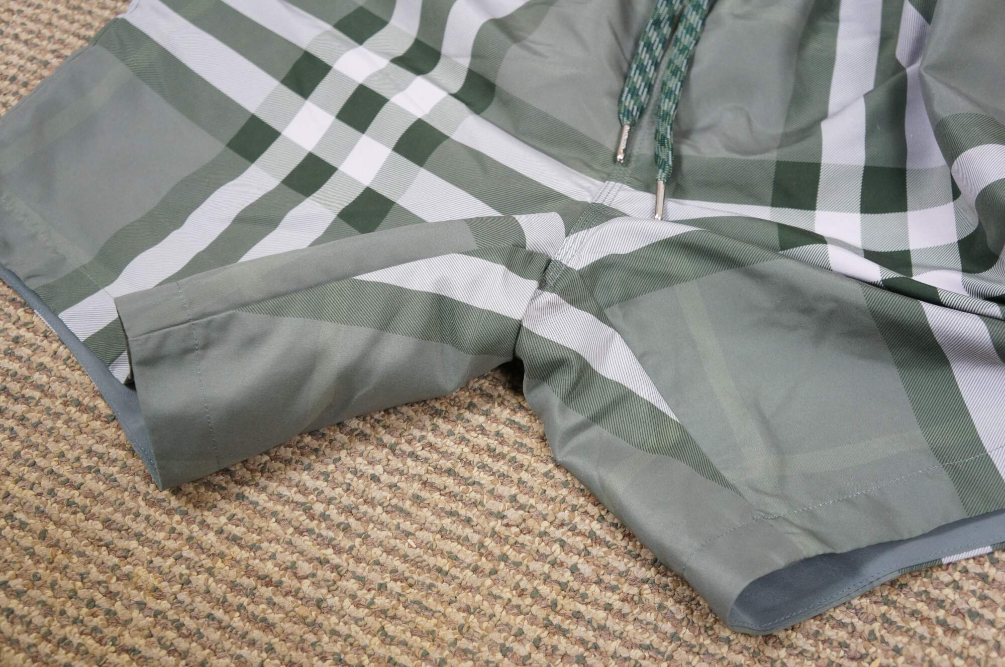Vintage Burberry London England men's sage green plaid swim shorts / swim trunks. Two front side pockets; key loop; right hand watch pocket. One velcro flap back pocket. Elastic and drawstring waist. Mesh lining. Made in Thailand.