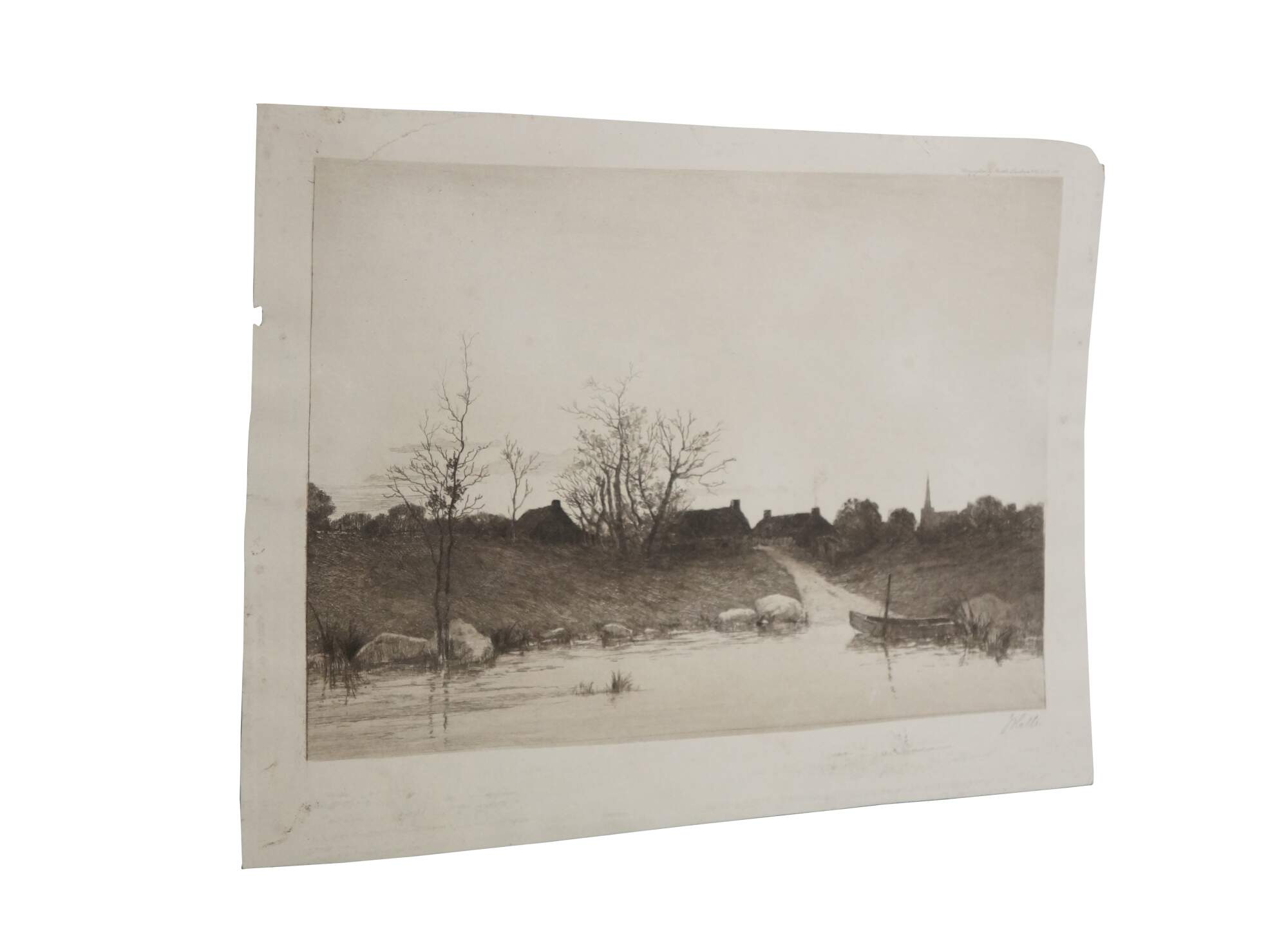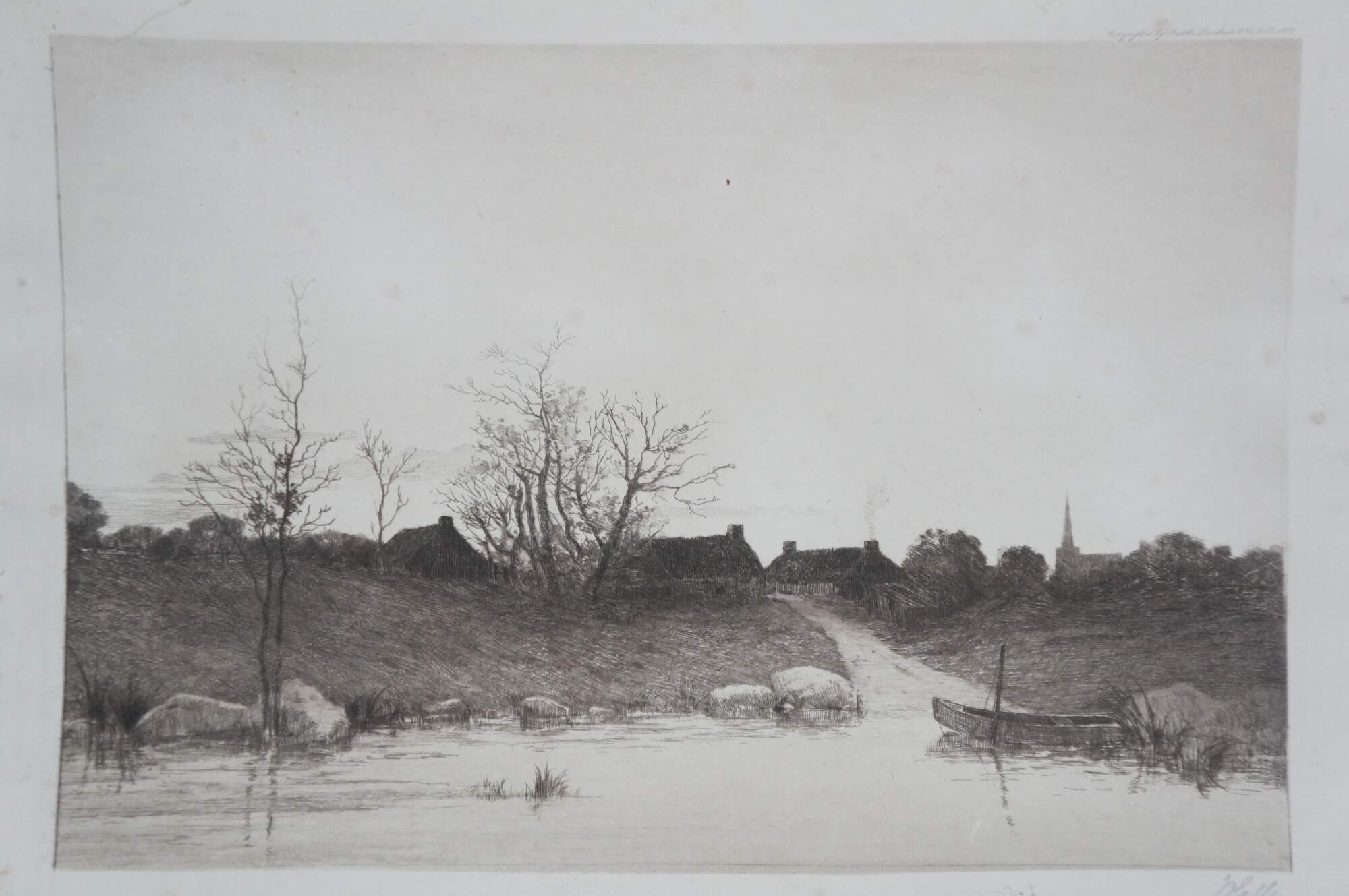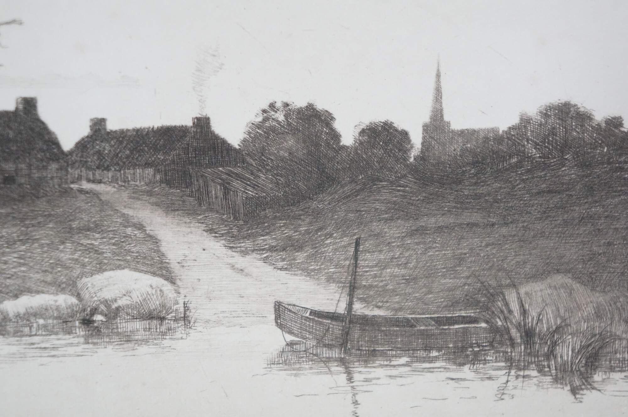 Late 19th century black and white etching by Alfred J. Haller. Water front landscape showing a small boat at the end of a road that leads up to a small village of thatched cottages. Copyrighted by Radtke, Lauckner & Co, NY, 1889. Remarke of a small landscape, lower edge. Pencil signed, lower right. Paper, Unframed.