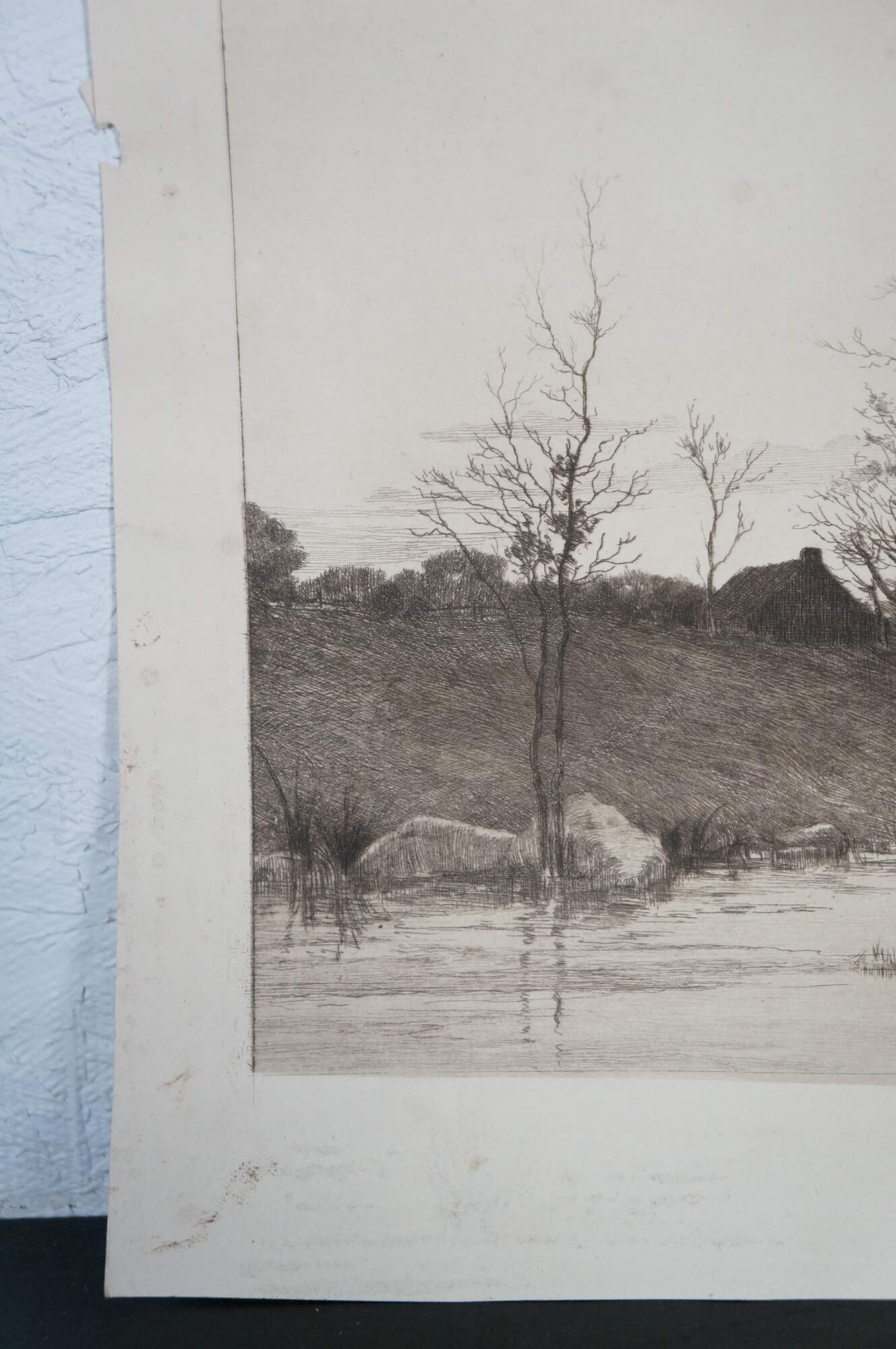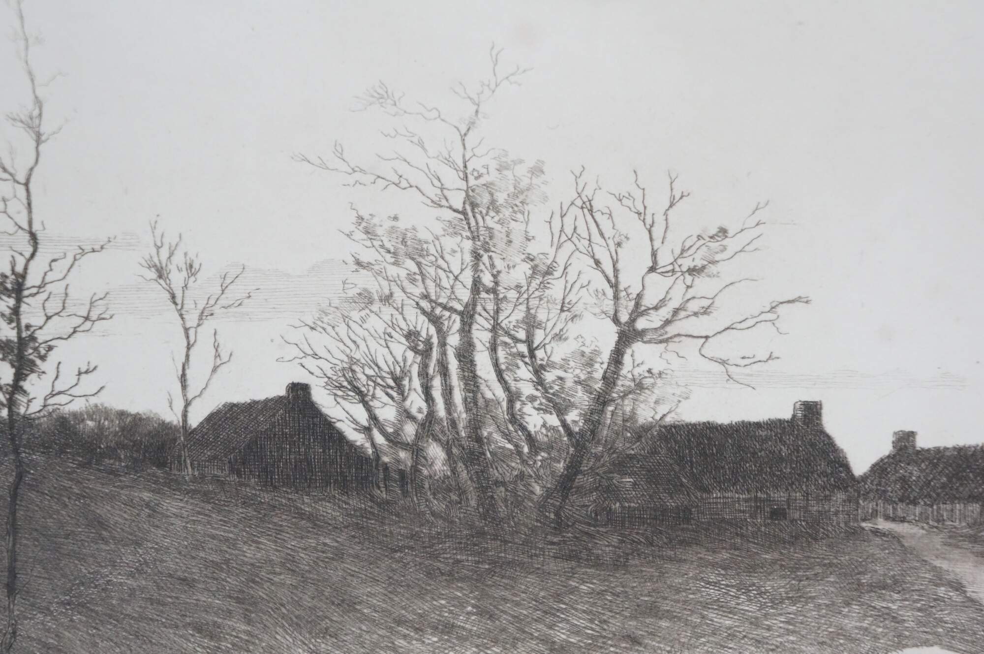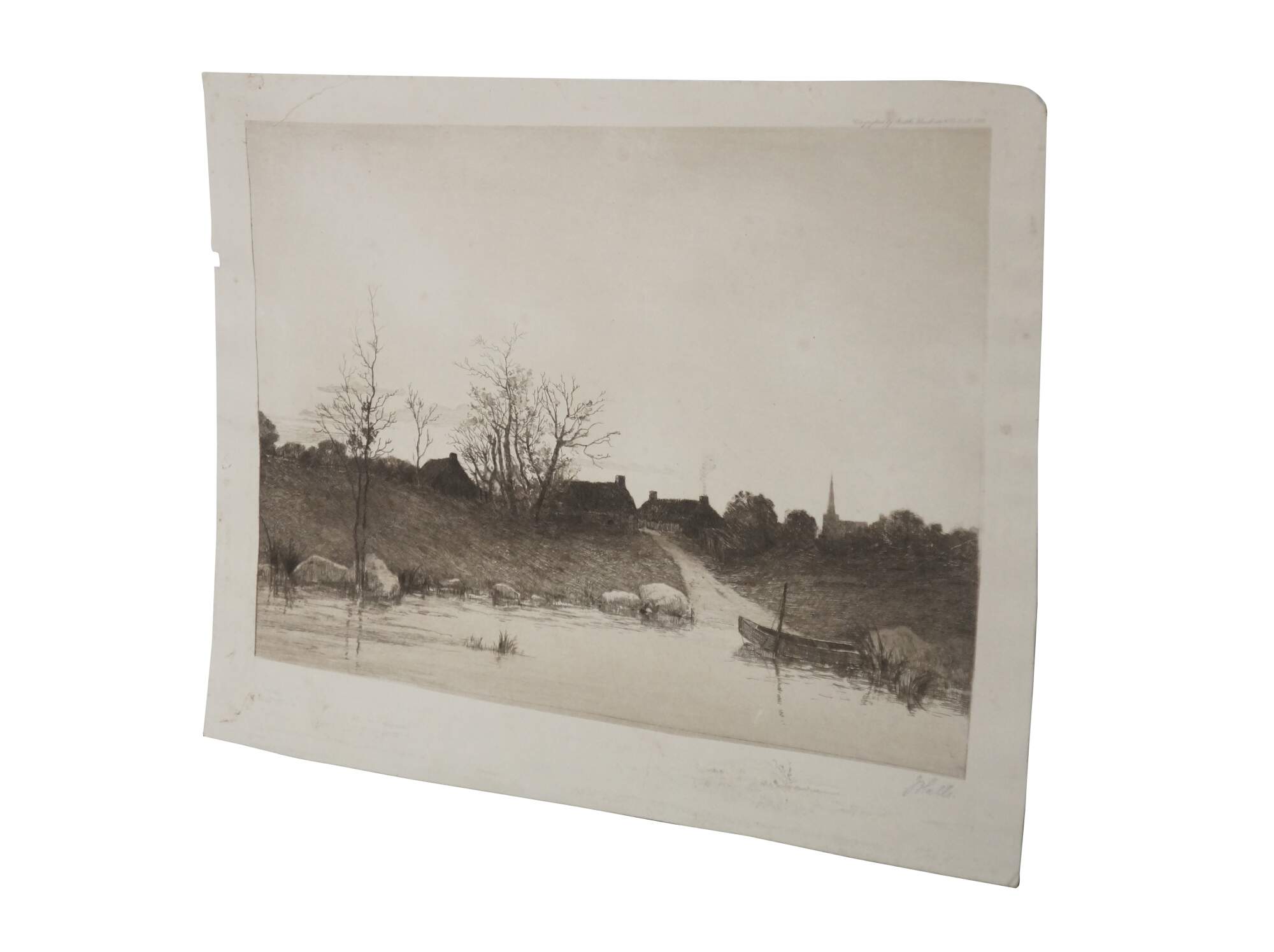 Late 19th century black and white etching by Alfred J. Haller. Water front landscape showing a small boat at the end of a road that leads up to a small village of thatched cottages. Copyrighted by Radtke, Lauckner & Co, NY, 1889. Remarke of a small landscape, lower edge. Pencil signed, lower right. Paper, Unframed.