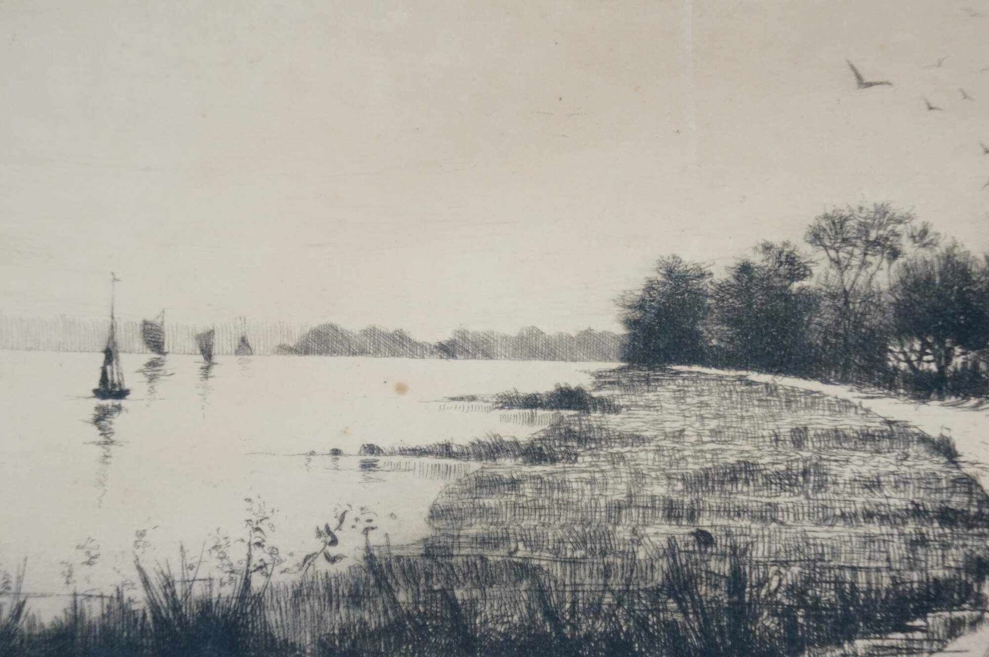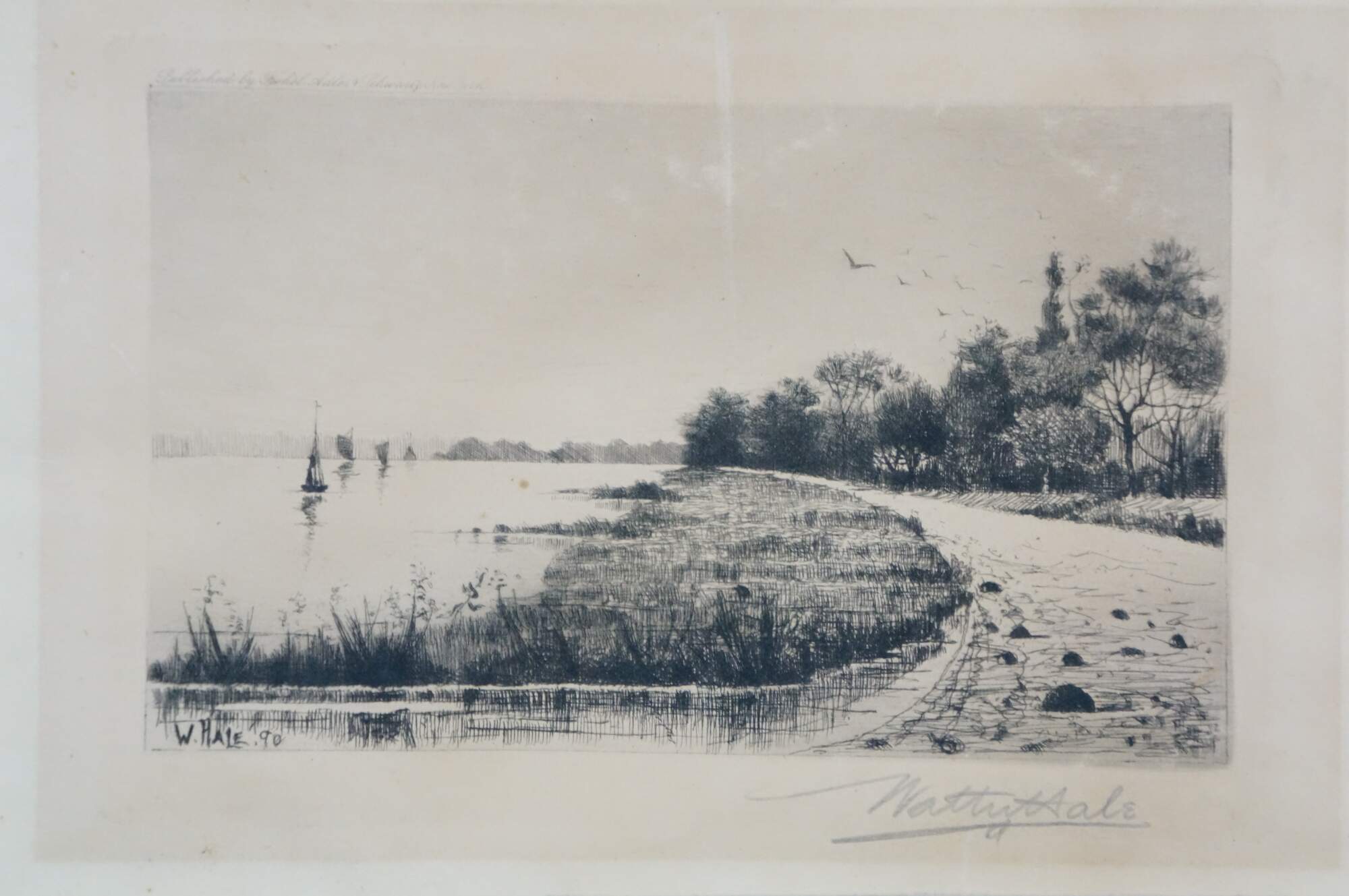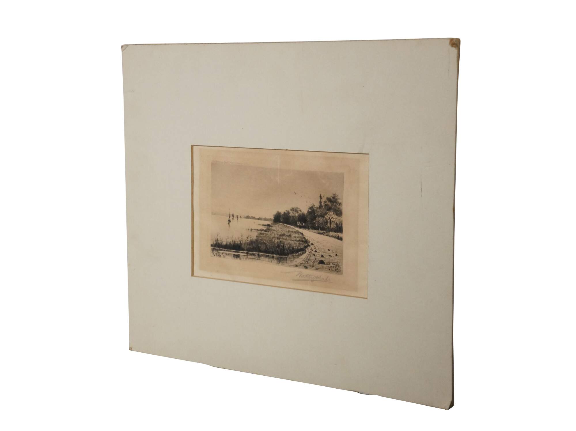 Late 19th century black and white etching by Walter Hale. Landscape showing a tree lined road curving along the edge of a body of water dotted with sail boats. Pencil signed, lower right. Signed in plate; dated 90. Published by Fishel, Adler & Schwartz, New York. Paper in white cardstock mat; unframed.