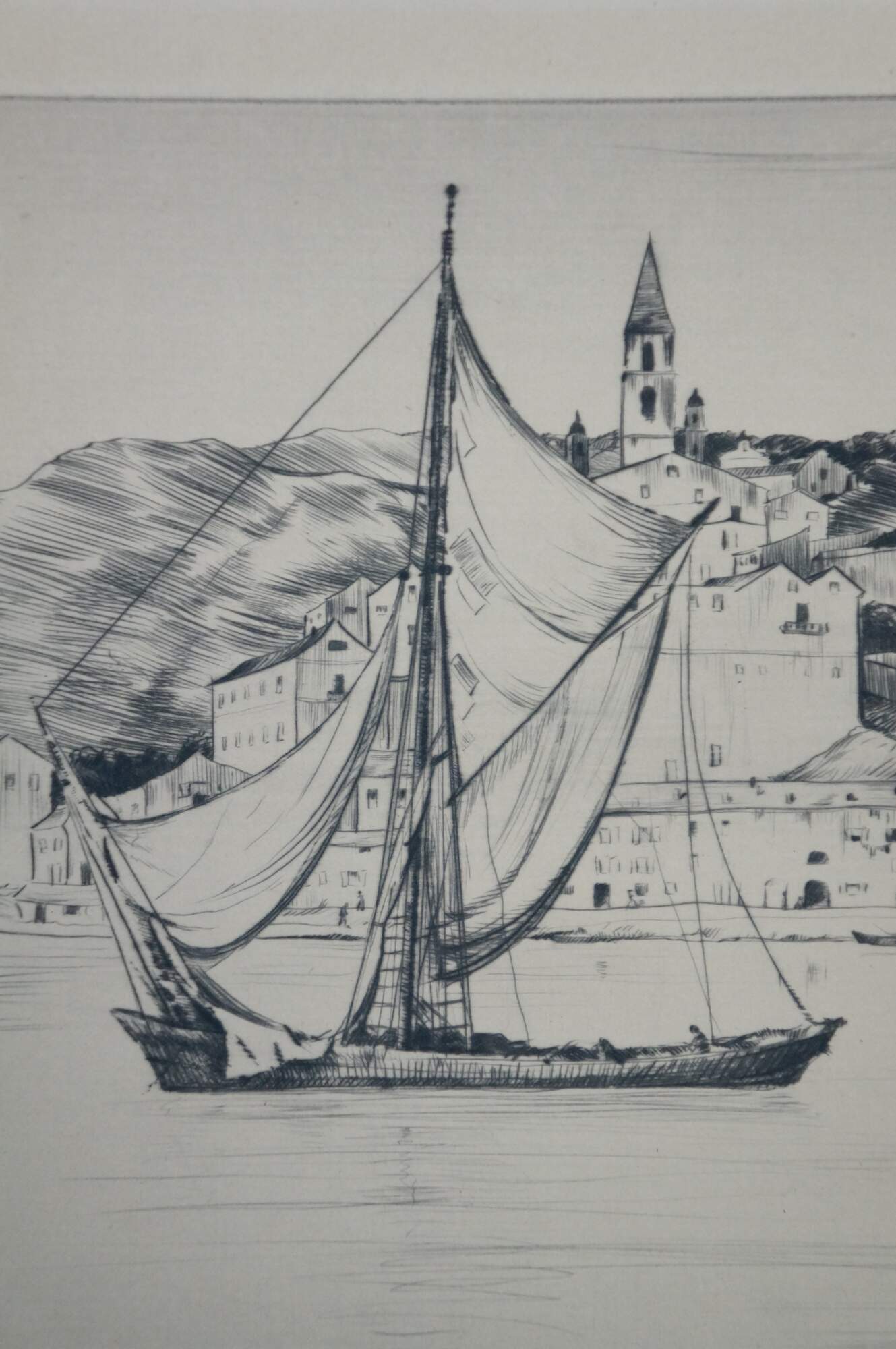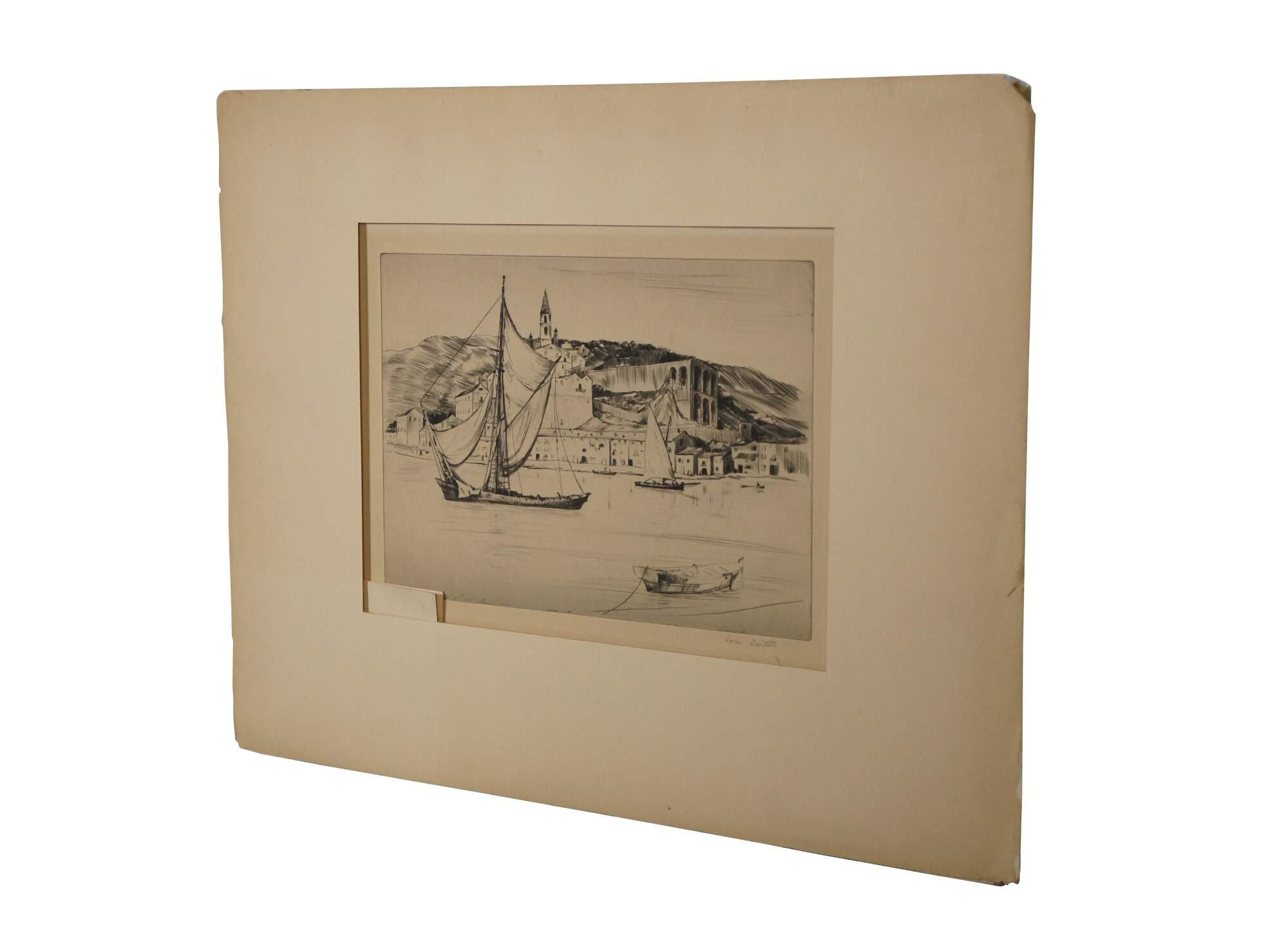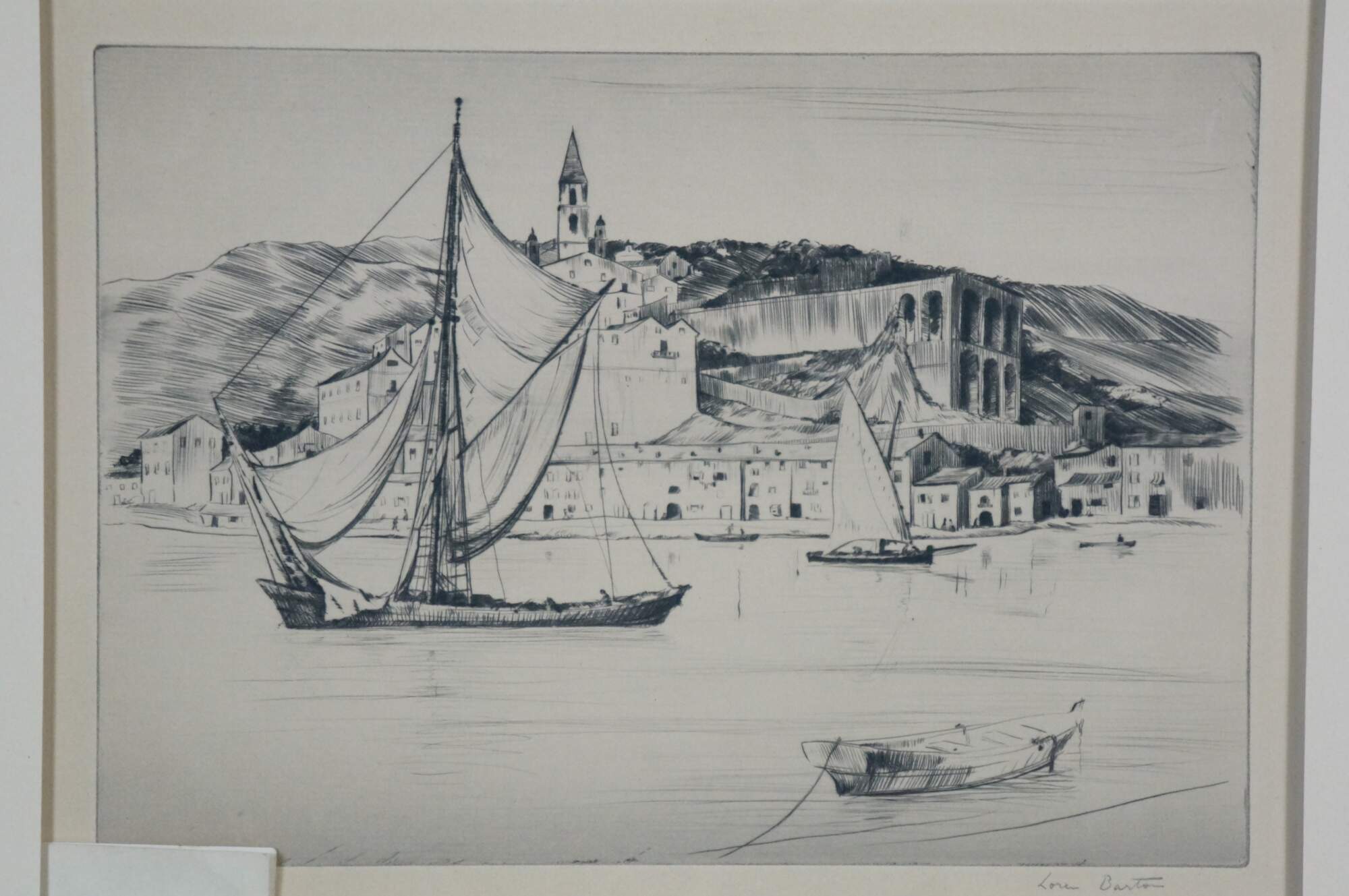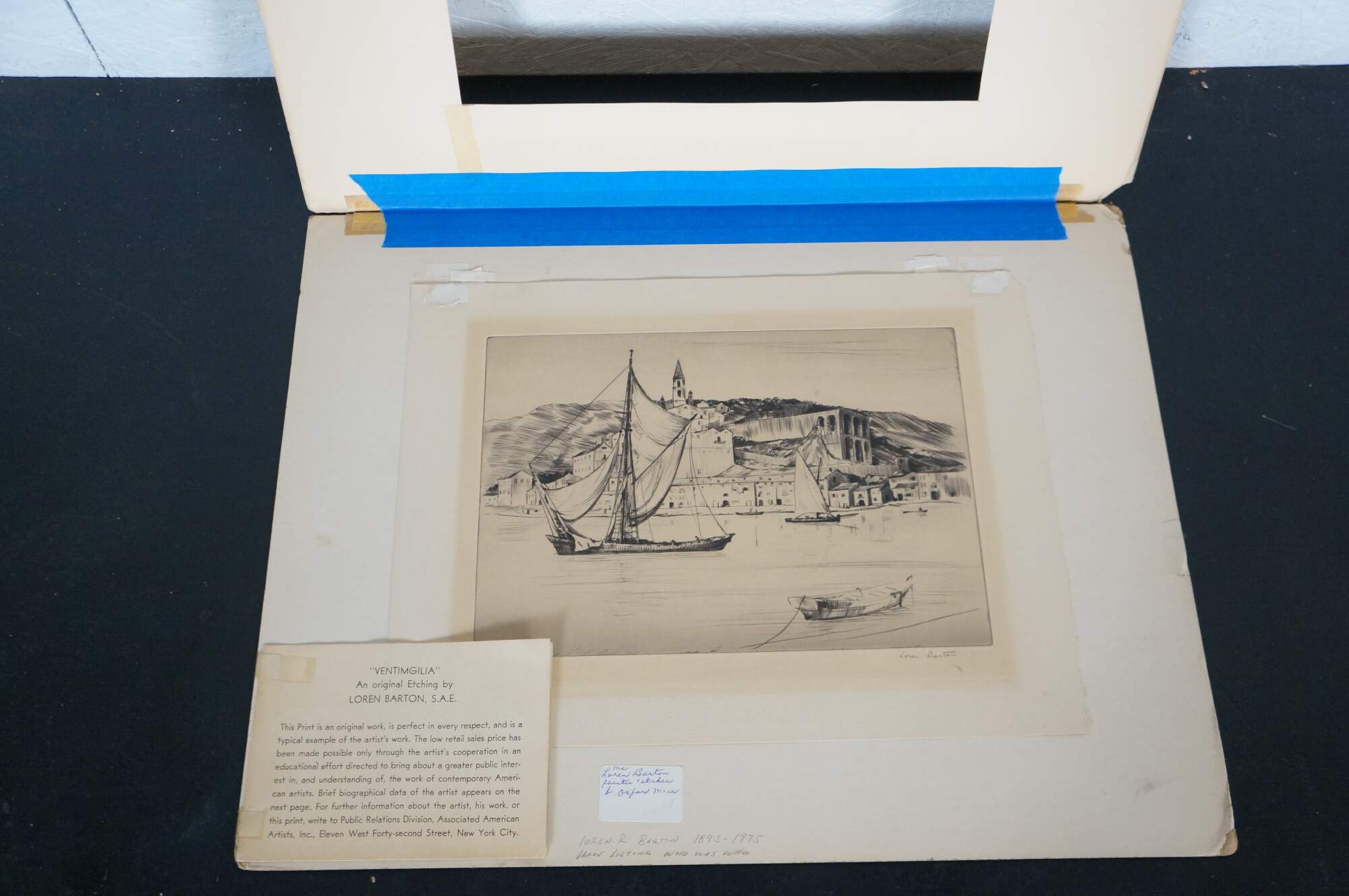 Early 20th century black and white etching titled "Ventimiglia" by Loren Roberta Barton. Coastal seascape of Ventimiglia Italy, with a large ship / sailboats in the foreground. Pencil signed, lower right. Paper in white cardstock mat; unframed.