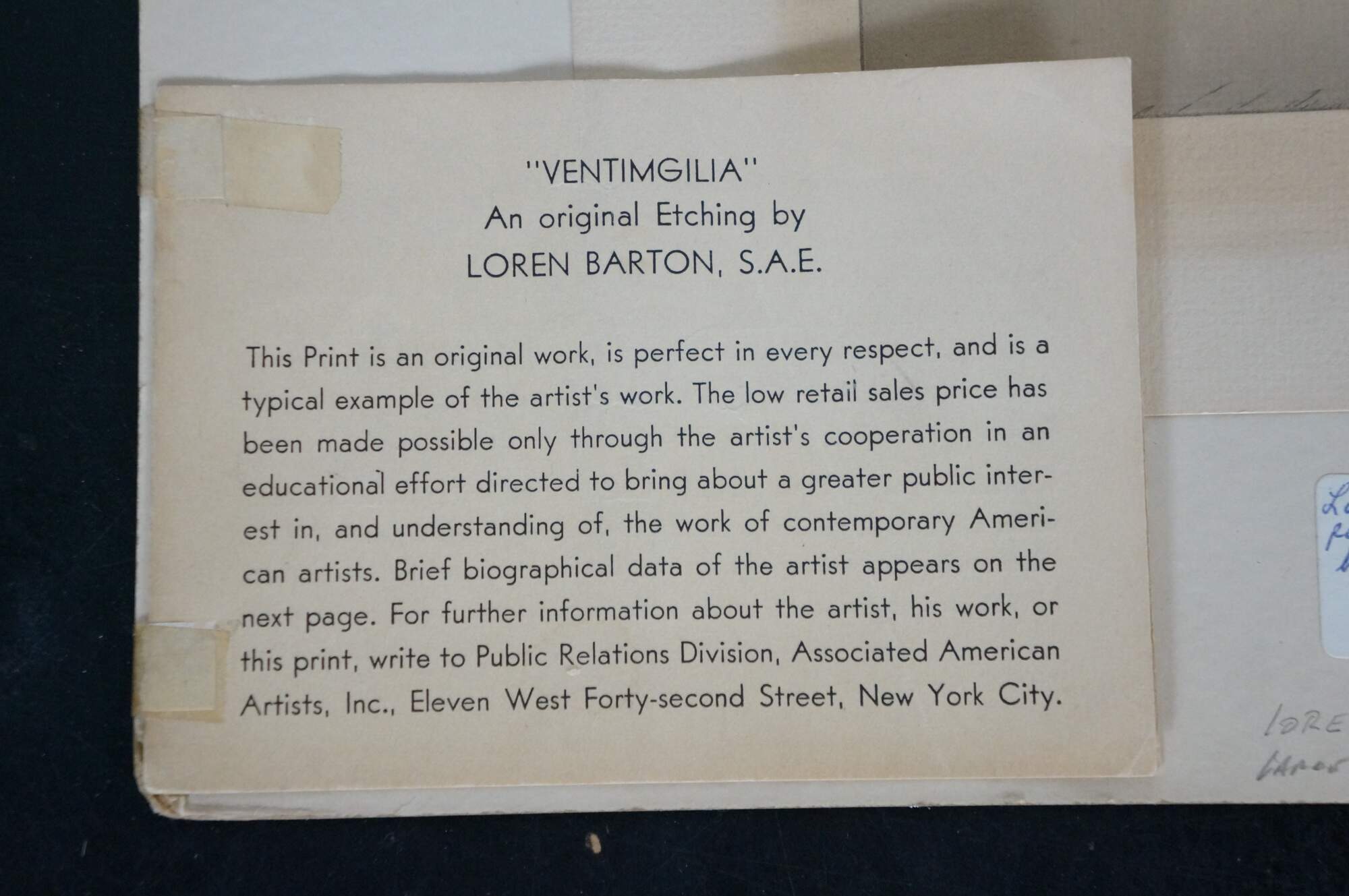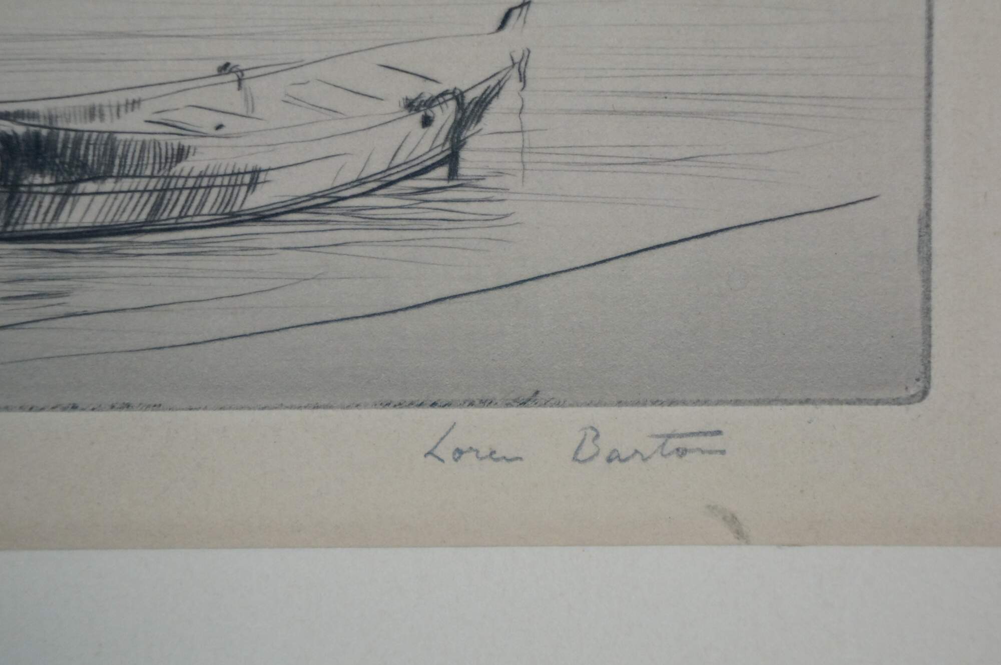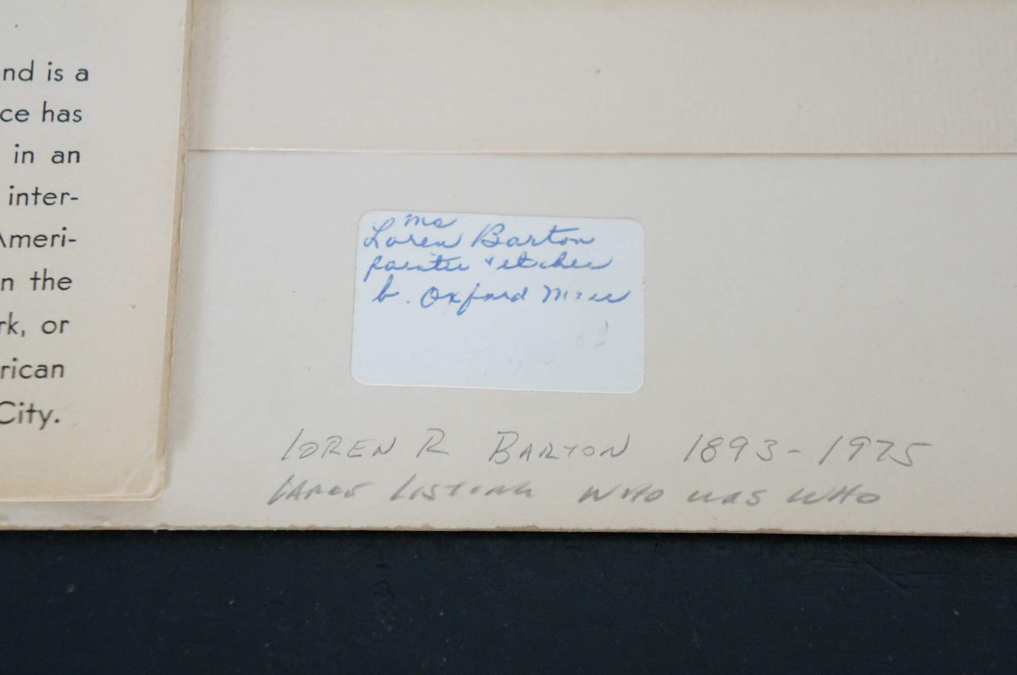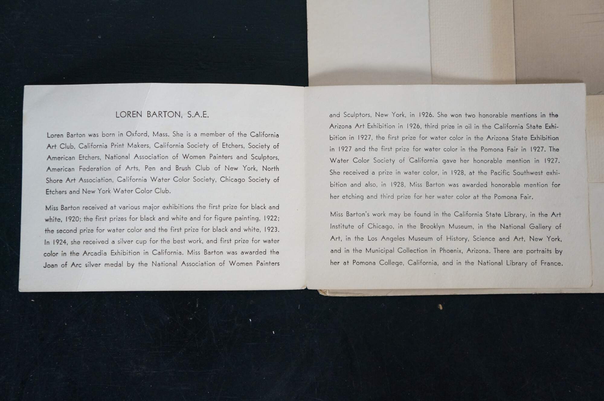 "Loren Roberta Barton, painter, printmaker, illustrator, educator, and lecturer, was born in Oxford, Massachusetts on 16 November 1893 and her family moved to Los Angeles when she was a child. Barton studied with William Lees Judson at the University of Southern California and with Rex Slinkard at the Art Students League of Los Angeles. Barton began her career working in intaglio and oil. Her work was featured in the Exhibition of Paintings by Loren R. Baron, Mabel Alvarez, Paul Lauritz, which opened 16 November 1920 at the Los Angeles Museum. She was included in a number of shows in the 1920s and by 1929 she was touring Europe. While in Europe, Barton met Perez R. Babcock whom she married in 1930 and the couple lived in Italy until 1937. During this period, Barton worked as an illustrator, fulfilling commissions from New York publishers to illustrate books. Upon her return to Los Angeles, Barton exhibited regularly in the California Water Color Society Annuals. Her works were shown throughout the Los Angeles region, including at the Stendahl Gallery, Cannell and Chaffin Gallery, the Ebell Club, and at the Los Angeles and the Santa Barbara Museums. She taught watercolor techniques at the Chouinard Art Institute between 1941 and 1947. Barton was a member of and exhibited with the American Federation of Arts; American Watercolor Society; Brooklyn Society of Etchers; California Society of Printmakers; Chicago North Shore Art Association, Chicago Society of Etchers; National Association of Women Painters and Sculptors; Pen and Brush Club of New York; and the Print Society of English Clubs. She was also a Fellow in the Royal Society of Arts, London. Her work is in the collections of the Art Institute of Chicago; Brooklyn Museum; Detroit Institute of Arts; Pomona College; Los Angeles County Museum of Art; Los Angeles Public Library; National Gallery of Art; New York Public Library; San Diego Museum; Smithsonian American Art Museum; and the Society of California Pioneers, San Francisco. In 1951, Barton married Jervis Russell Miller and her last years were spent in Pomona, California. Loren Roberta Barton Babcock Miller died in Claremont, California on 27 May 1975." (Annex Galleries)