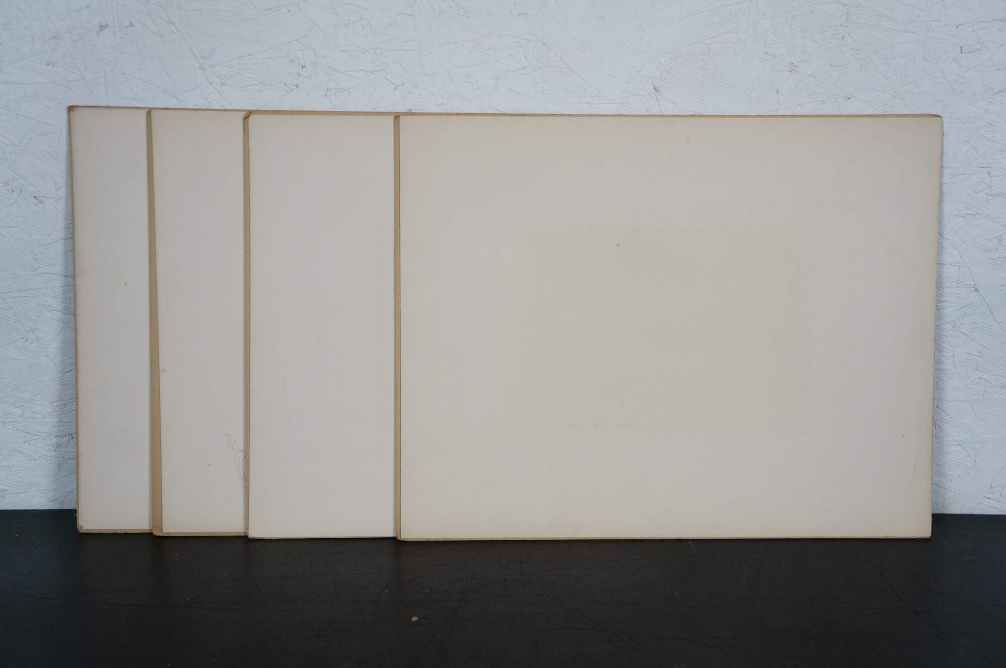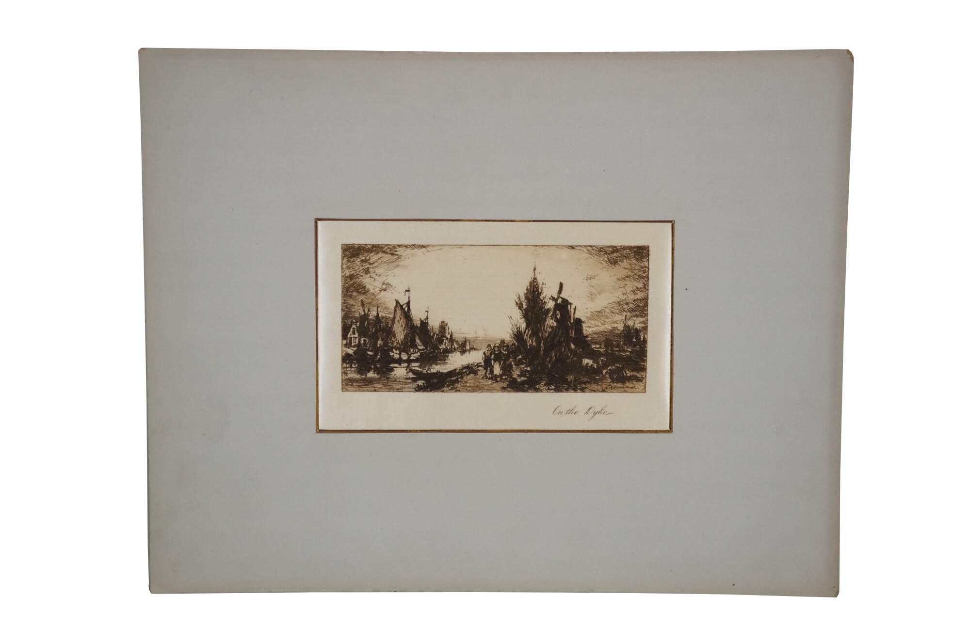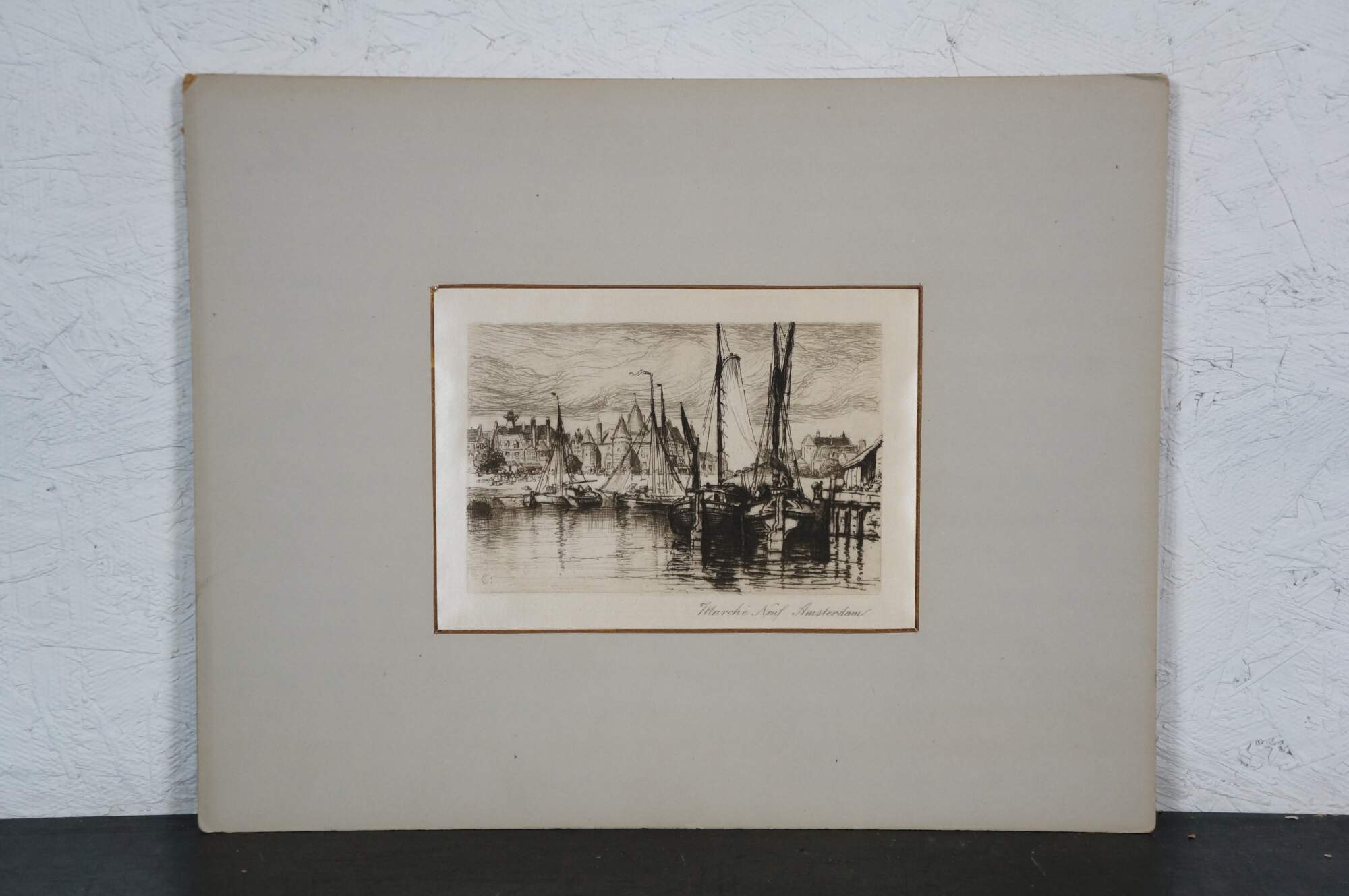 Set of four vintage black and white European etchings. Includes: "Marche Neuf Amsterdam" by Samuel Colman (1832-1920); "A Water Way - Dordrecht" by Charles A. Venderhoof; "On the Dyke" by Charles A. Vanderhoof; and "The Ghetto of Amsterdam" by Joseph Pennell from a sketch by M. Lalanne. Slightly metallic cloth/paper in gray cardboard mats. Cityscape, seascape, architecture, sailboats / ships / harbor.