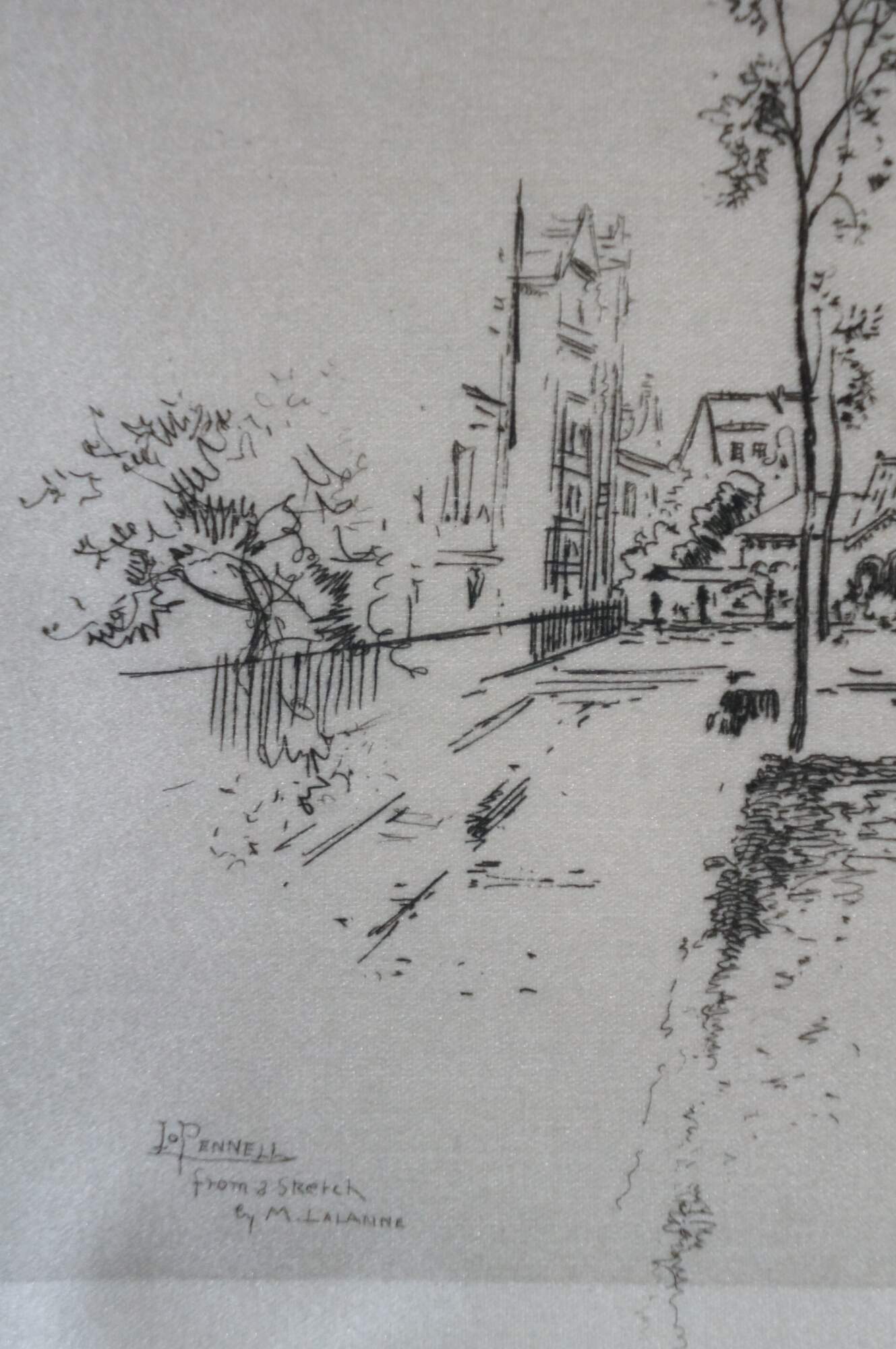 "Joseph Pennell, painter, illustrator, etcher, lecturer, critic, author, teacher, was born in Pennsylvania in 1857, the son of Philadelphia Quaker parents and briefly attended the School of Industrial Design now called the Philadelphia College of Art. He was a pupil in the Pennsylvania Academy of Fine Arts between 1878-80, and his unusual ability in etching was early recognized by his instructor, James L. Claghorn. In his time Pennell had "acquired no small measure of fame as a public lecturer, critic and author. He also taught at the Art Students' League. As an illustrator for a time he worked in New Orleans in collaboration with Cable, the novelist. In 1881 he went to Europe to illustrate some of the Italian writings of W. D. Howells. There he received recognition from Philip Gilbert Hamerton who secured his services in illustrating a book on a tour along the river Seine. "The fame of his work soon brought him all the commissions he wished," and he collaborated with Henry James, Justin McCarthy and Sir Walter Besant in illustrating the "picturesque buildings and streets of London. He also collaborated with Andrew Rensselaer in portraying "the Majesty and beauty of the English cathedrals". He did so with his wife Elizabeth Robbins Pennell. About his drawings an etchings one critic of the time said they are: "legion in number and must be seen to be appreciated [he completed over 1800 etchings and lithographs, executed mostly in Europe before 1917]. His etchings (he has destroyed all his early plates to prevent prints from worn-out plates finding their way into the market), run up into the hundreds and have an average excellence rarely maintained by a devotee of the needle, his Philadelphia, New Orleans, Italian, and London series, all have their own charm and excellence." Another critic wrote: "Mr. Pennell invests every one of his drawings with rare mood. His skies of dawn, noon , sunset, storm, and sunshine are chosen and painted with supreme skill, making pictures of high emotional value. As an etcher Mr. Pennell is without a peer." His style was strongly influenced by James Whistler. Pennell was known for taking up causes and upon his return to the United States he took up a "strenuous fight against unsightly billboards. His art was unique, peculiarly his own. His draftsmanship was legendary and one historian wrote: "the world produced few equals and no superior. With rare exception everything he has done has in an eminent degree, the quality of the artistic." (Brush & Palette 12:81) He did a famous series of twenty-three lithographs of the Panama Canal that gained him much notoriety, and the Italian government has purchases for the Uffizi Gallery the originals. They also purchased his lithographs of the Grand Canyon and the Yosemite that he did while traveling in the American West in 1912 and 1915. Pennell also did scenes of San Francisco during those trips. That was the first time lithographs were acquired for the Uffizi and conferred the distinction of the "talented American Artist." He also did lithographs for the United States and Great Britain during the war that were "high class propaganda-to stir the war spirit and to stimulate national pride." He won numerous awards for his work including: 1st class gold medal, Paris Expo., 1900; Dresden, 1902; Grand Prize, St. Louis Expo., 1904; gold medal, Liege, 1905; Grand Prix, Milan, 1906; Barcelona, 1907; Brussels, 1910; Diplome d'Honneur, Amsterdam, 1912; 2 medals, London, 1913; Florence,1914; Commemorative medal, Florence, 1915 and others. Joseph Pennell was elected an Associate of the National Academy in 1907, and an Academician in 1909. Pennell was a member of the New York Etching Club and author of "Lithography and Lithographers, 1900; The Authorized Life of J. McN. Whistler (with Mrs. Pennell, 1910; and Pictures of War Work in America, 1918. He also illustrated a great number of books and was a contributor to the leading magazines of his day. He passed away April 23rd, 1926." (askART)