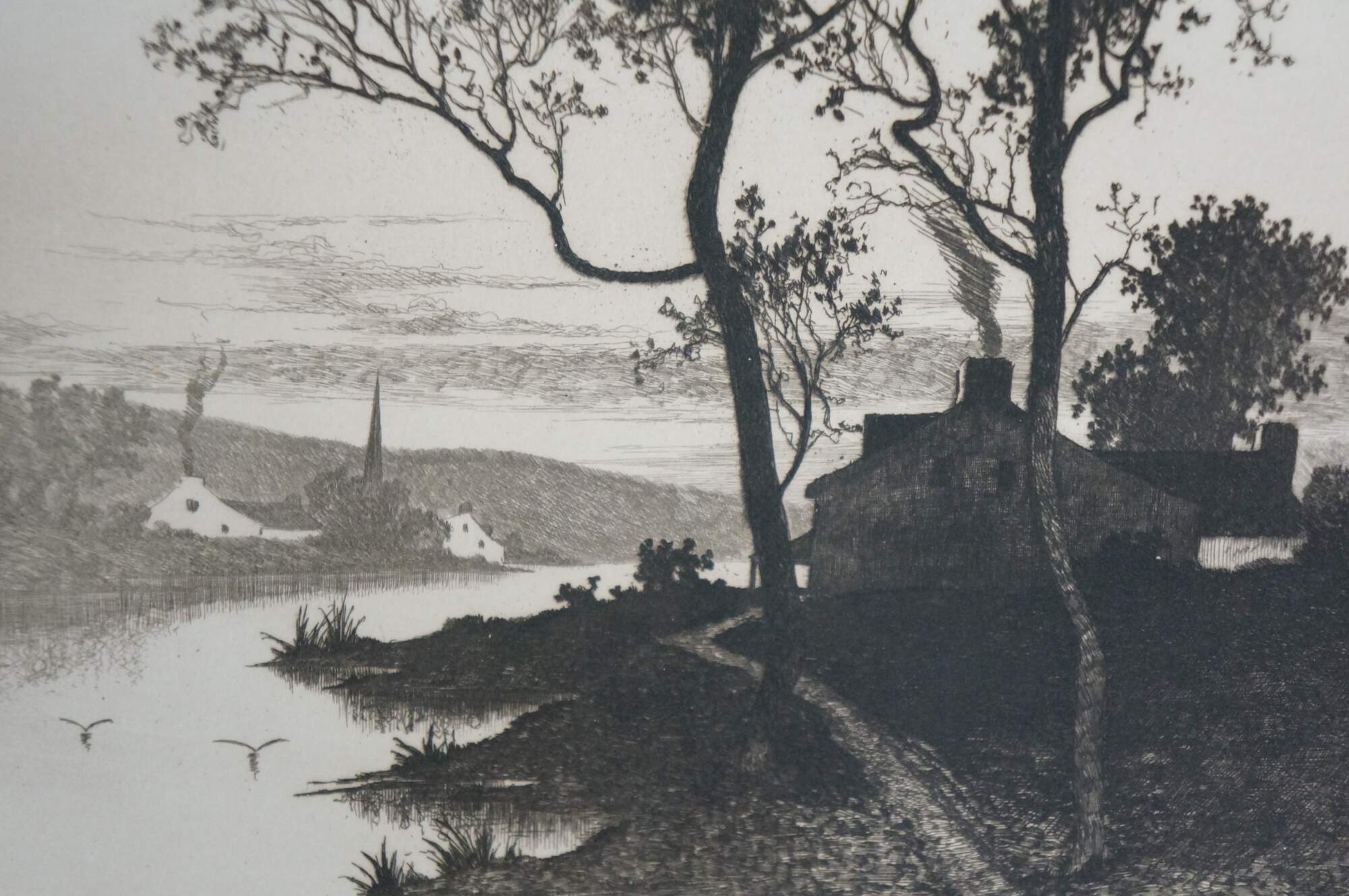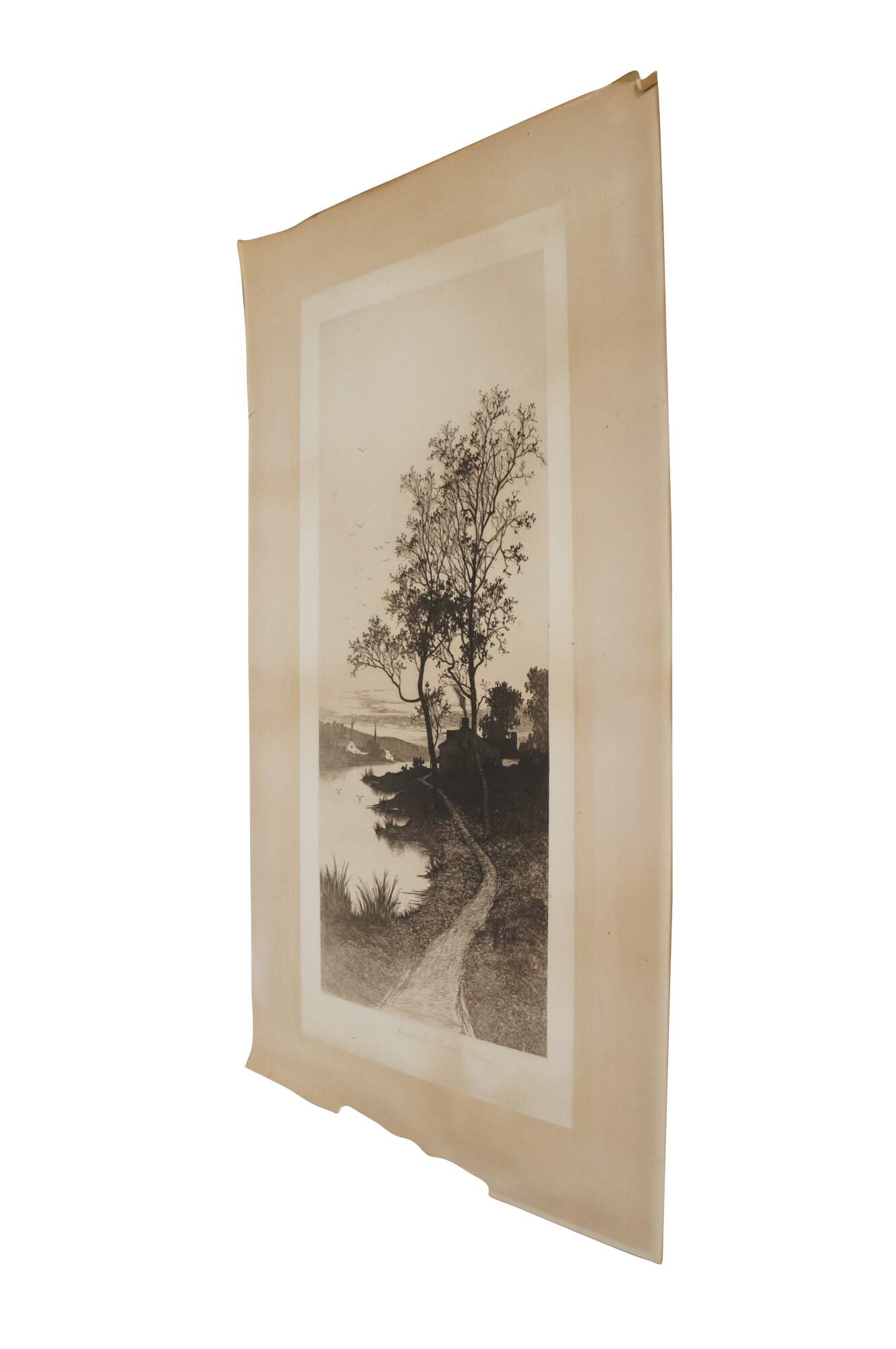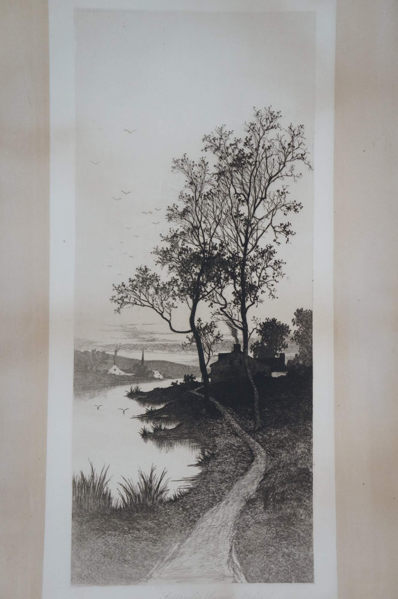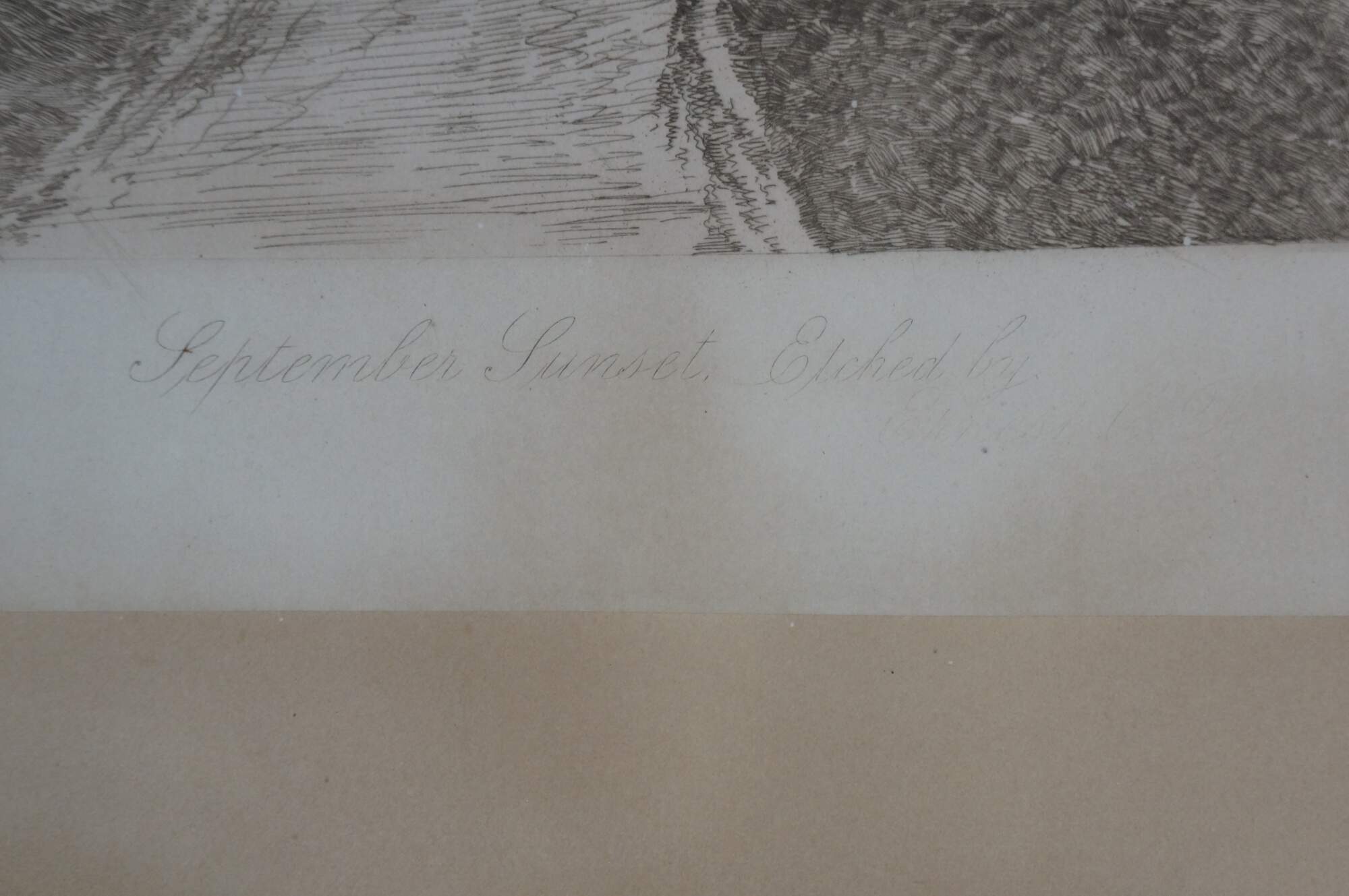 Late 19th century black and white etching titled "September Sunset" by Ernest C. Rost. Vertical landscape showing a narrow footpath next to water. Published by Fishel, Adler & Schwartz, New York. Signed and titled in plate. Paper; unframed.