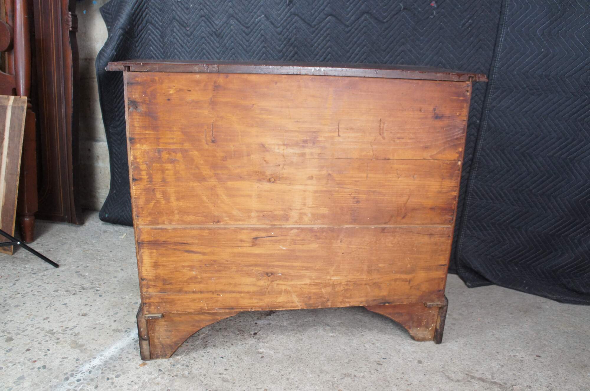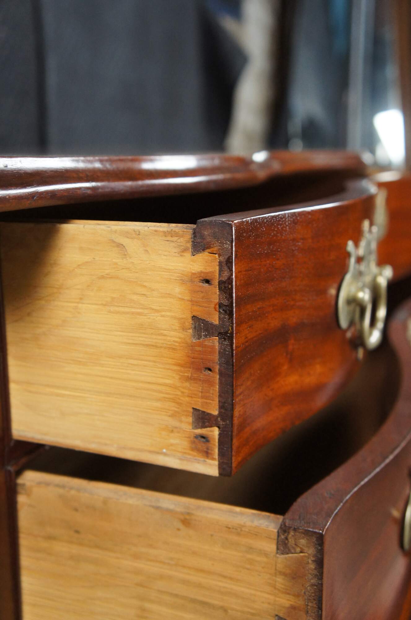 An American Chippendale Beachelor's Chest or Dresser. Made from mahogany with a rectangular serpentine fronted case with four hand dovetailed drawers and solid brass batwing hardware. The case is supported by ogee bracket feet.