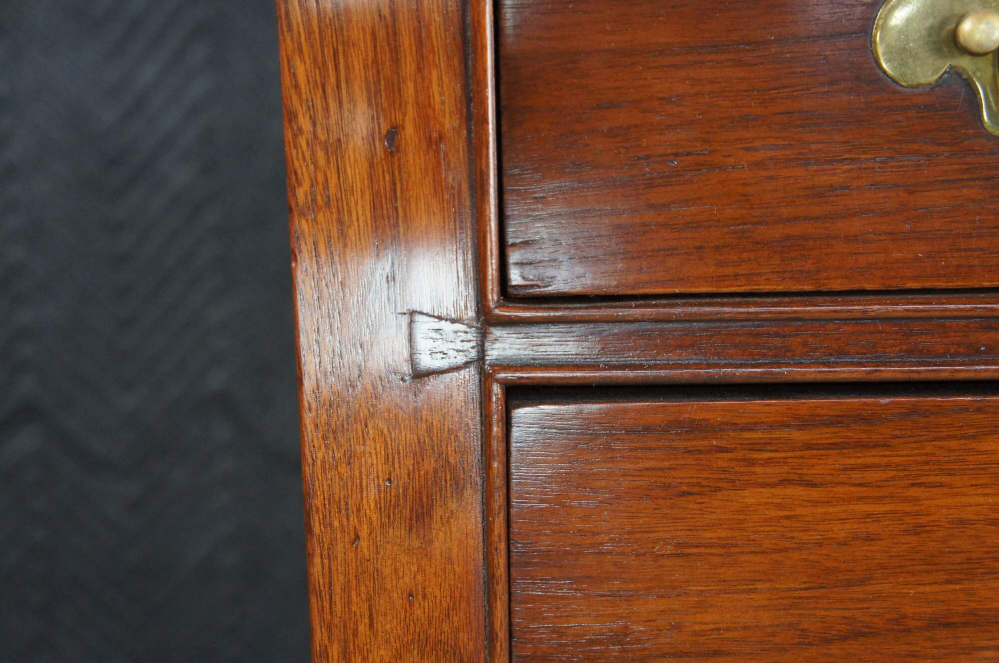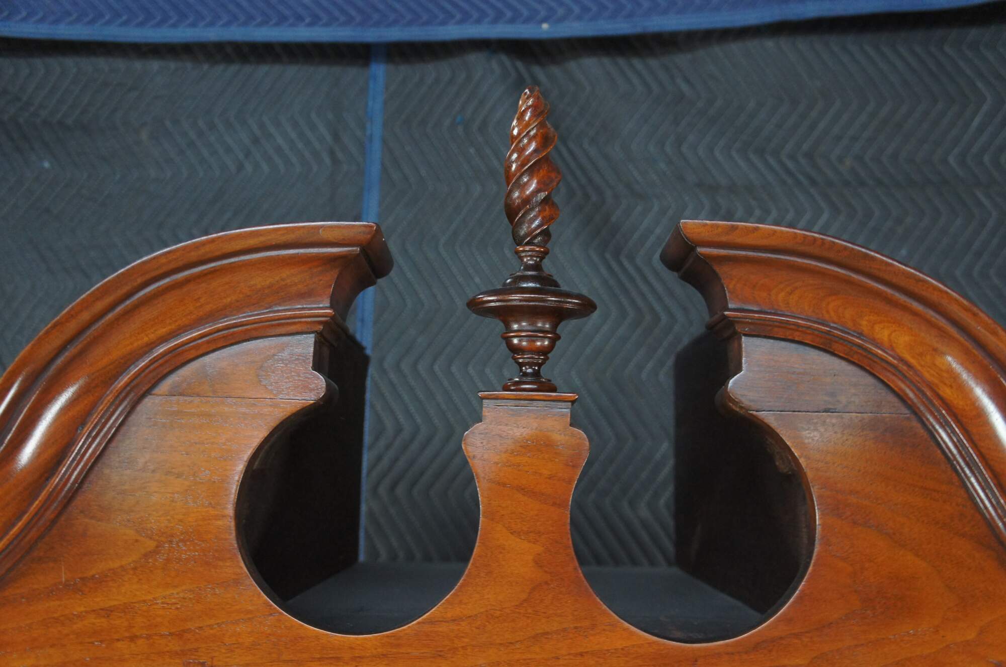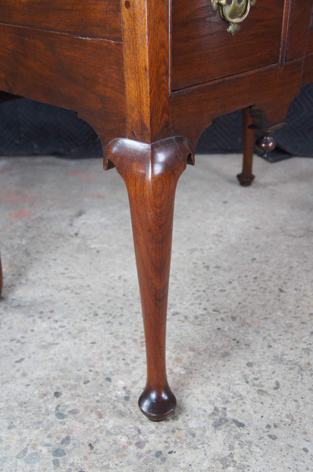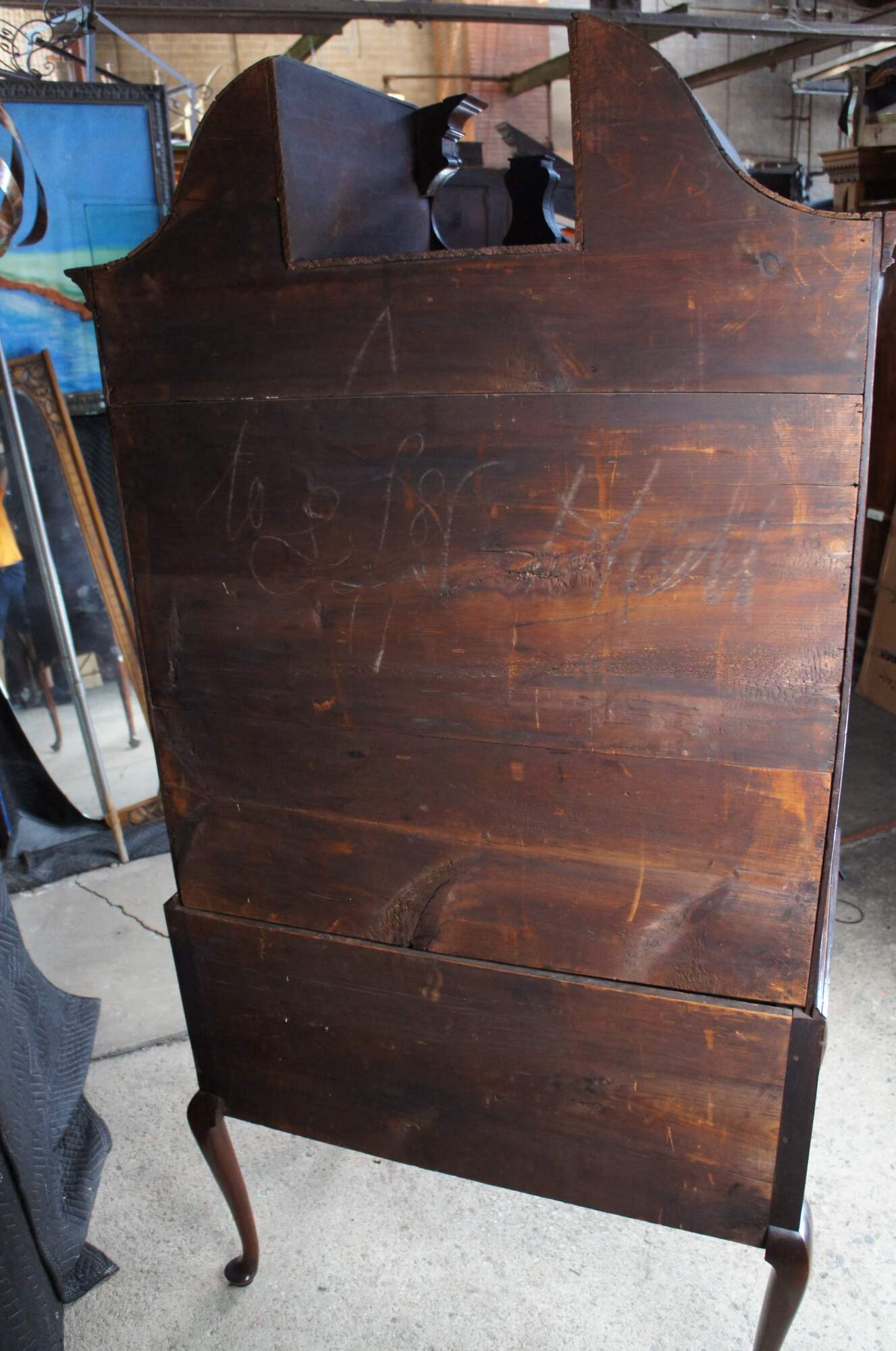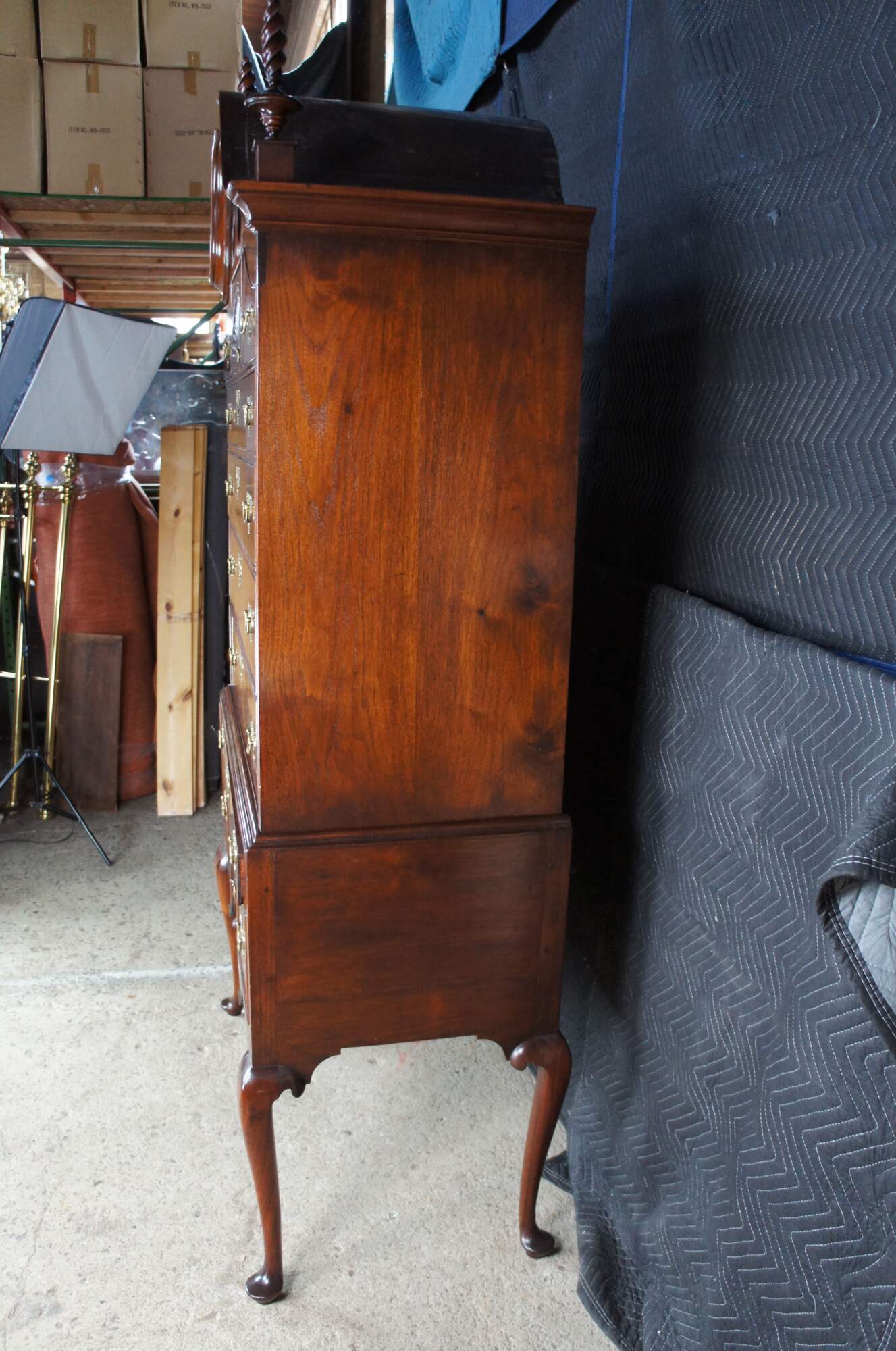 Mid 18th Century American Queen Anne Bonnet Top Boston Highboy. Features a cherry case with molded swans neck pediment centering flame finials above a case with three short drawers, the center showcasing fan carving over four graduated drawers. The lower part of the case has mid molding above a long slender drawer above three more short drawers with the centermost being fan carved. The lower apron is shaped with two down finials set between long slender cabriole legs with pad feet. The case and drawers are constructed via mortise and tenon and dovetailed joinery. Drawers have solid brass batwing drawer plates with bale hardware and matching escutcheon plates.