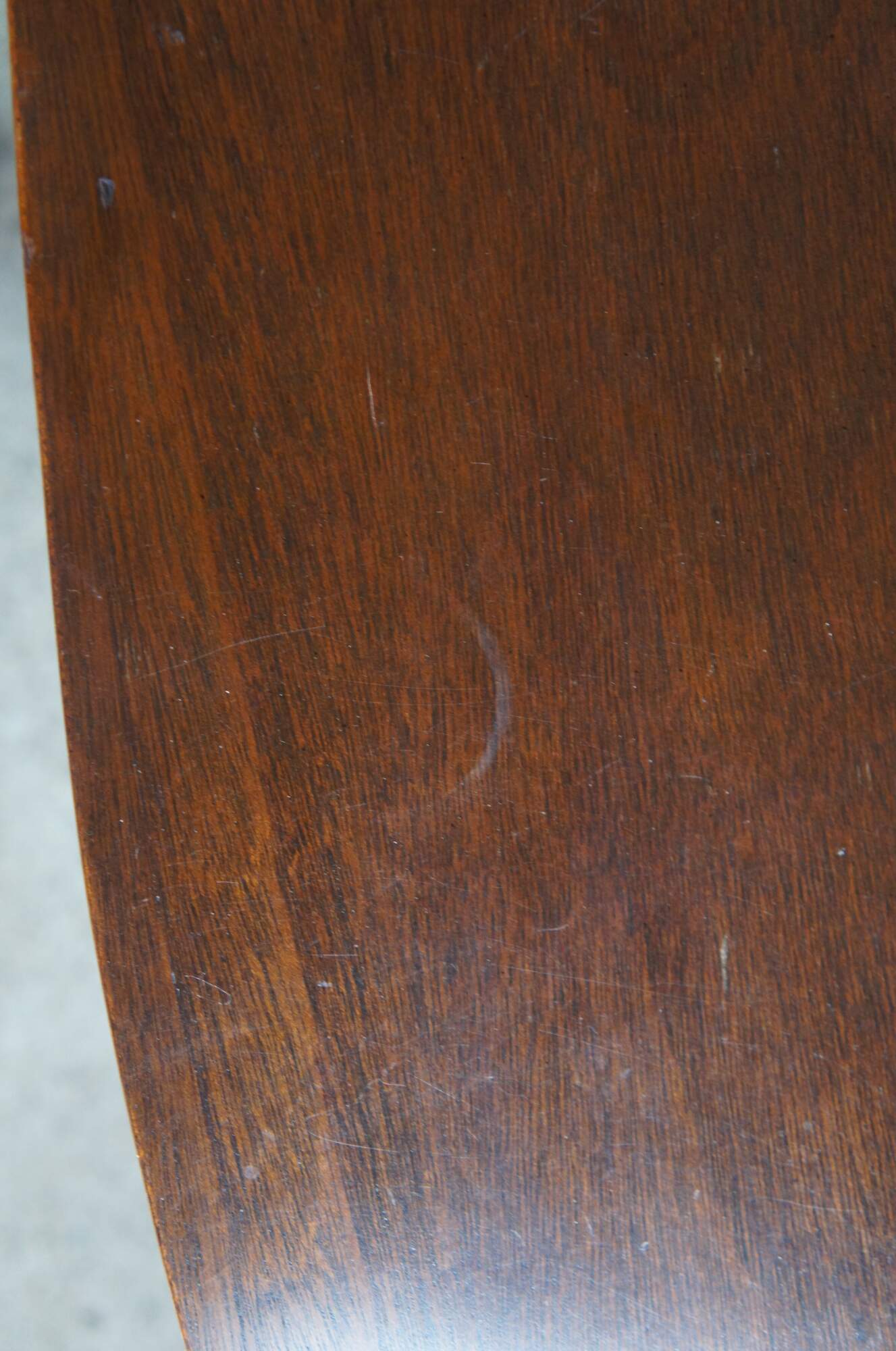 1970s American Federal Style Demilune Console Table, attributed to Councill Furniture. Features a shapely mahogany frame with concave corners centered by a marquetry inlaid urn, sawtooth beaded edge and square tapered inlaid legs.