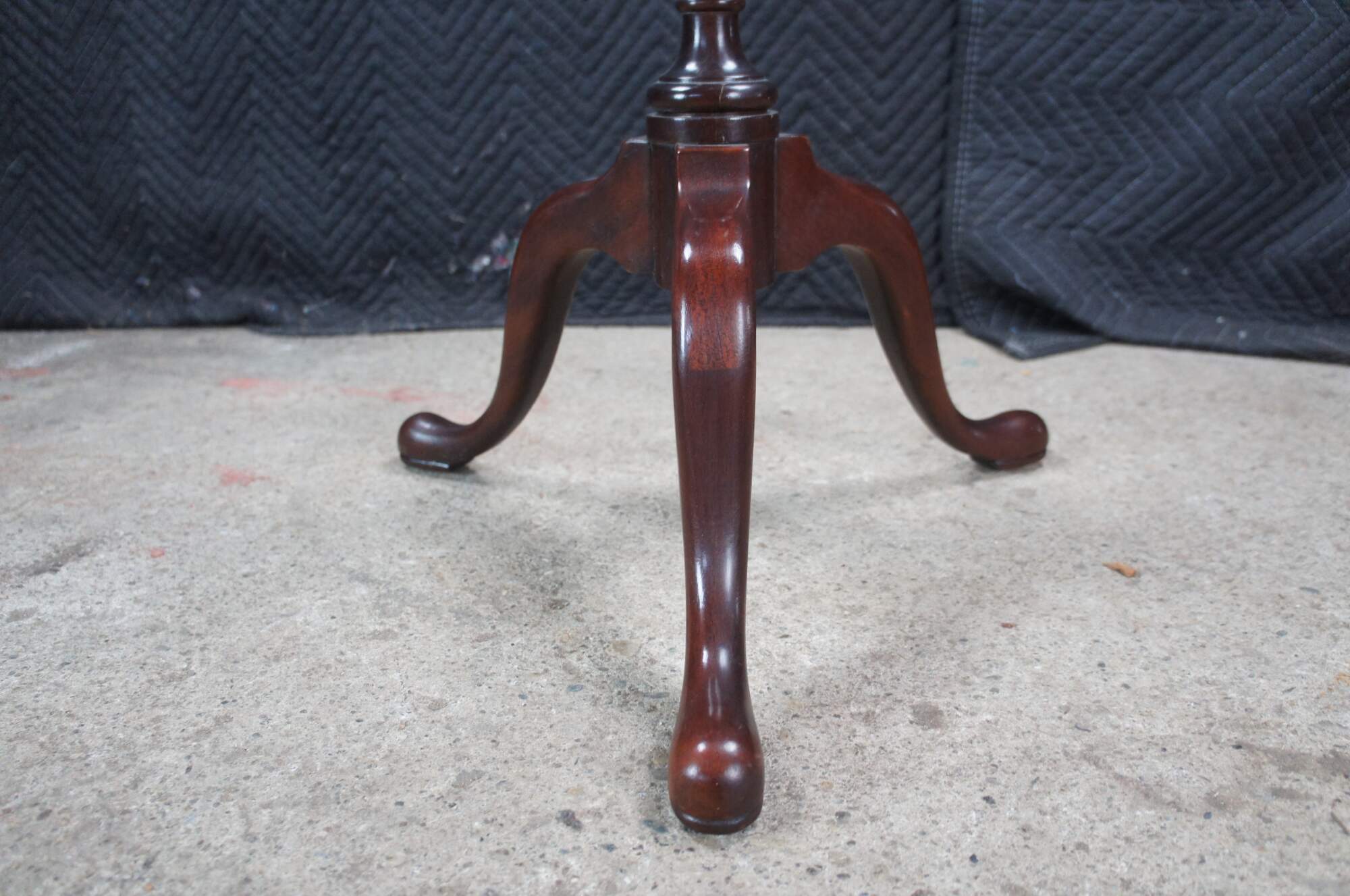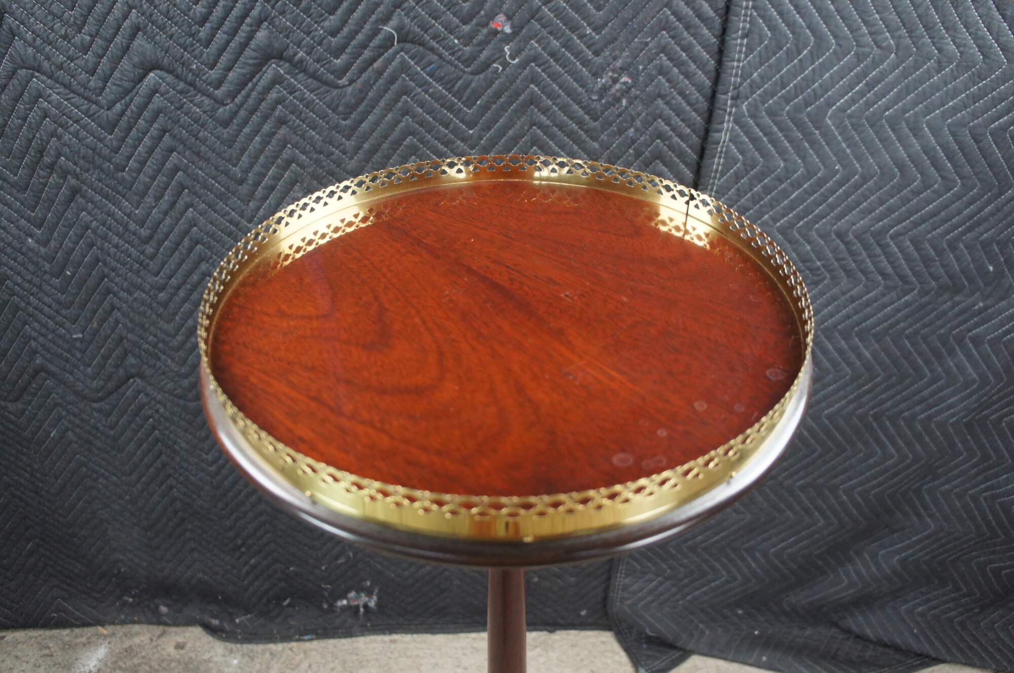 1980s Queen Anne style mahogany candlestand. Features a circular top with pierced brass gallery over a slender turned support terminating into a tripod base with cabriole legs and pad feet.