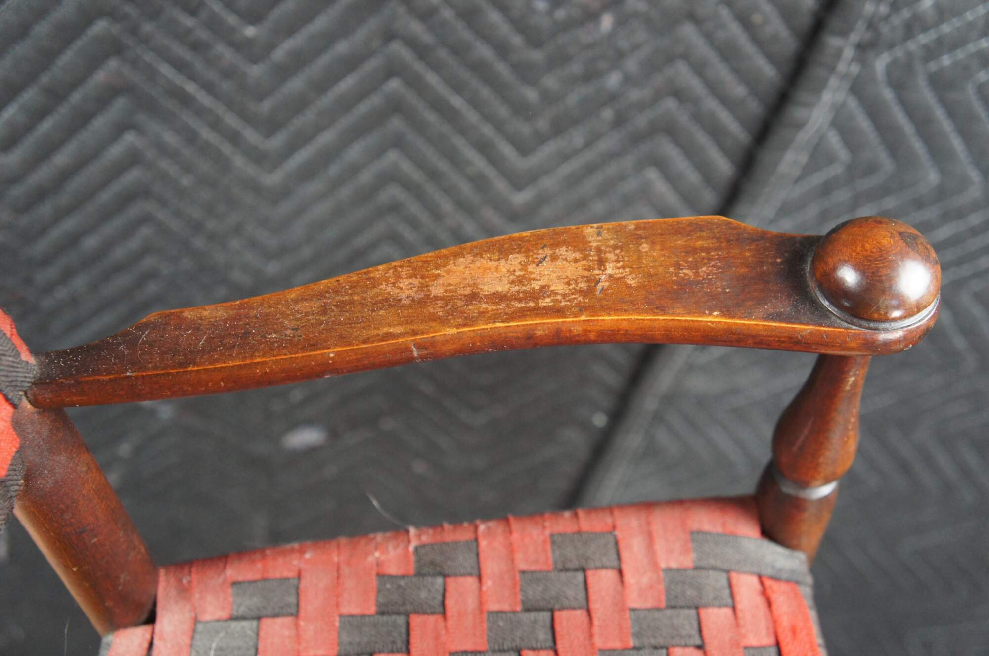 This beautiful example is made from maple with acorn shaped finials over a woven back and seat. The arms are mushroom capped over a vase shaped turning leading to lower spindled stretchers and rockers. Original makers mark along the back inner support of the chair.