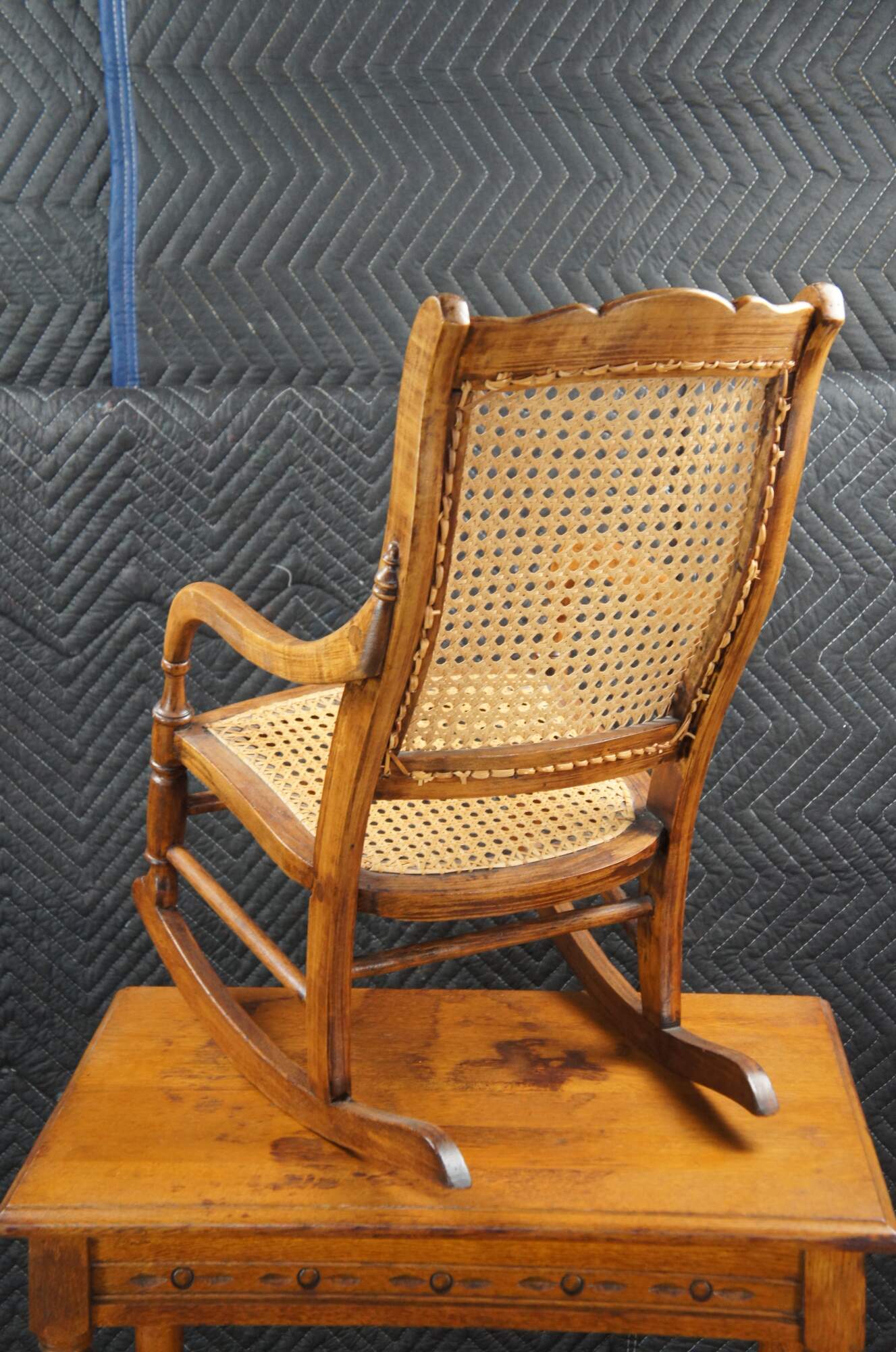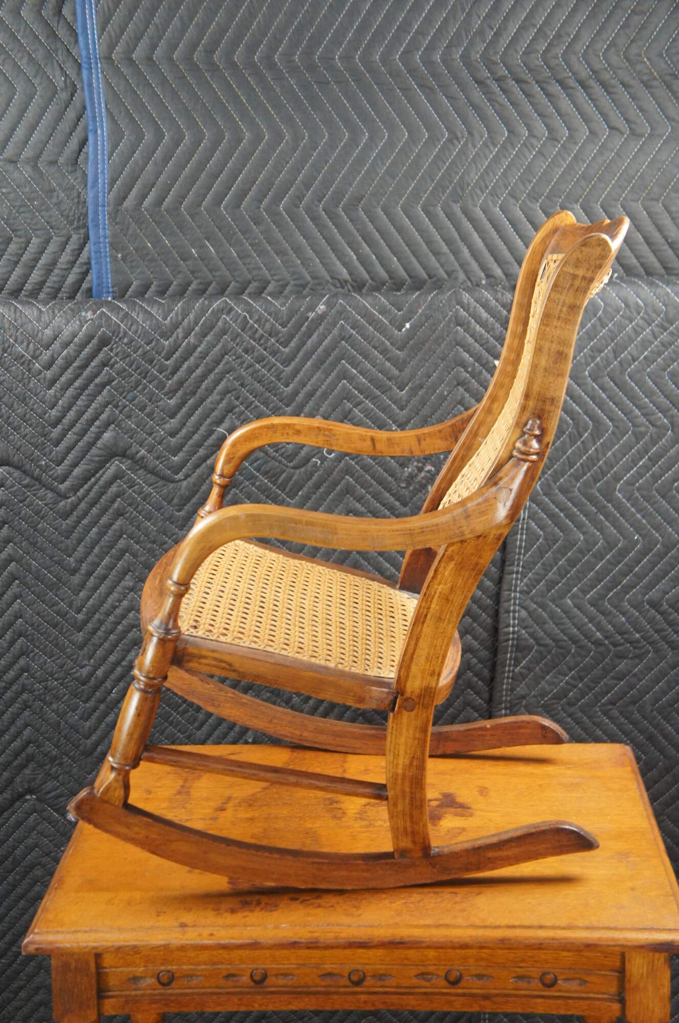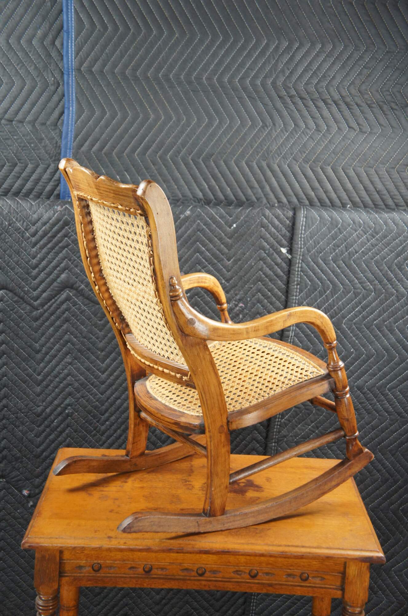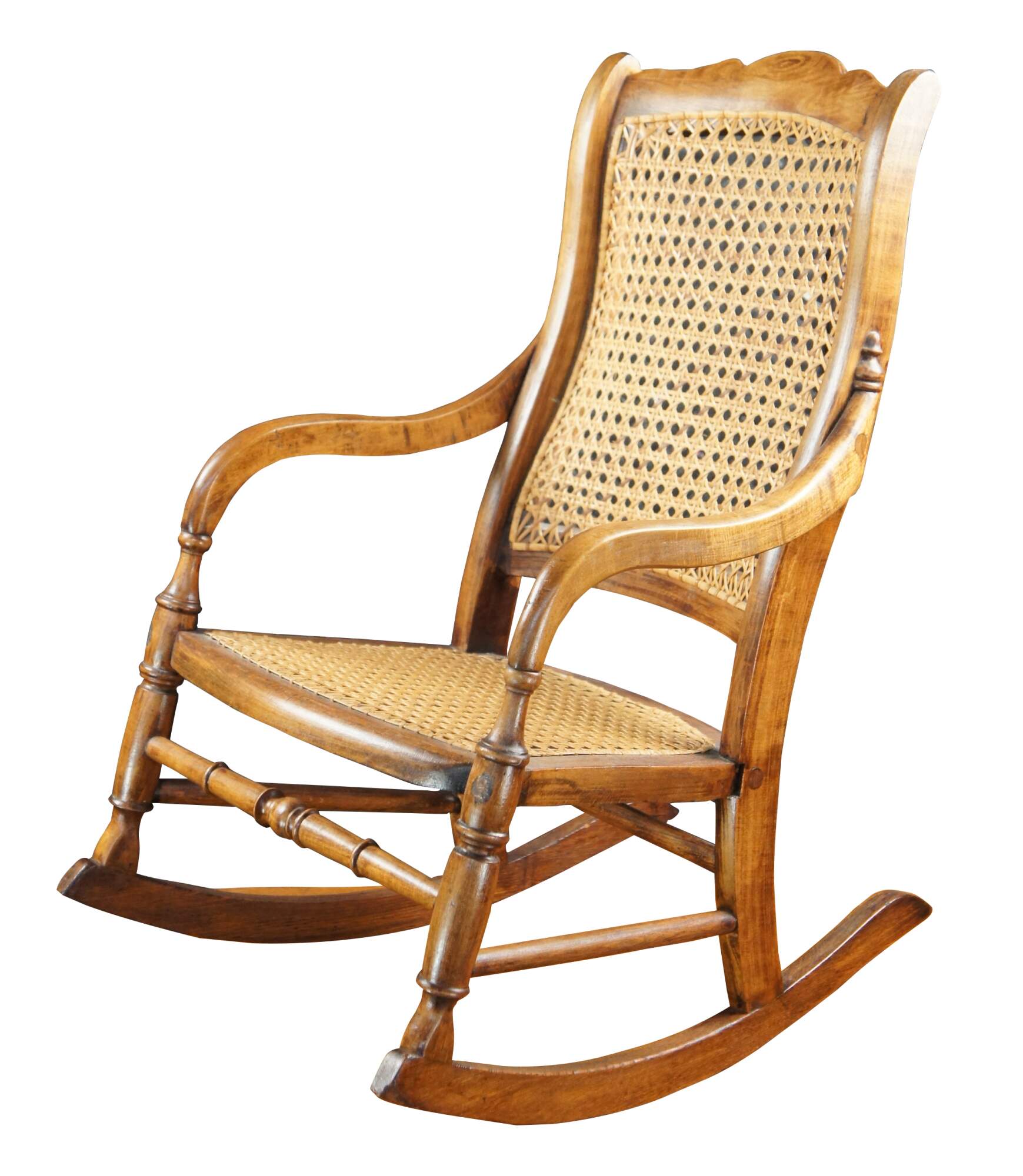 Victorian Childs Rocking Chair, circa 1890s. Features a serpentine crest rail over contoured caned back with downswept arms leading to a caned seat and ring turned front supports connected by spindles over the rocker rails. Arms feature a fun quarter cut spindled accent where they meet the chair back. The underside of the seat is labeled From Anna 46 Years Old Thanksgiving Nov. 1920.