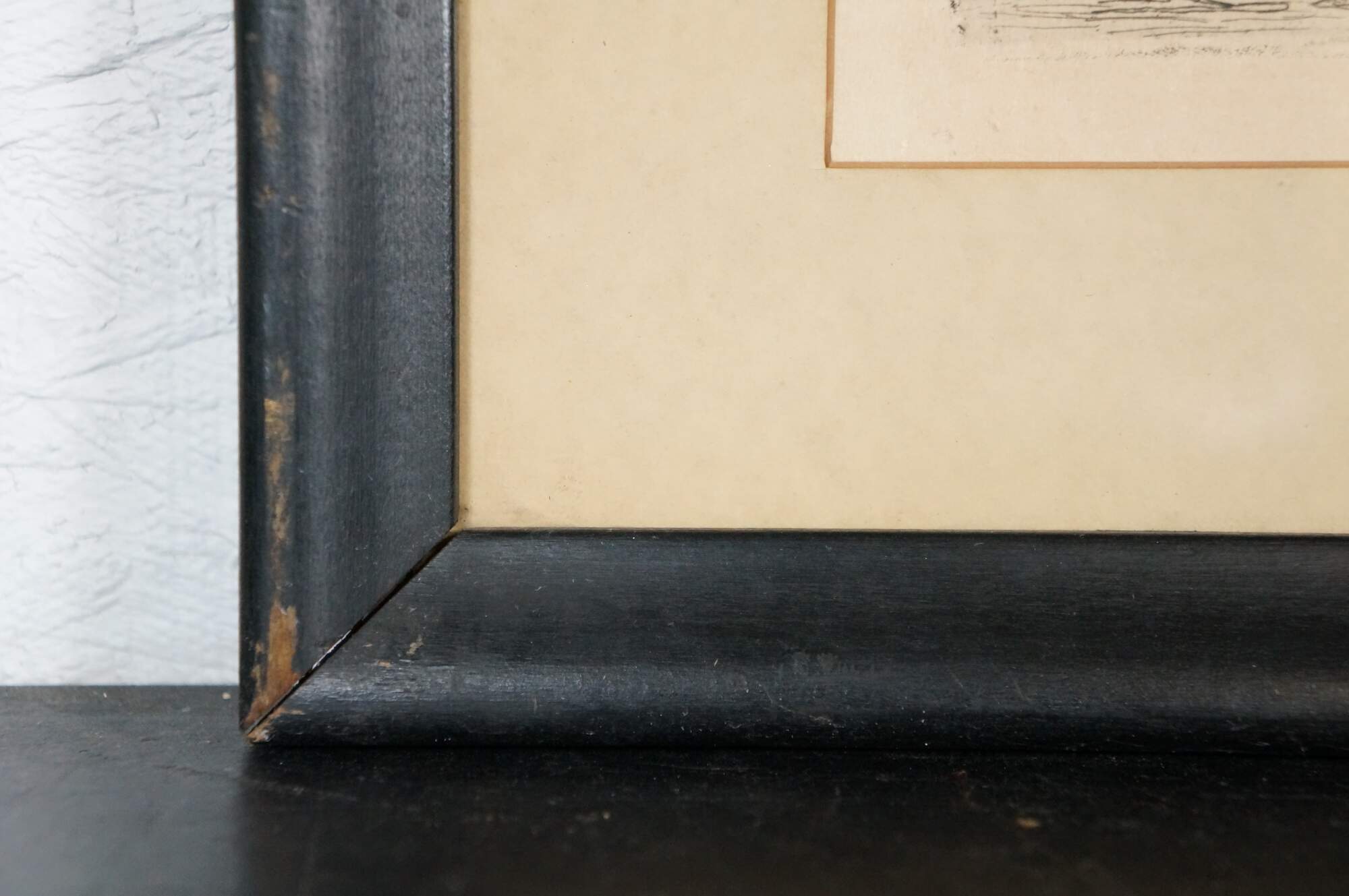 Wear and distressing from age, foxing / discoloration, scuffing, marking, finish loss to frame, water damage to right side of mat and etching