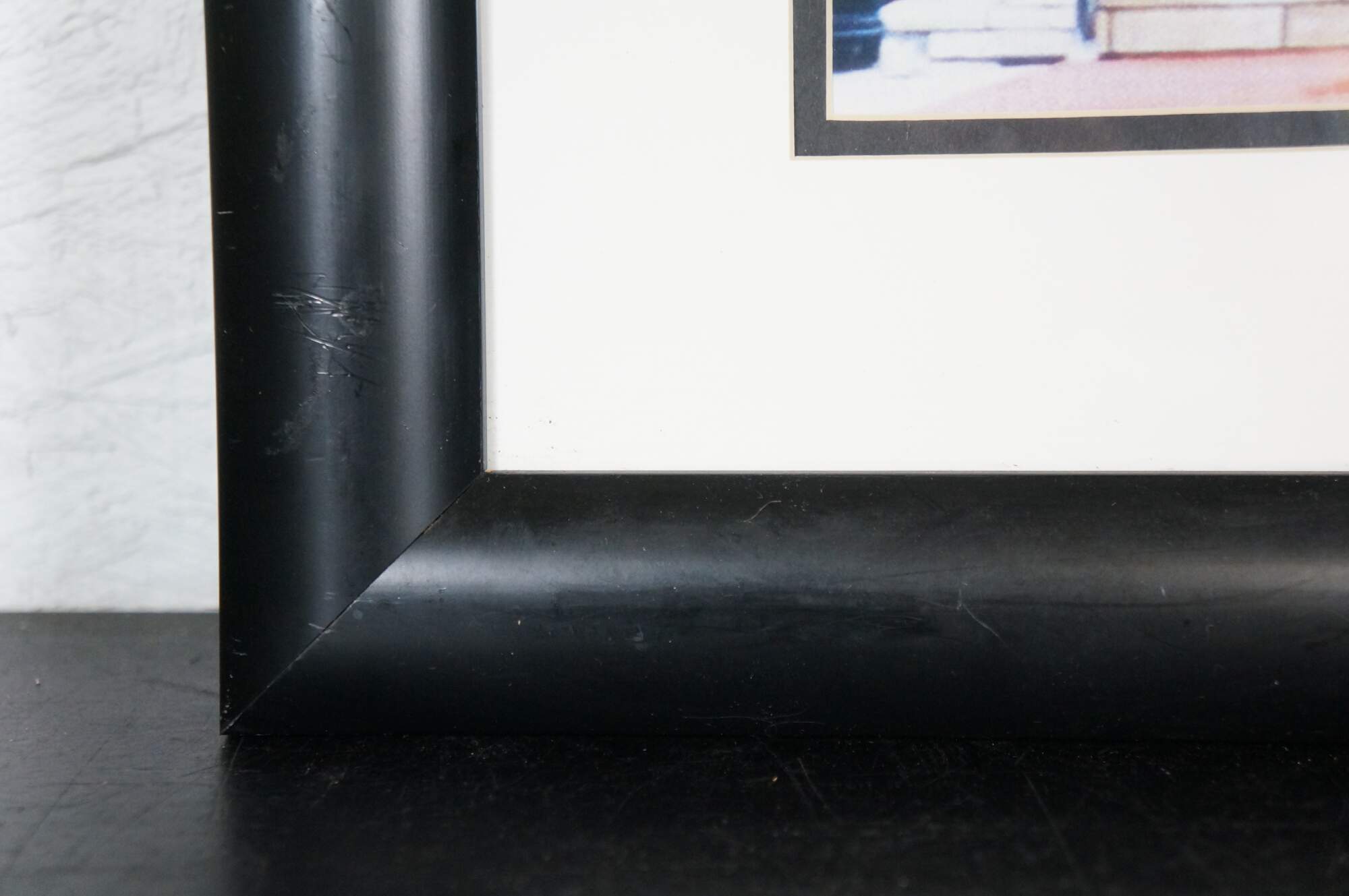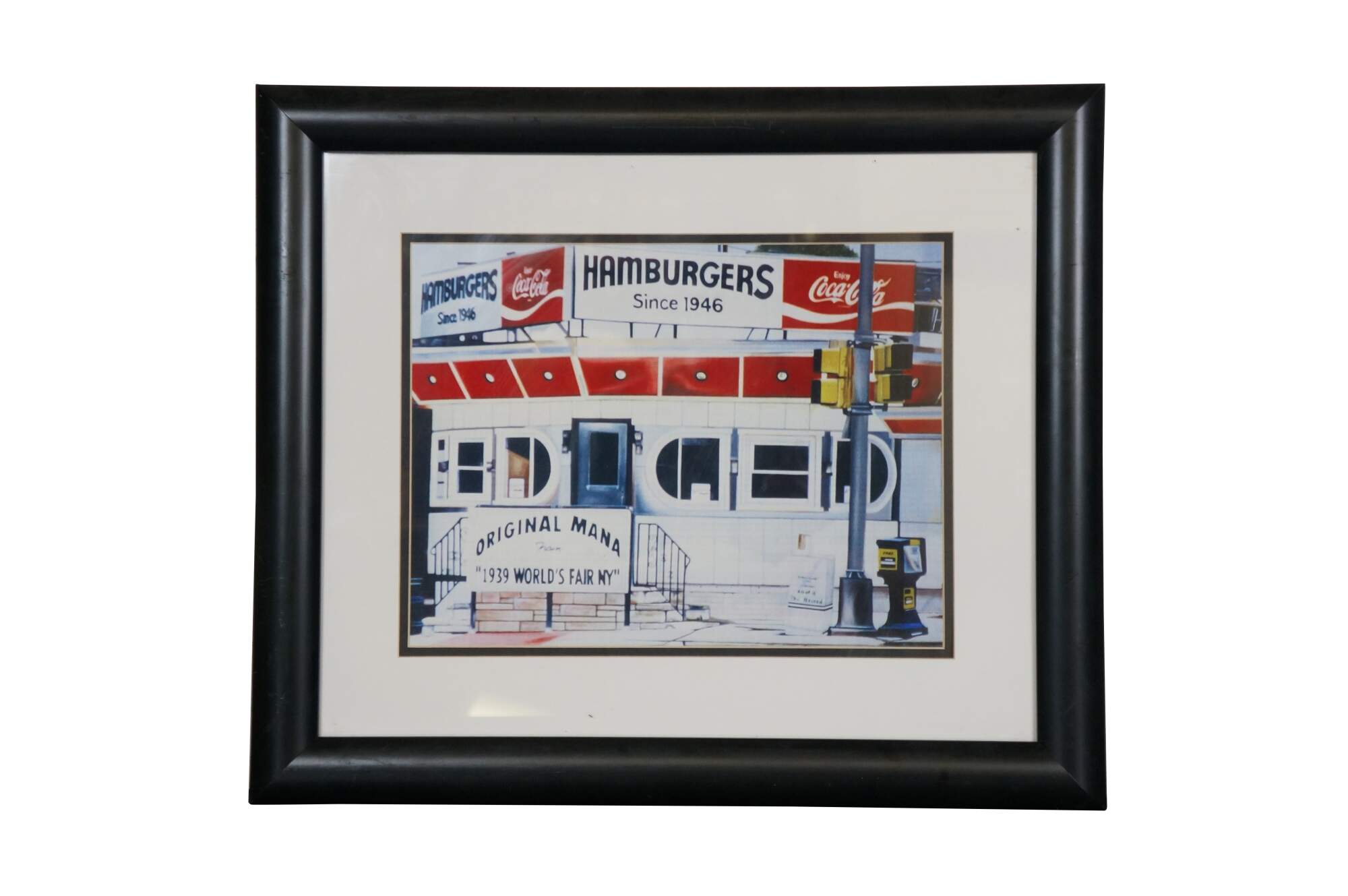 Pair of late 20th century retro style art prints depicting two New Jersey classics - the original White Mana Diner and Kohr's Frozen Custard Ice Cream shop. Rounded black composite frames; black and white layered mat. Originally purchased at Bed, Bath, and Beyond.