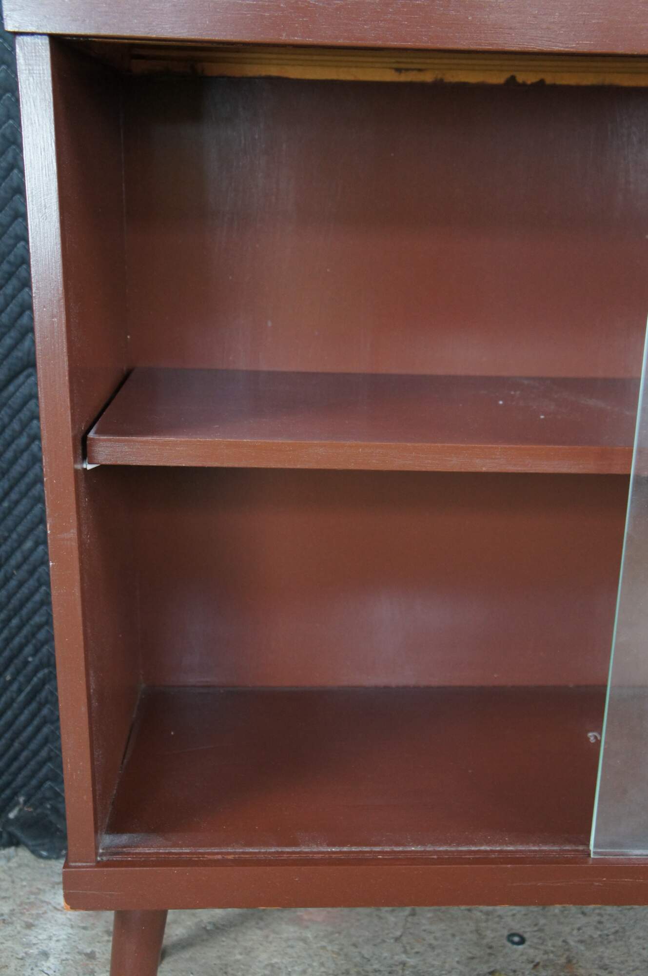 Mid century book case / curio cabinet with sliding glass doors, two shelves, and tapered legs.