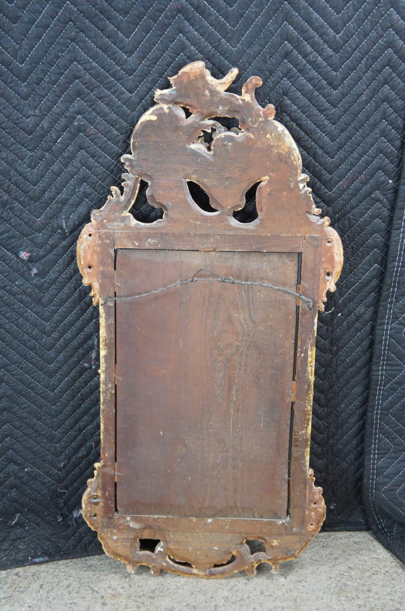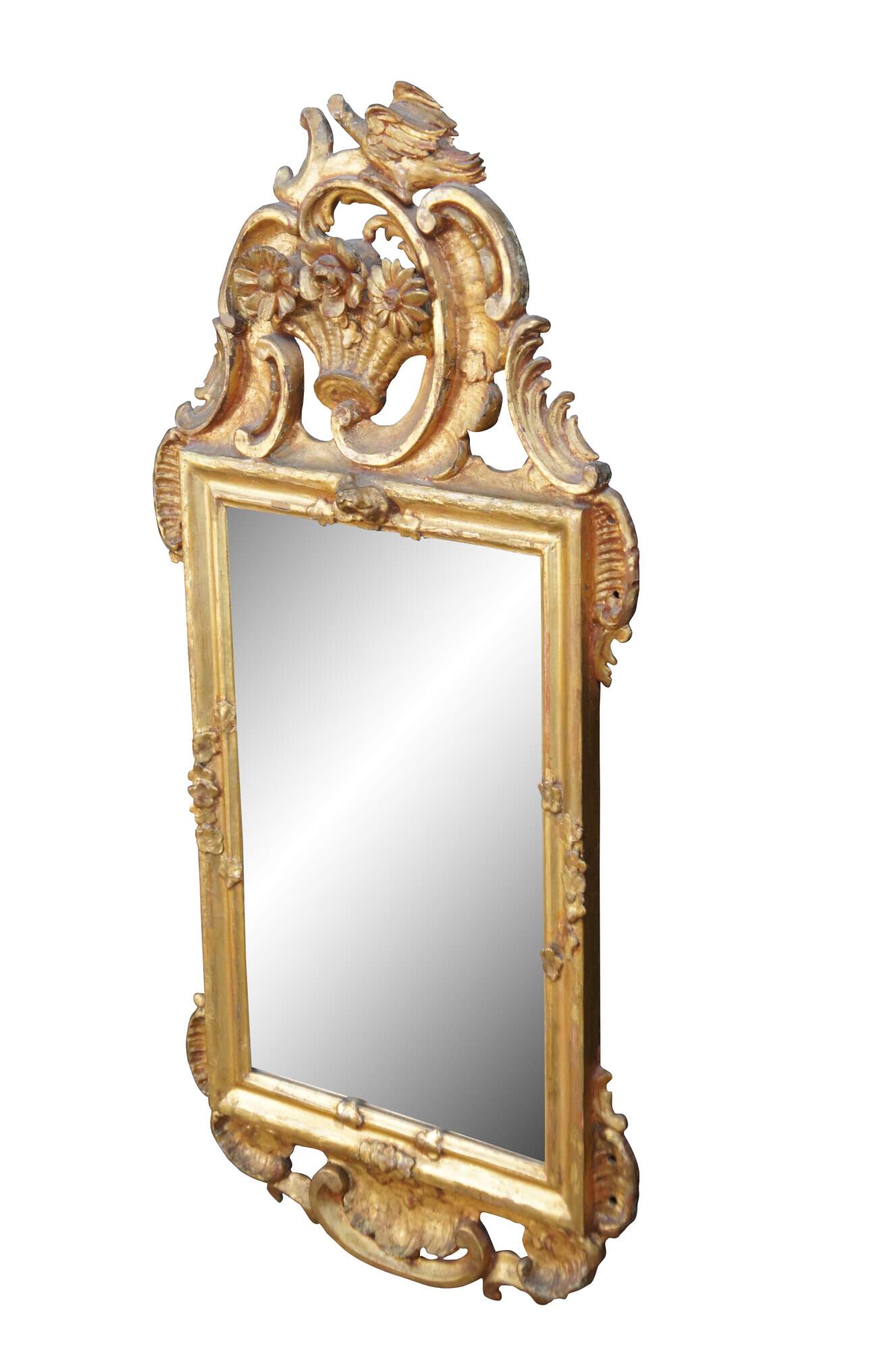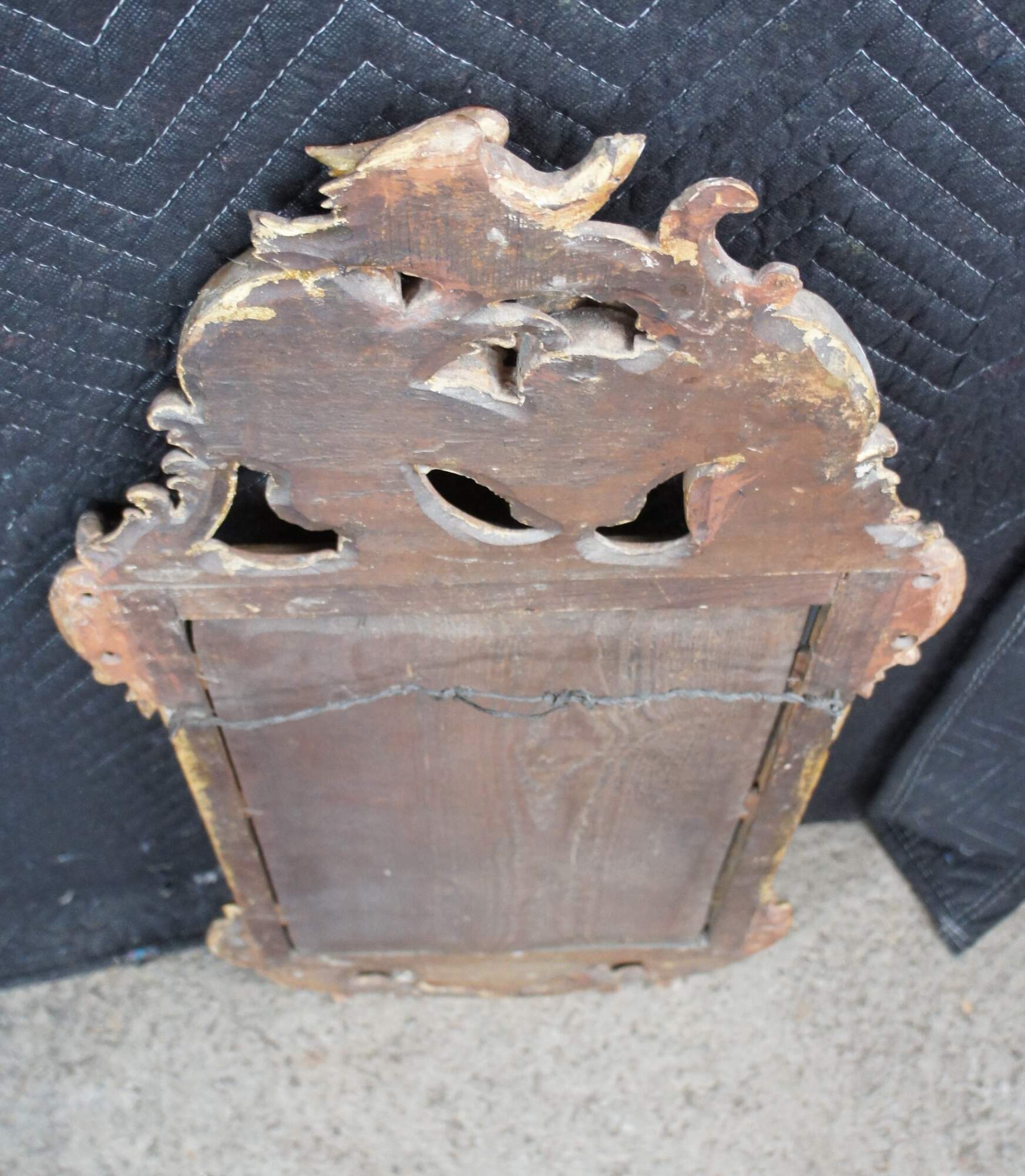 18th Century Baroque Carved Mirror. Features a scalloped oak frame with an intricate 'c' scrolling crown centered by basket with a daisy, hibiscus and rose. The frame is topped by a central facing dove. Mirror is single glass plate.