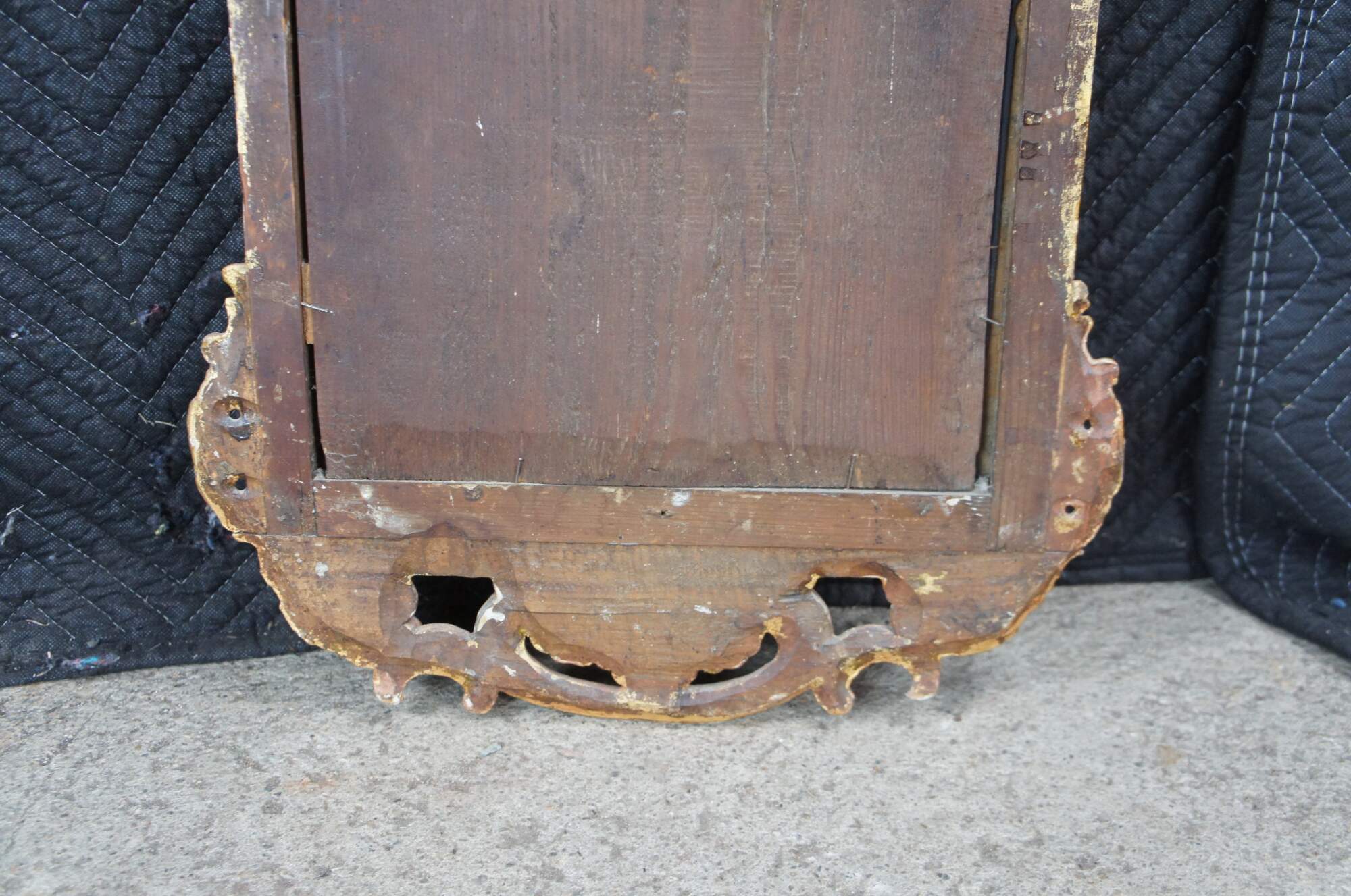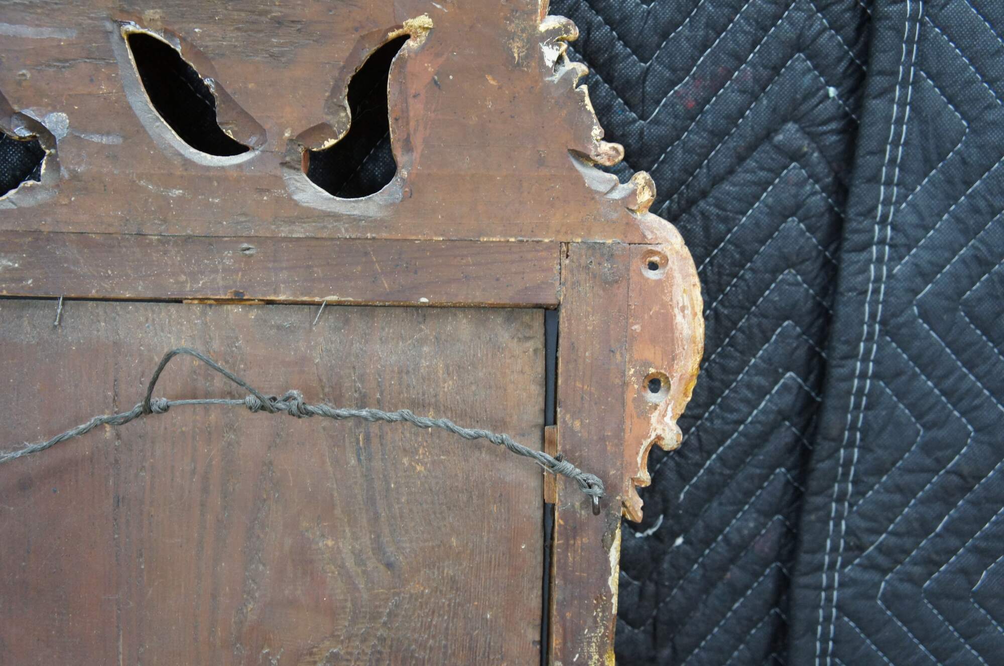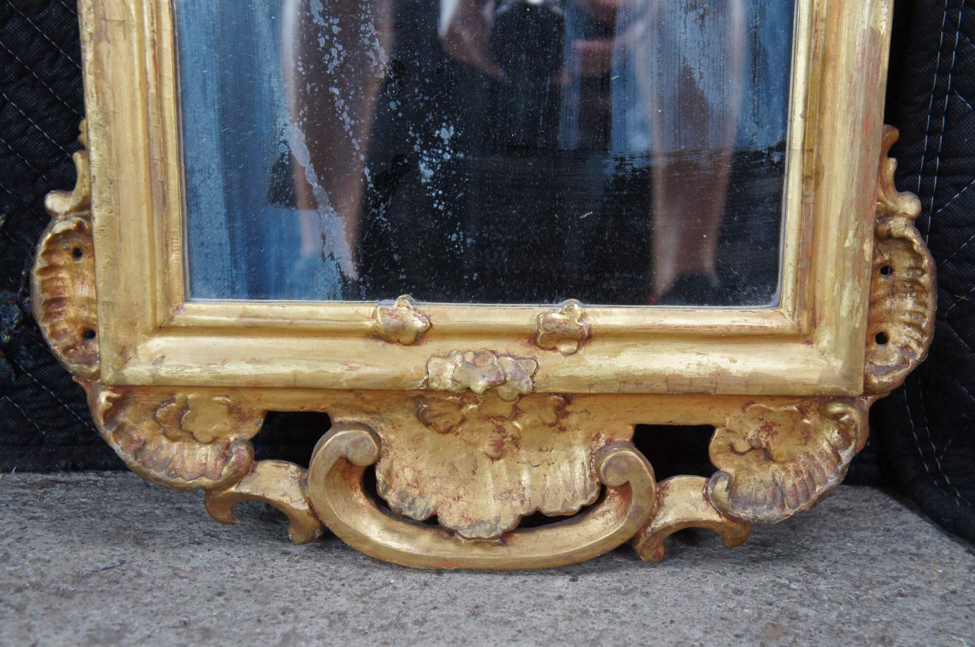 18th Century Baroque Carved Mirror. Features a scalloped oak frame with an intricate 'c' scrolling crown centered by basket with a daisy, hibiscus and rose. The frame is topped by a central facing dove. Mirror is single glass plate.