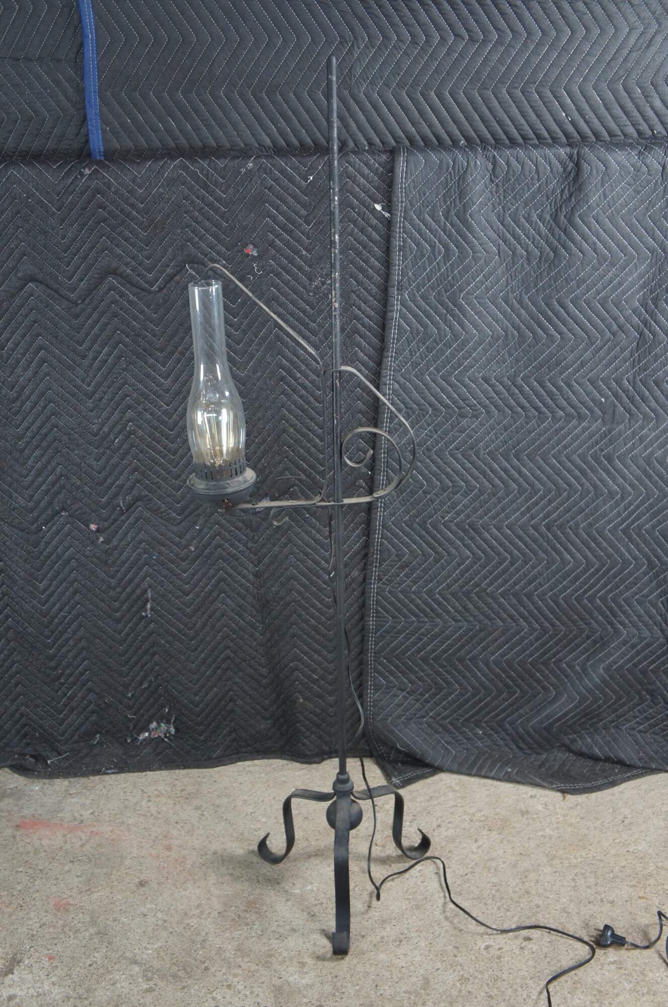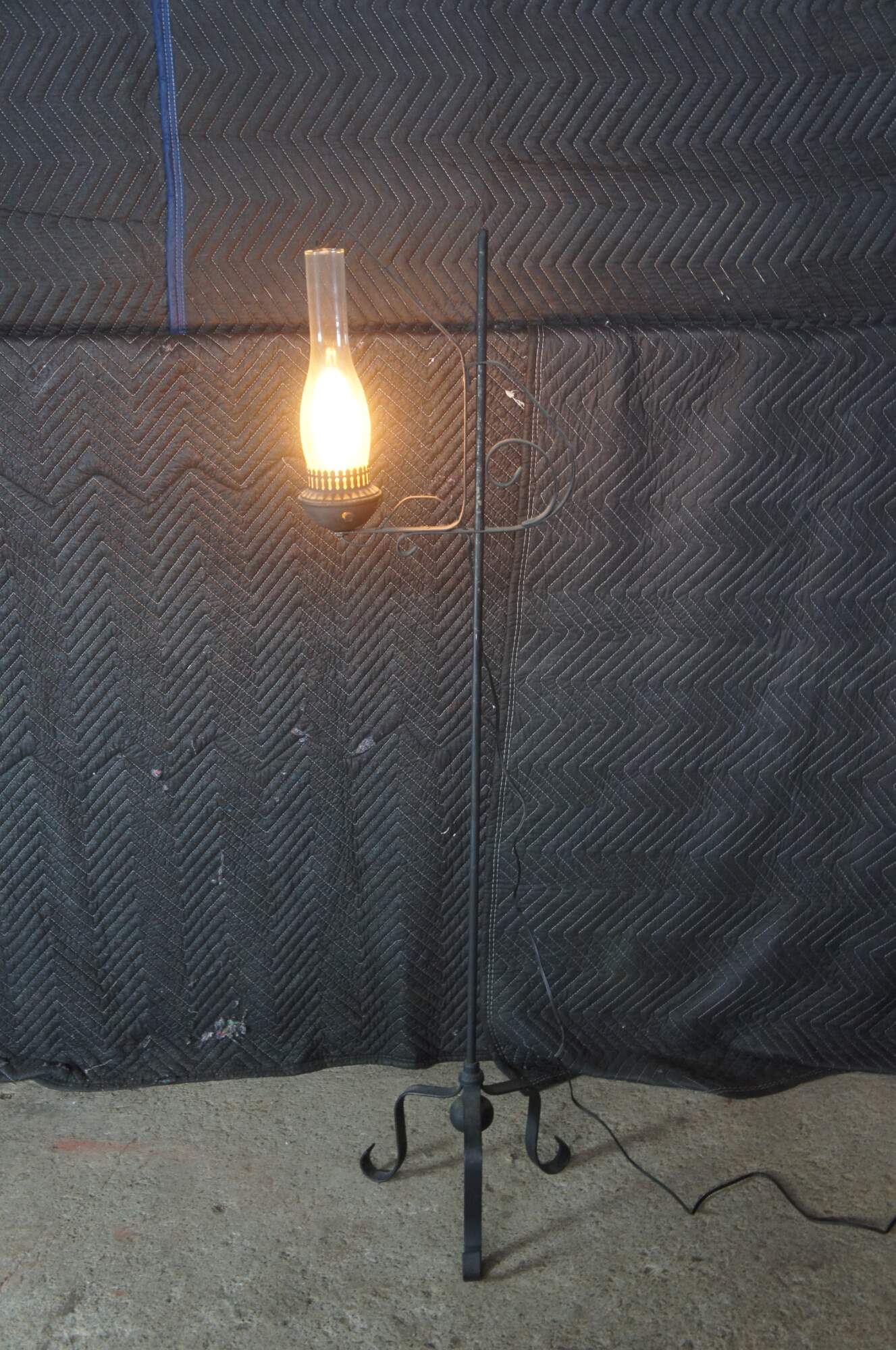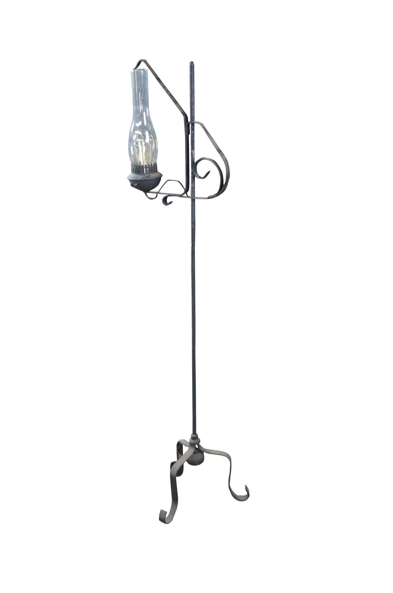 Primitive antique Spanish Revival Colonial style converted candle stand. Features adjustable hurricane lantern over a wrought iron rod with tripod scrolled base. The lantern would have originally operated with the use of a candle and was later electrified for use in our modern times. The hurricane adjusts to any height along the rod. A charming addition to any space.