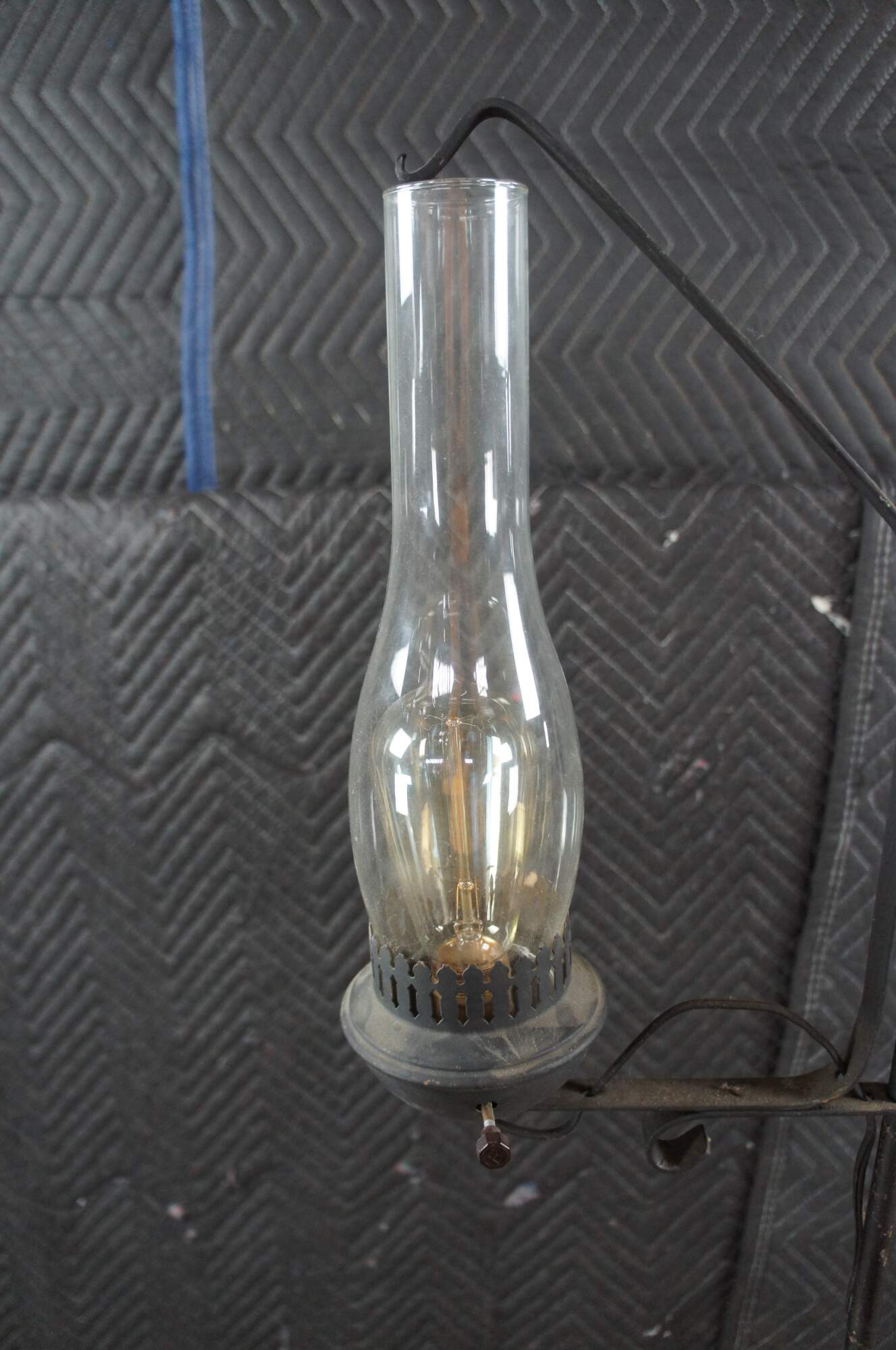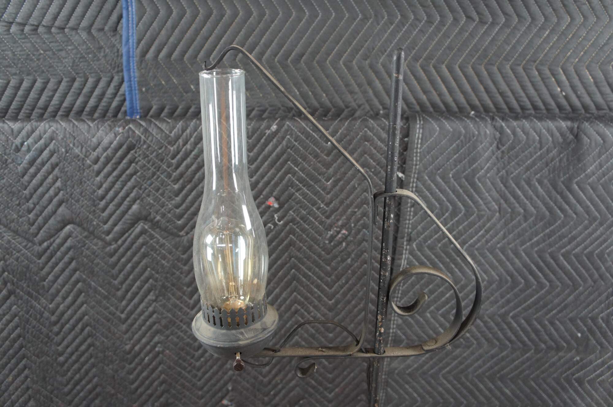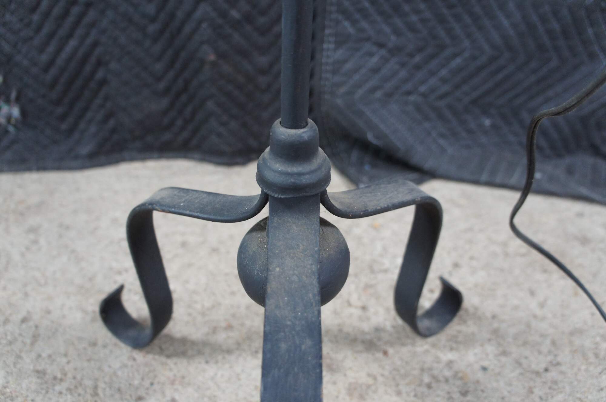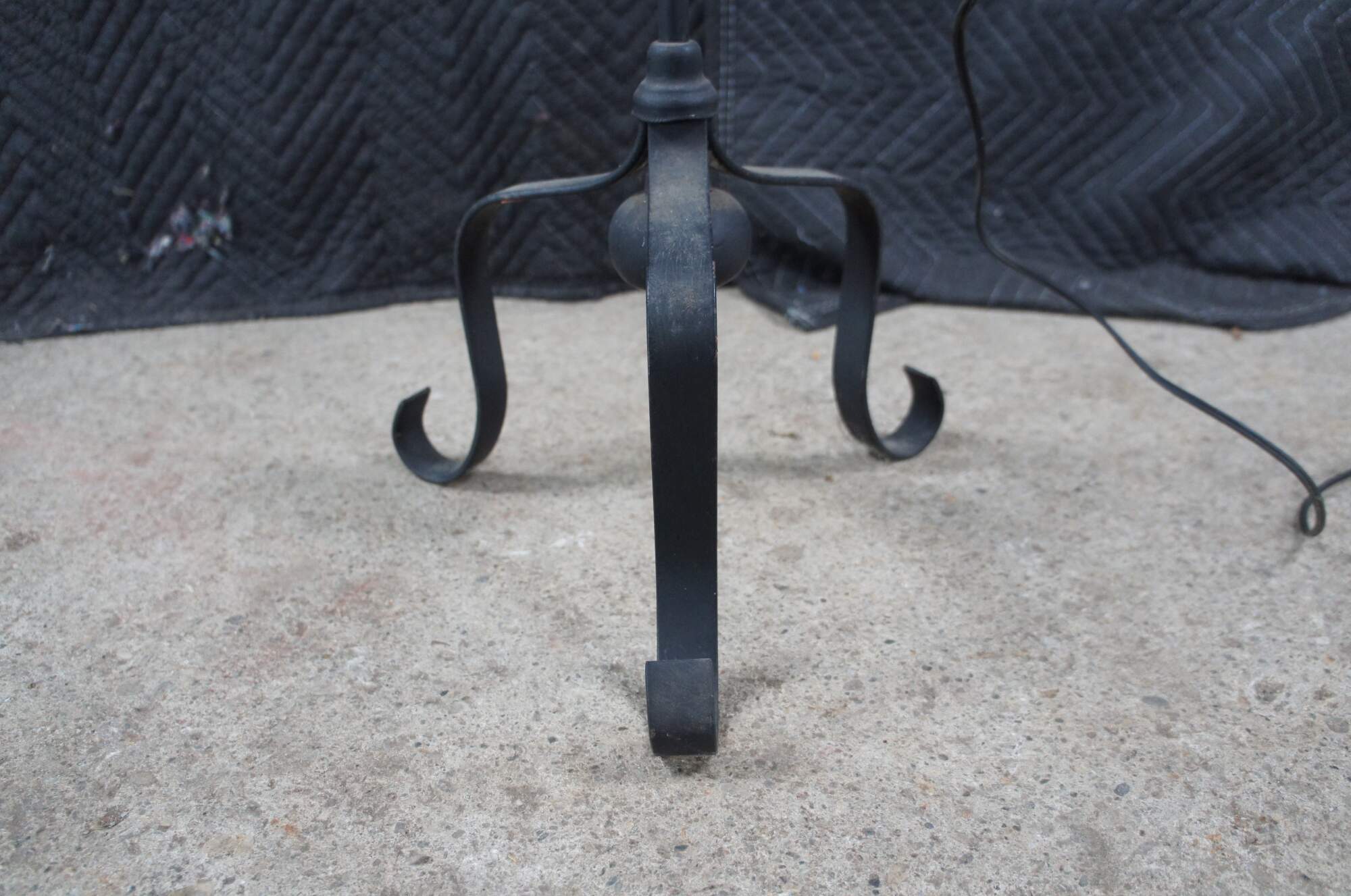 Primitive antique Spanish Revival Colonial style converted candle stand. Features adjustable hurricane lantern over a wrought iron rod with tripod scrolled base. The lantern would have originally operated with the use of a candle and was later electrified for use in our modern times. The hurricane adjusts to any height along the rod. A charming addition to any space.