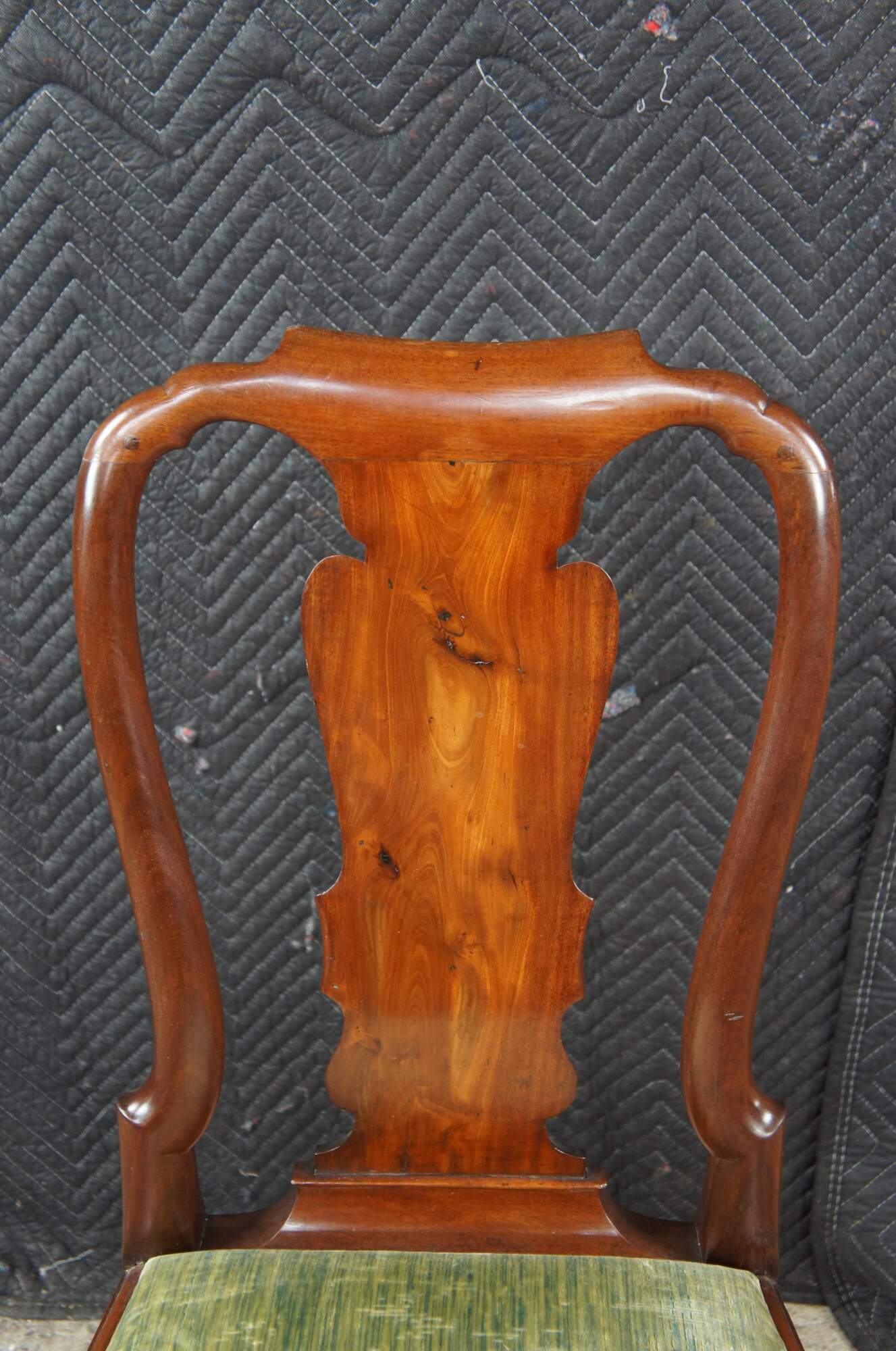 A rare set of 6 mid 18th century American Queen Anne dining chairs. Made from solid mahogany with a curved crest rail over traditional Queen Anne backsplat, flanked by curvaceous stiles leading to green felt lined seats. The chairs are supported by cabriole legs with trifid feet along the front and stump legs at the rear. Constructed via mortise and Tenon joinery. The chair seats are easily removed for re-upholstery. A remarkable set with a warm and rich wood tone and beautiful wood grain. The perfect addition to any space.