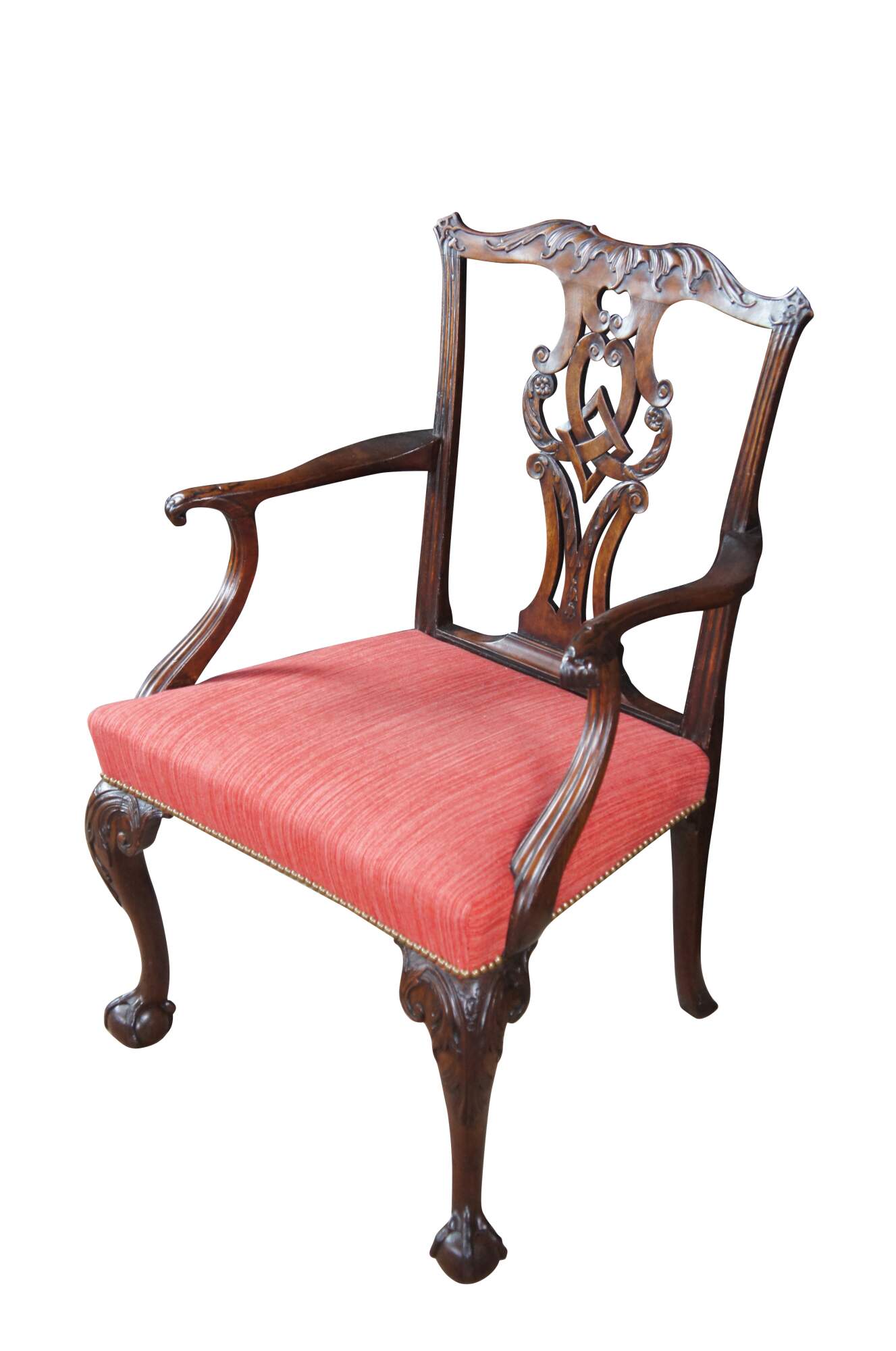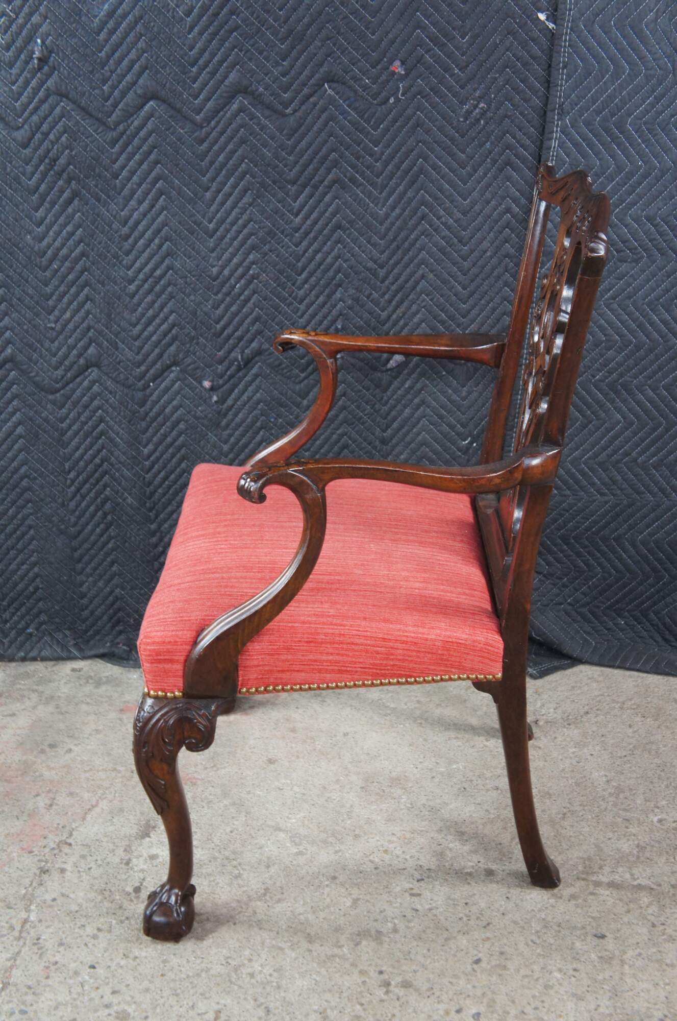 Antique 18th Century Irish Chippendale Arm Chair. Made from mahogany with a serpentine carved crest rail featuring fretwork carved ears over an interlaced pierced urn-shaped splat with scrolling acanthus carvings flanked by fluted stiles and shapely knuckle carved arms over a red upholstered seat with brass nailhead trim. The chair is supported by cabriole legs with acanthus carved knees and shapely ball and claw feet.