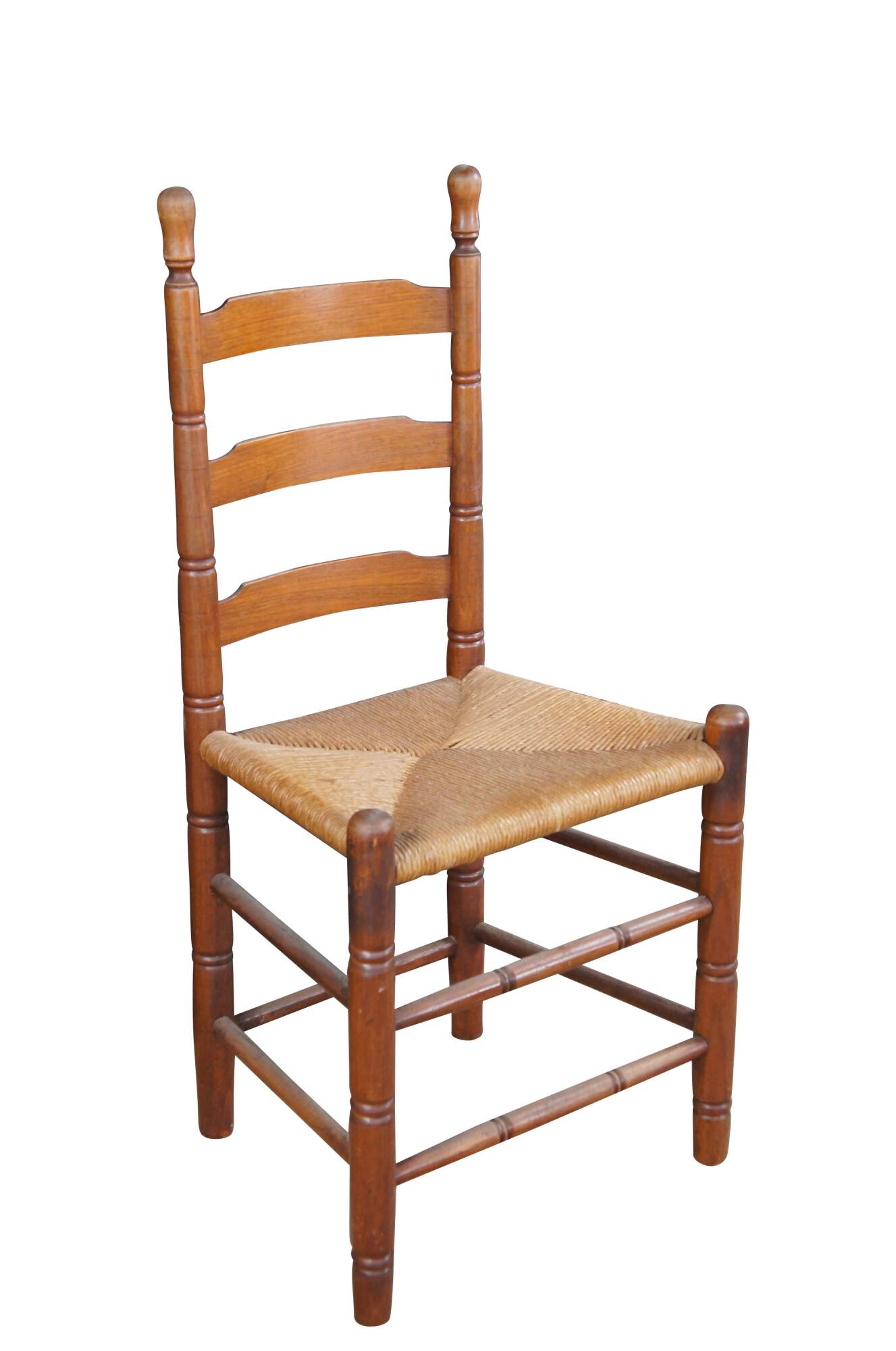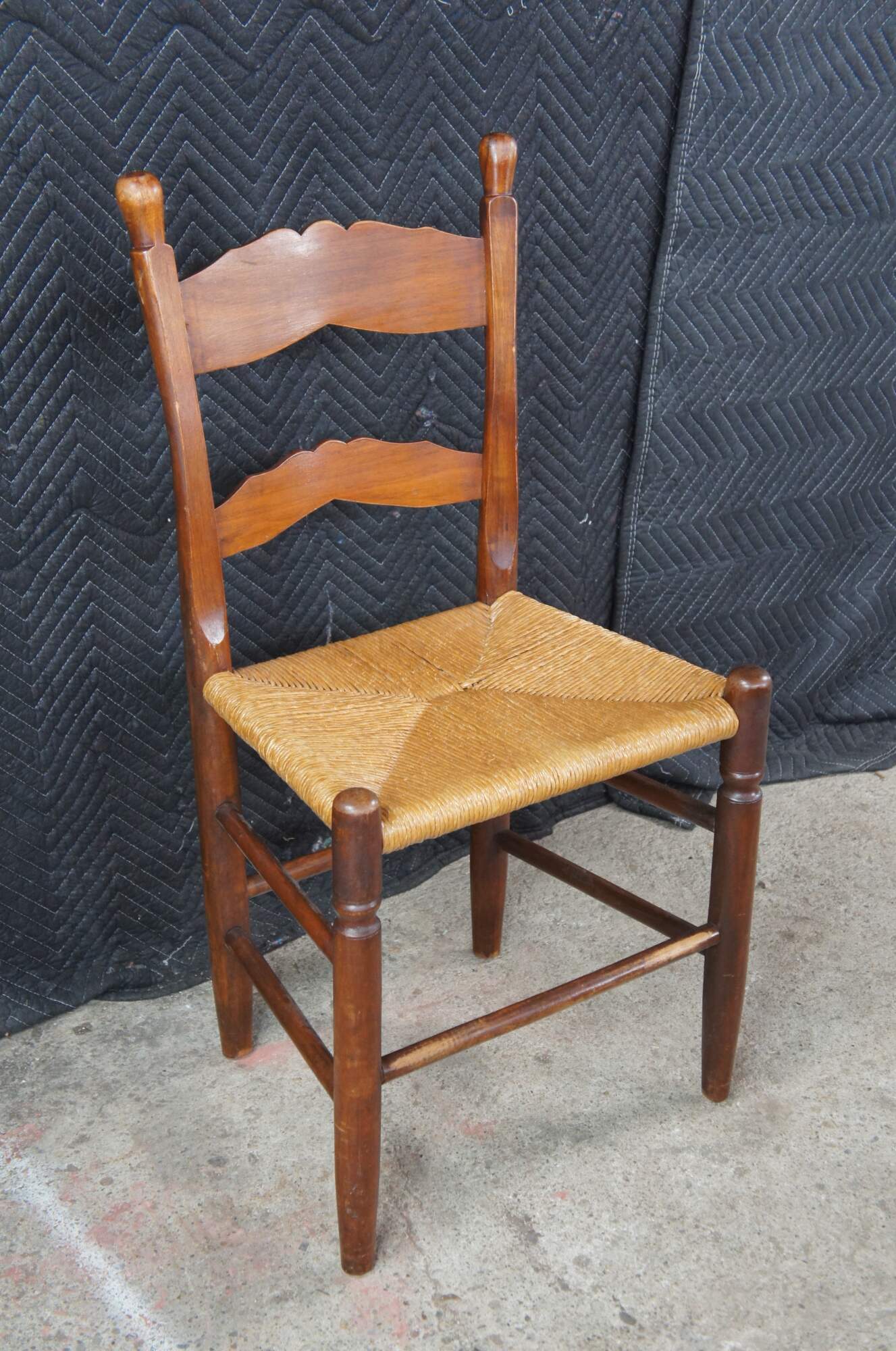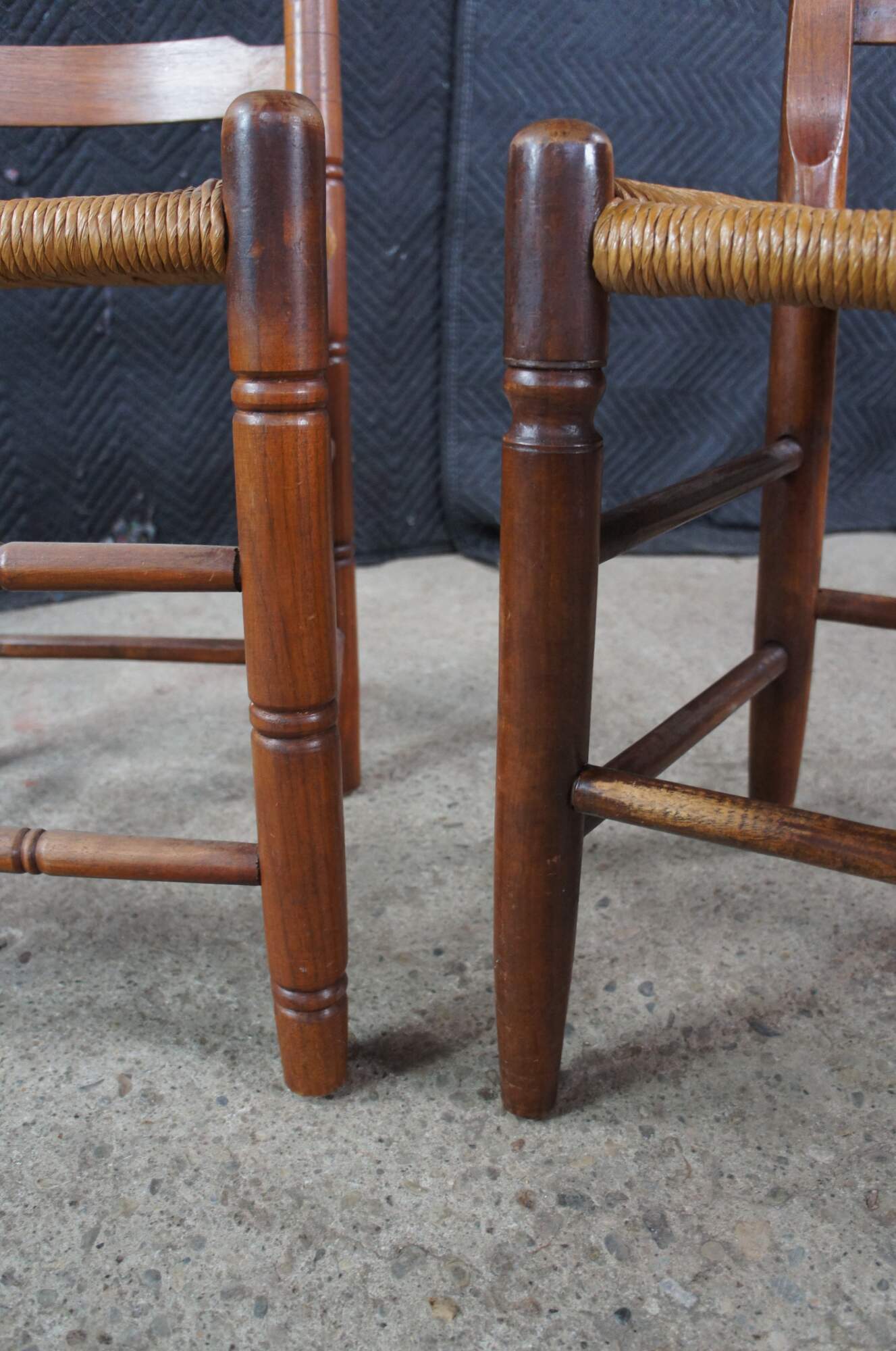 2 antique Shaker style side chairs. Mismatched set with different ladder back styles. Made from mahogany with rush seat over ring turned legs.