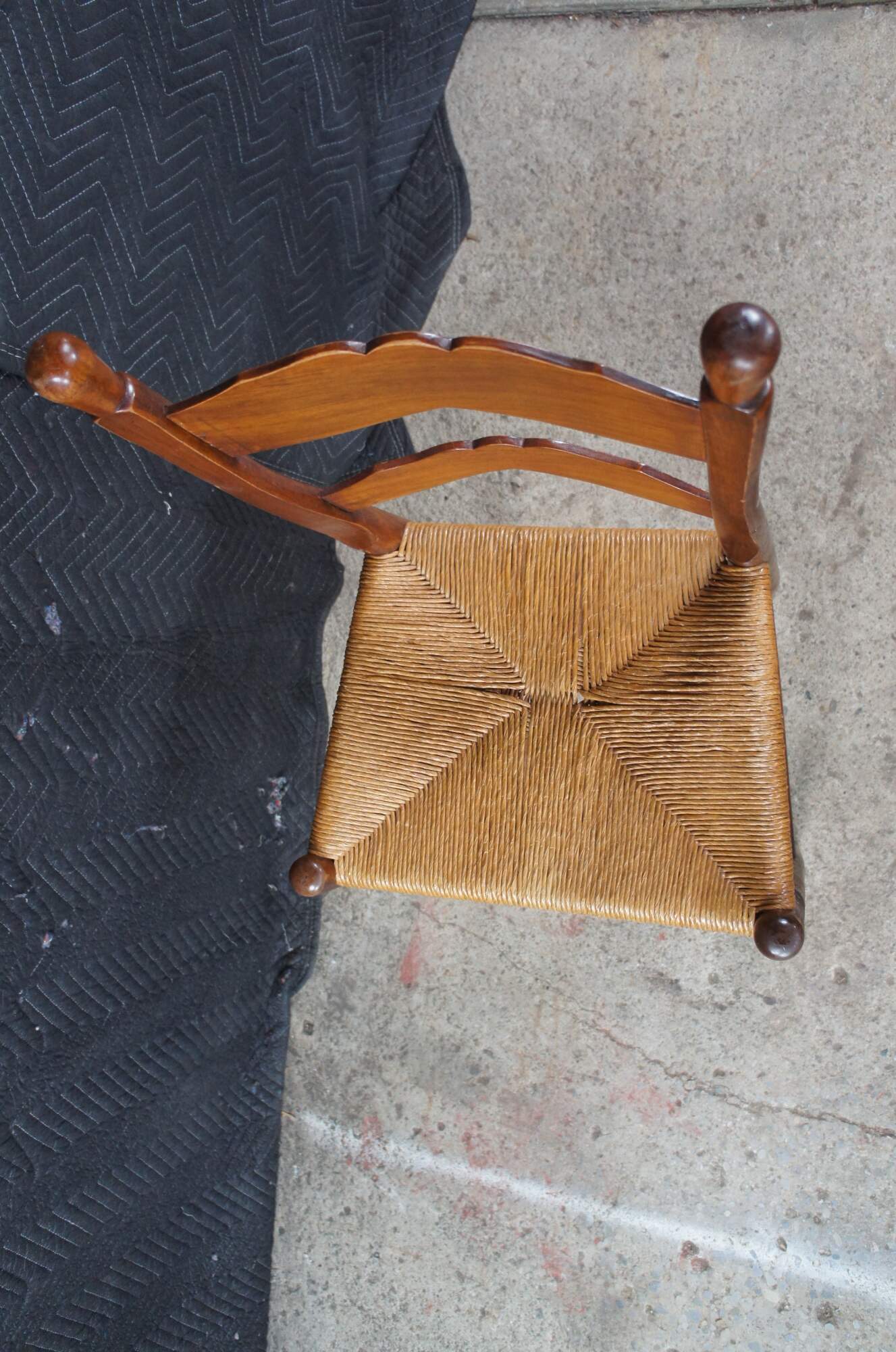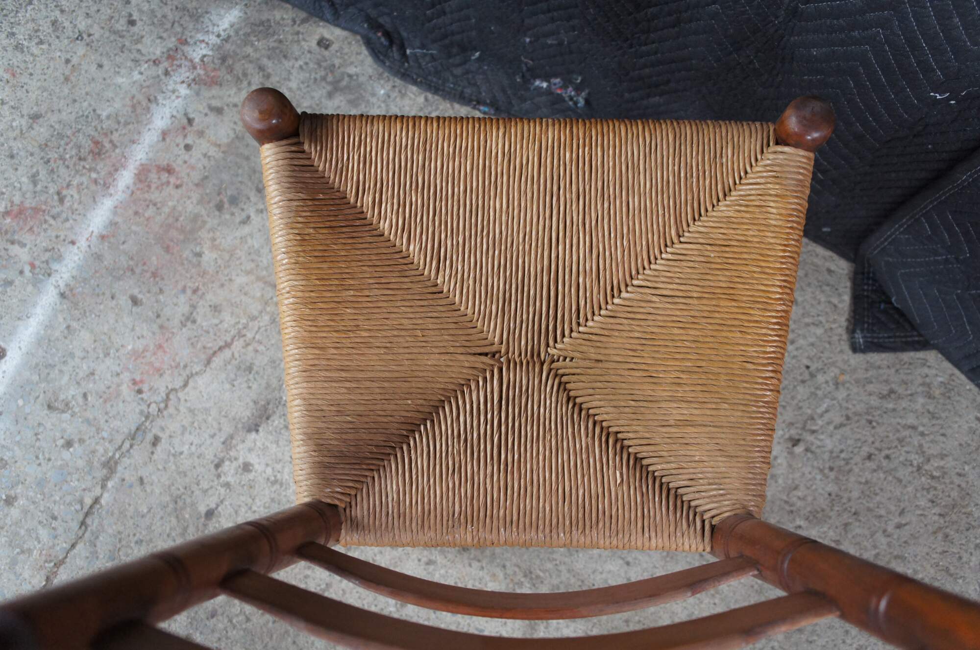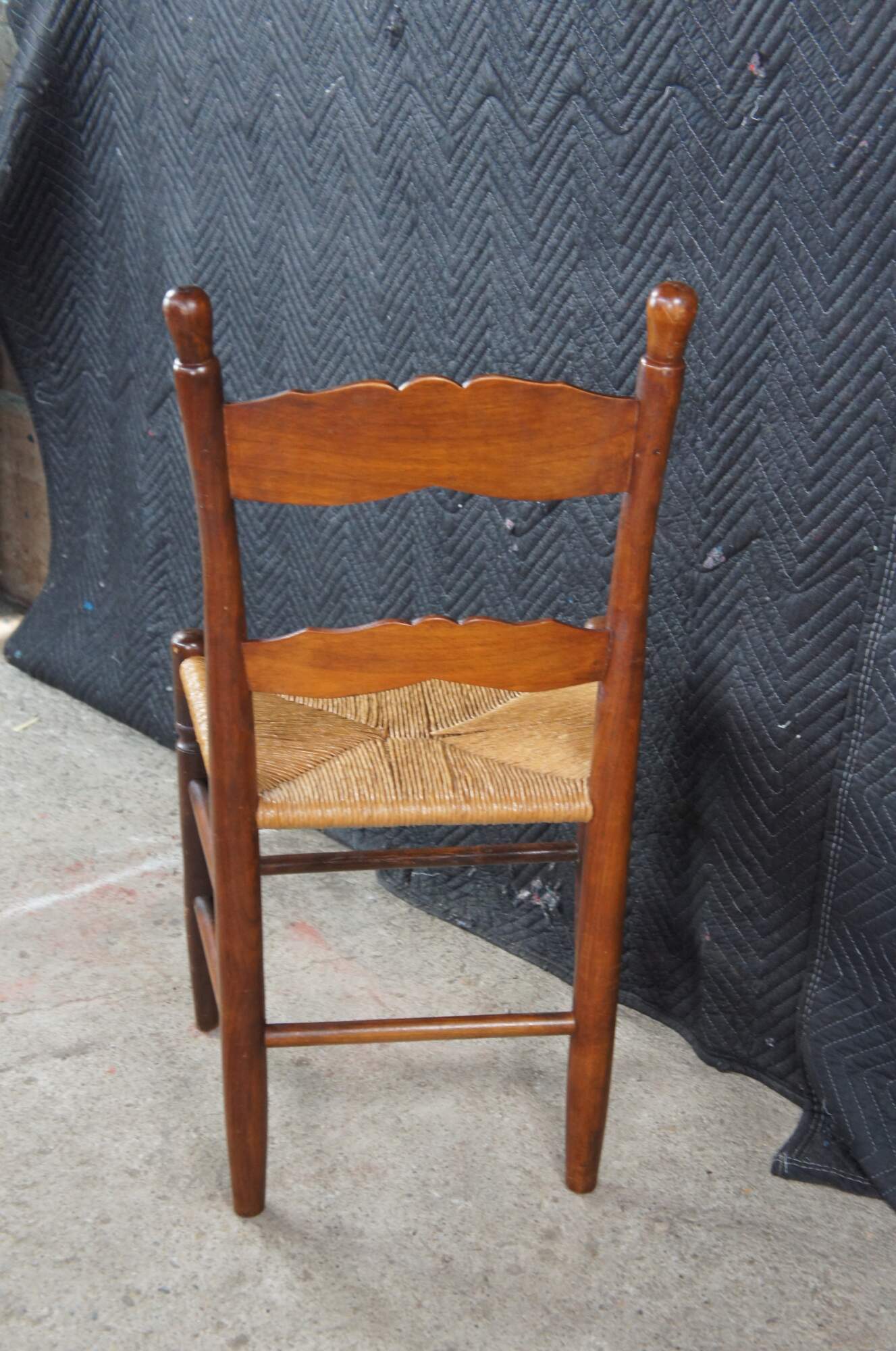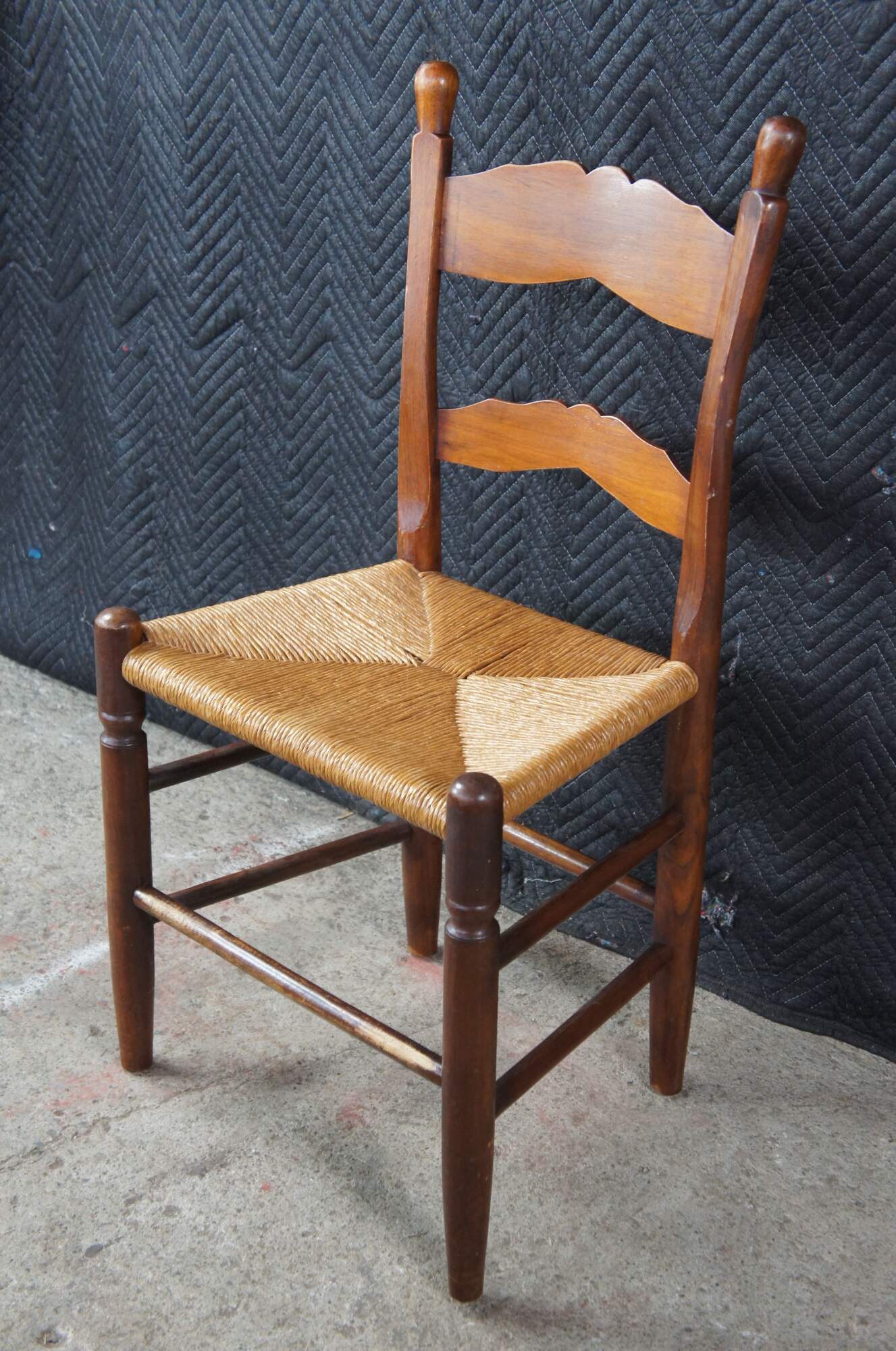 2 antique Shaker style side chairs. Mismatched set with different ladder back styles. Made from mahogany with rush seat over ring turned legs.