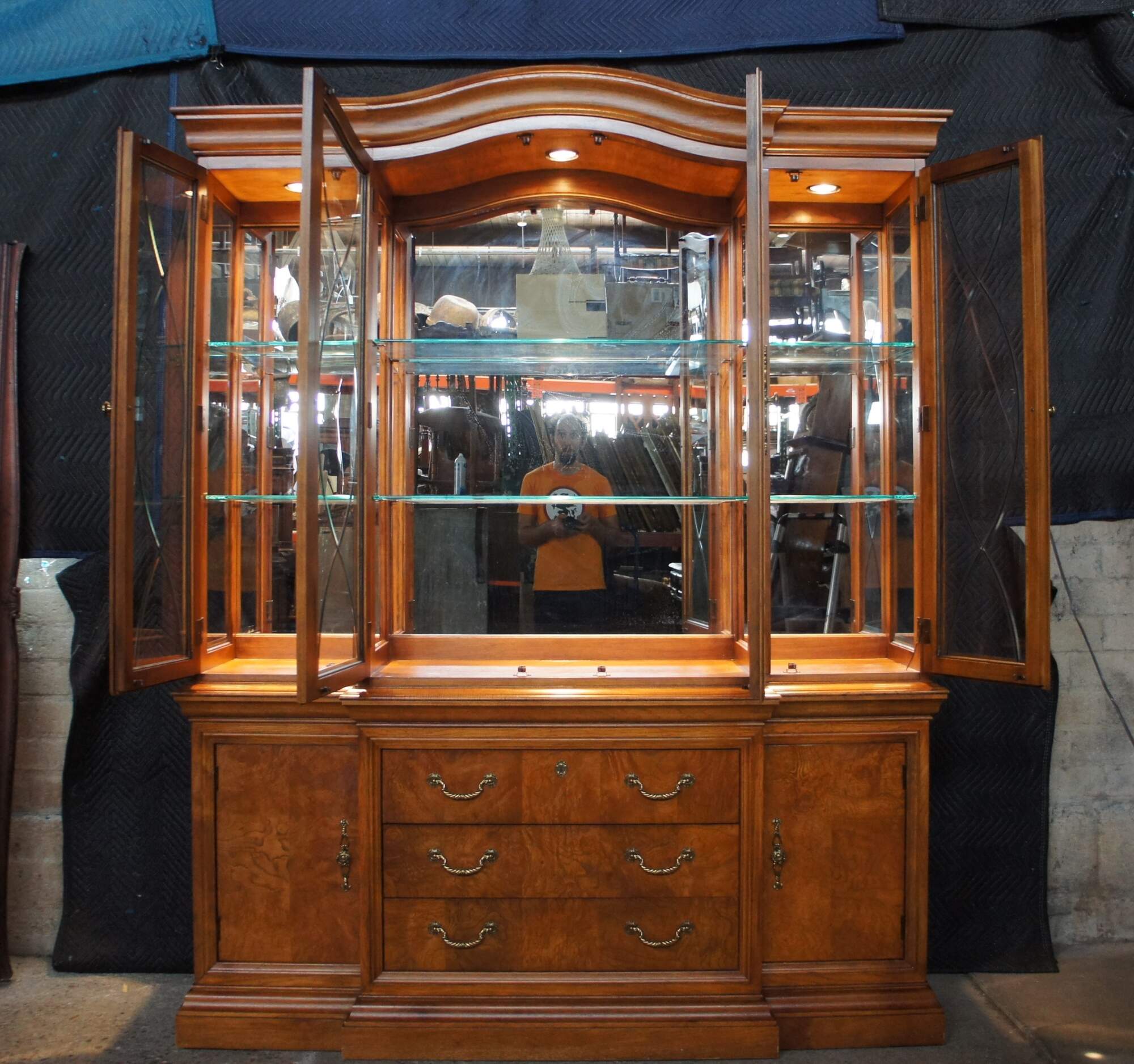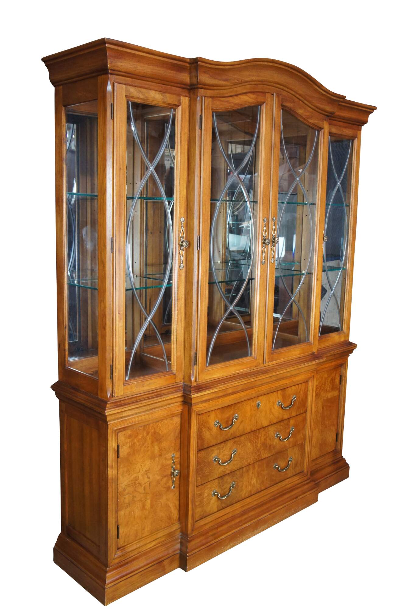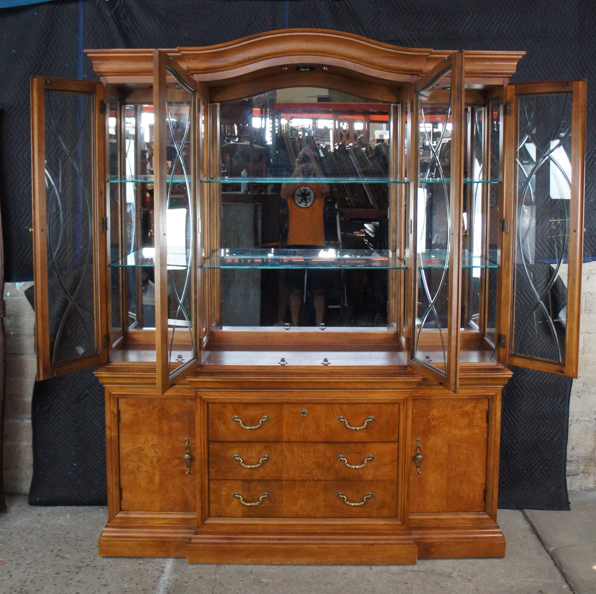 Early 2000s Thomasville Breakfront. Inspired by French Louis Philippe styling. Features an oak frame with beautiful leaded & beveled glass doors over an ash burled buffet portion. The display portion has an arched and beveled top that opens to two pencil polished glass shelves and a mirrored backing. Interior illuminates by tapping one of the hinges. The base of the cabinet is centered by three dovetailed drawers with ornate brass bail pulls flanked by two outer cabinets with shelves. A stunning piece that will make a great addition to any space.