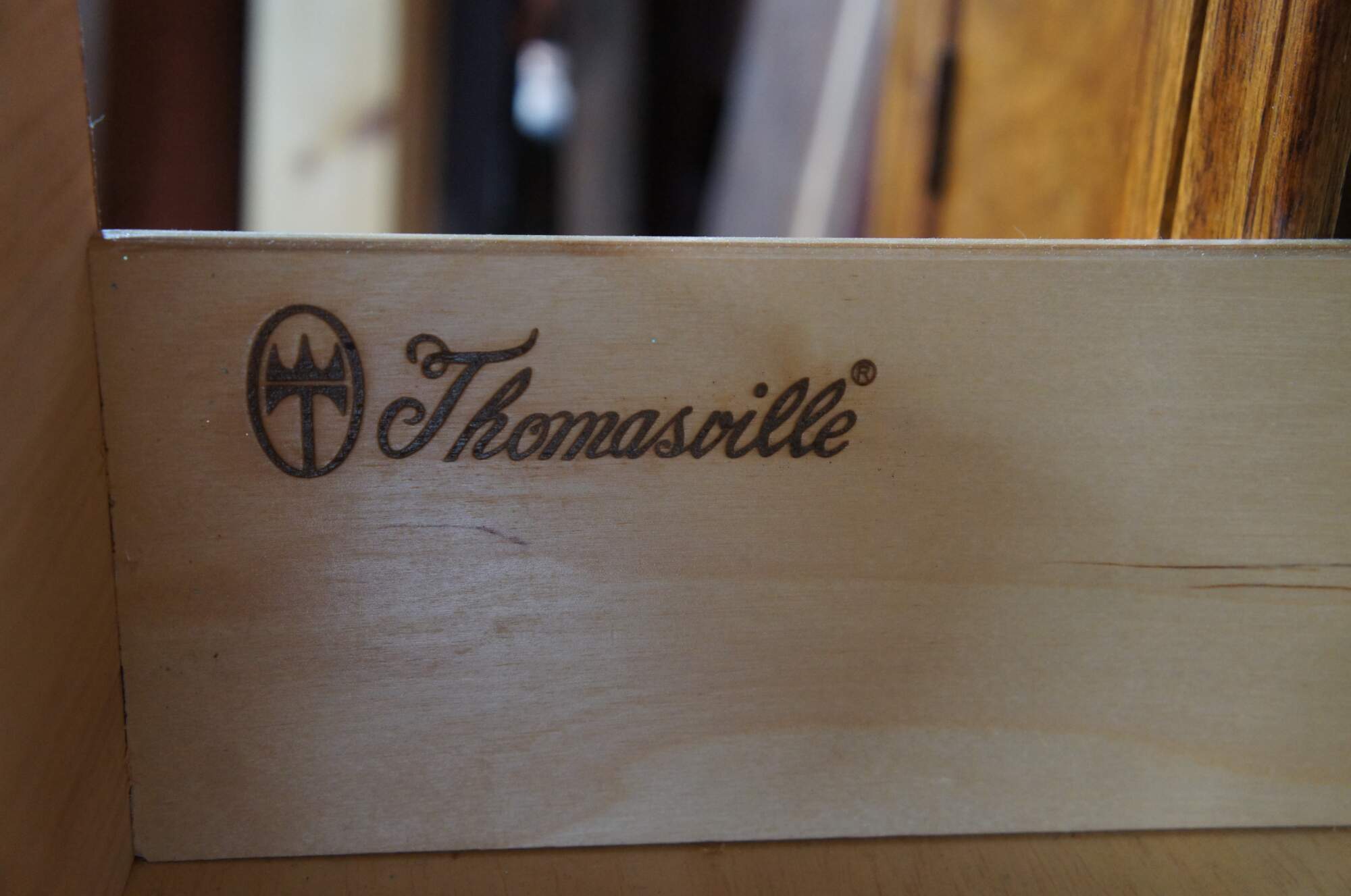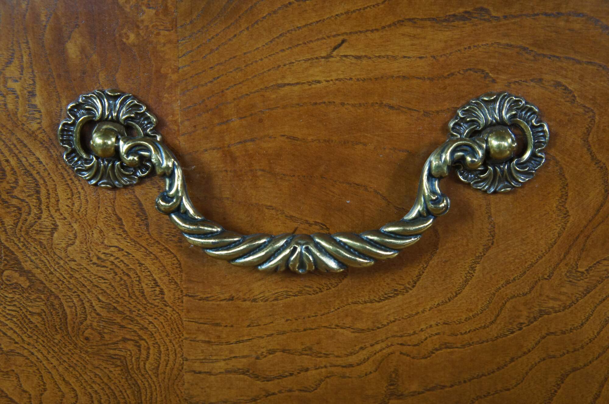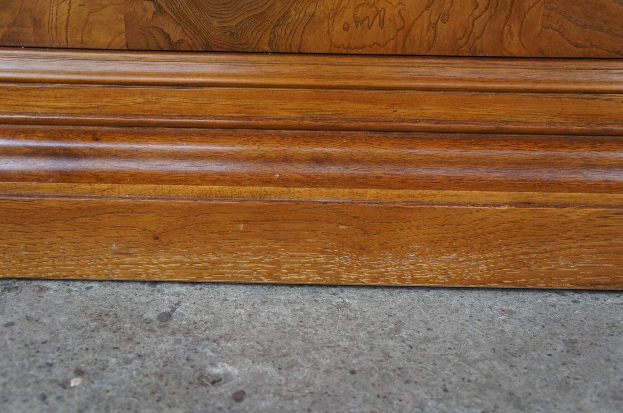Early 2000s Thomasville Breakfront. Inspired by French Louis Philippe styling. Features an oak frame with beautiful leaded & beveled glass doors over an ash burled buffet portion. The display portion has an arched and beveled top that opens to two pencil polished glass shelves and a mirrored backing. Interior illuminates by tapping one of the hinges. The base of the cabinet is centered by three dovetailed drawers with ornate brass bail pulls flanked by two outer cabinets with shelves. A stunning piece that will make a great addition to any space.