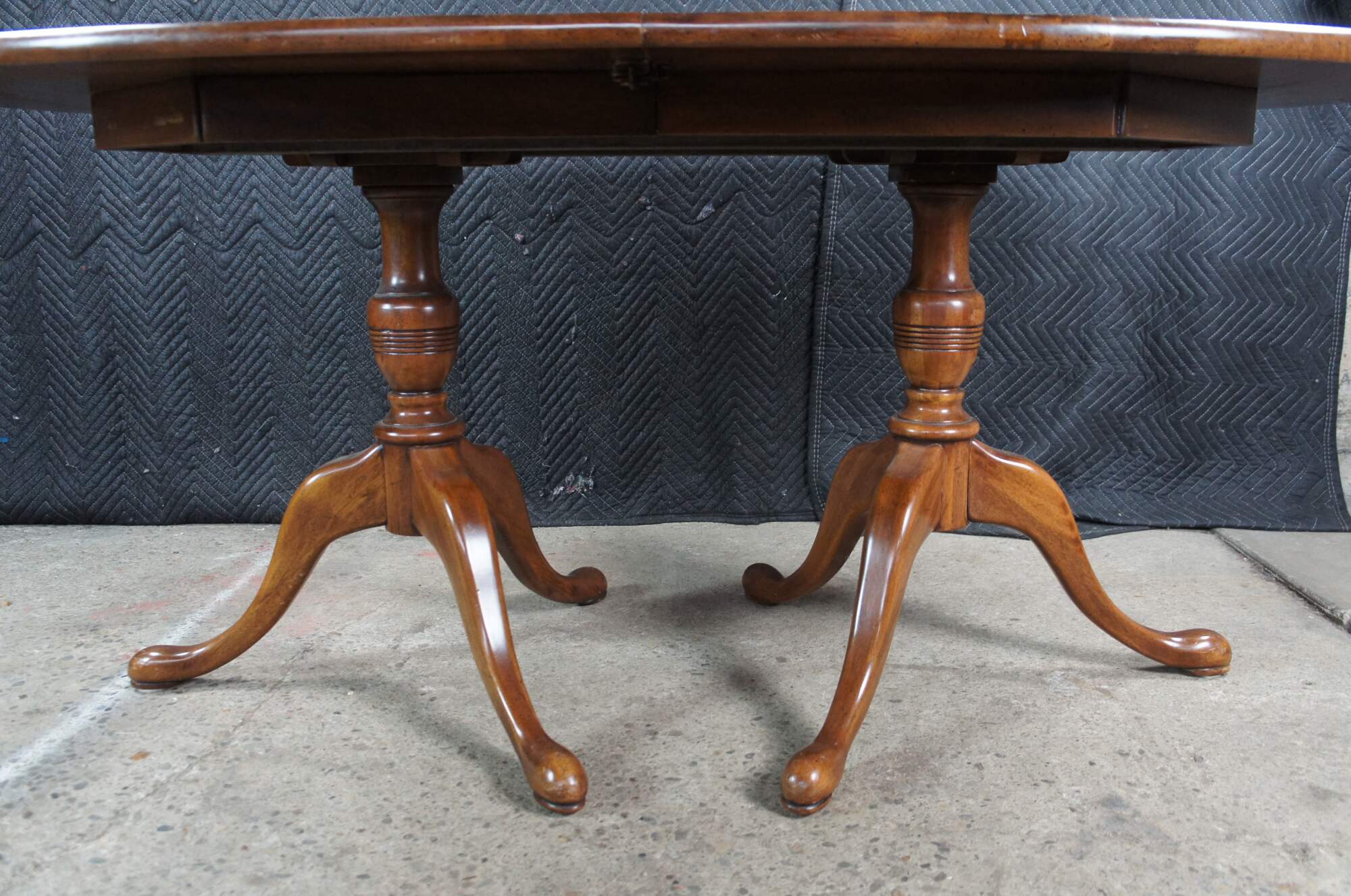 Vintage Davis Cabinet Company Cumberland Valley Oval Dining Table #1257, circa 1960s. Features a distressed walnut construction over a double pedestal base with ring turned baluster supports over downswept legs with pad feet.