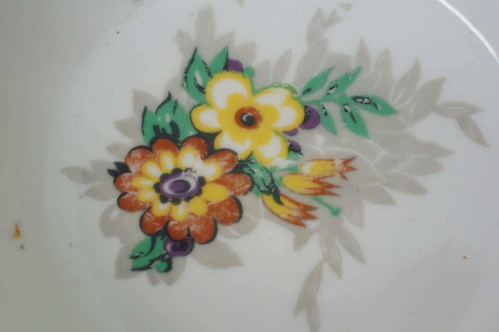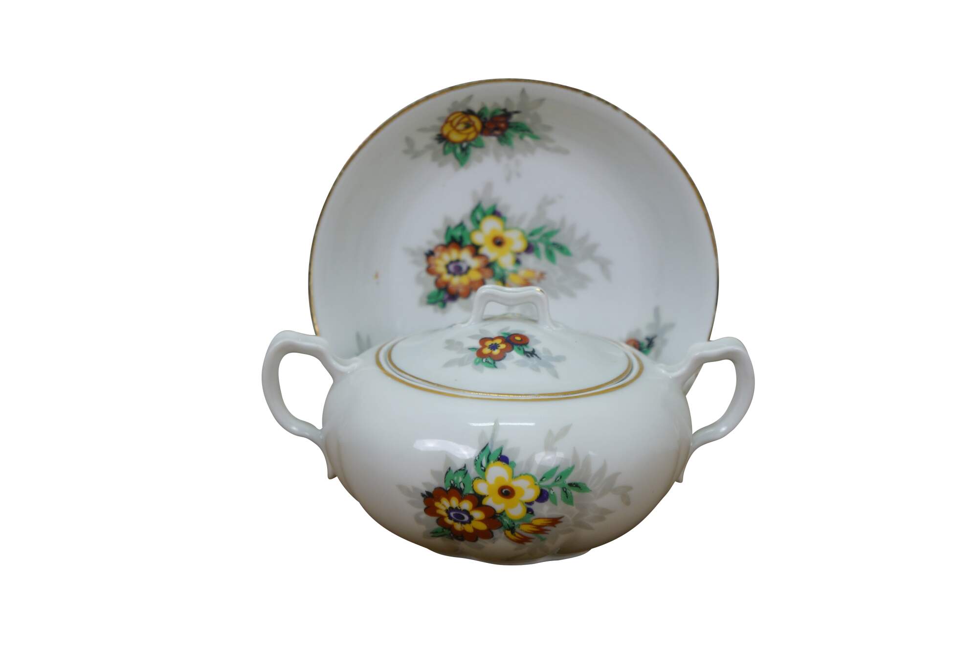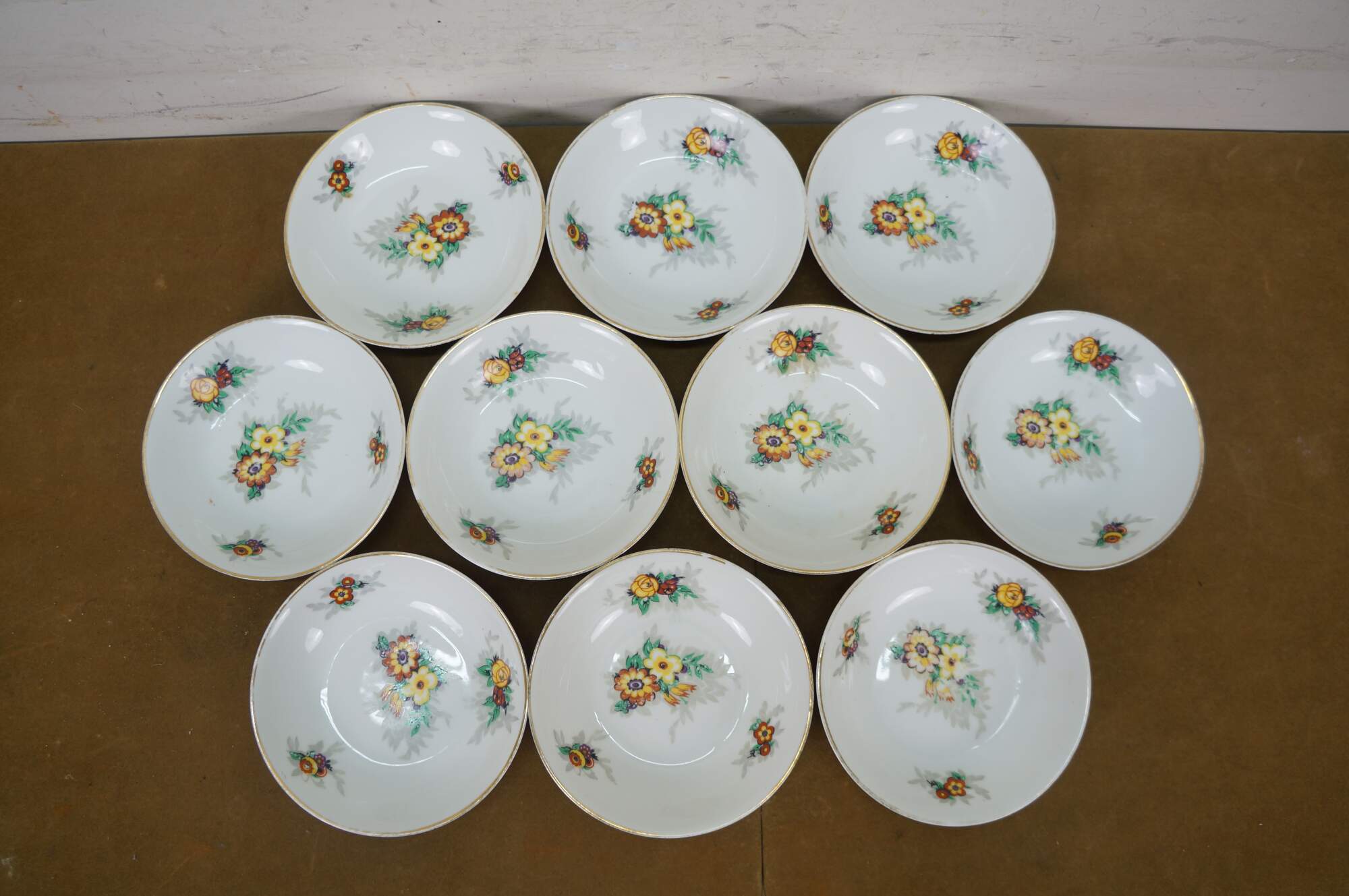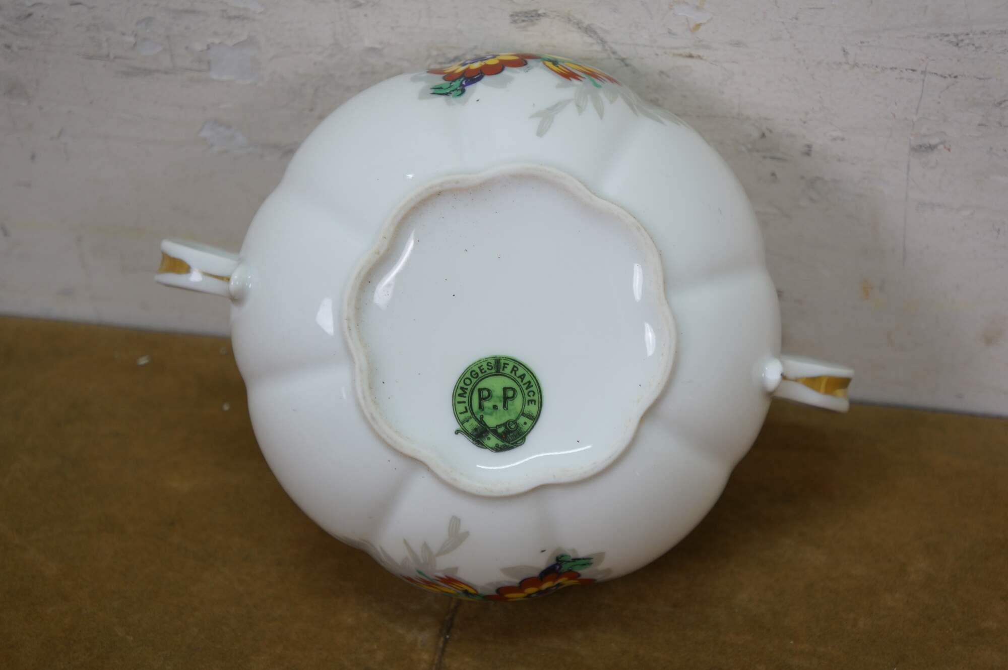 Early to mid 20th century set of ten custard dishes and sugar bowl with lid. White porcelain with gilr edge and printed floral design in red, yellow, green, and gray. Attributed to Pierre & Paul Paroutaud.