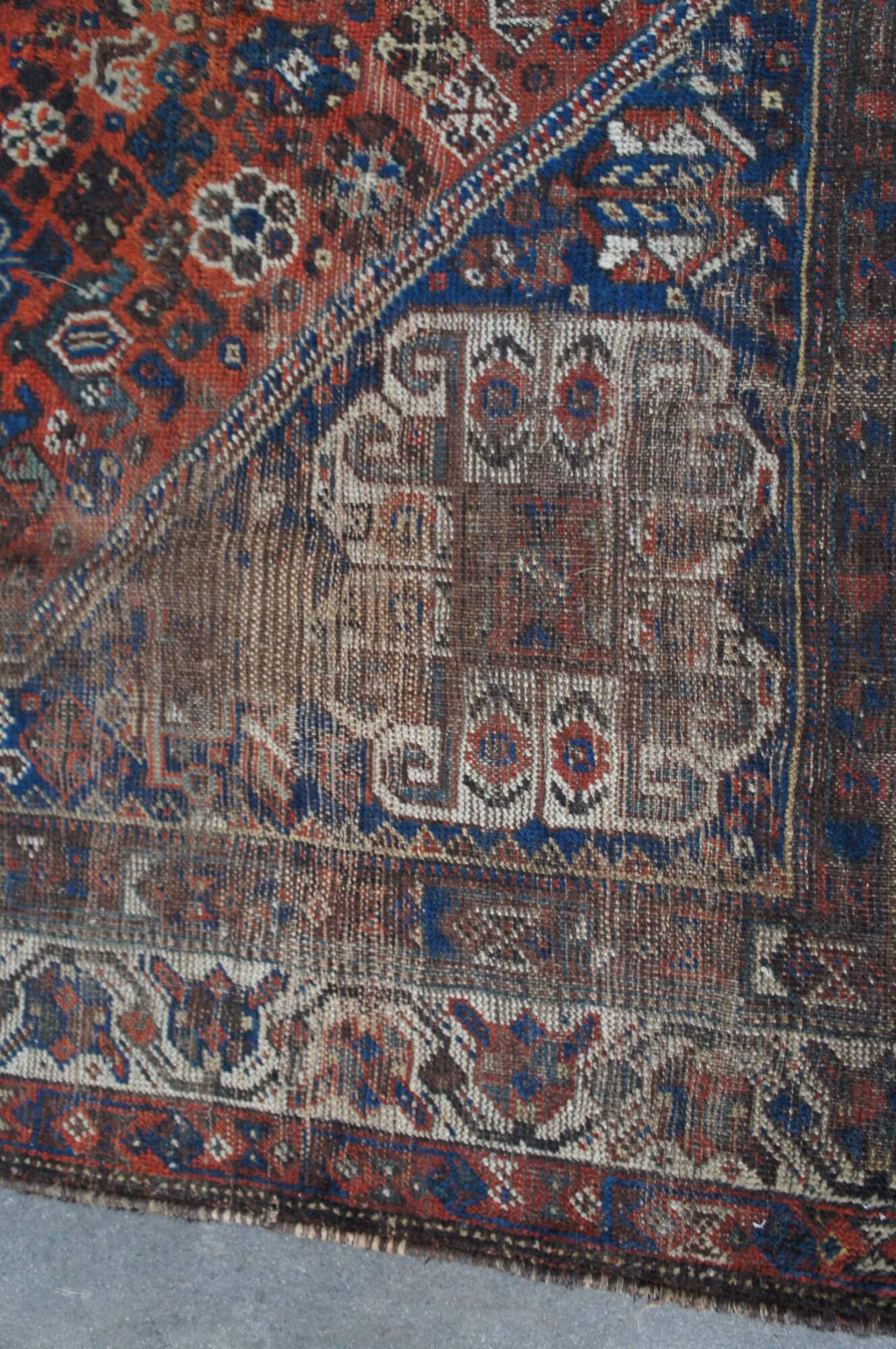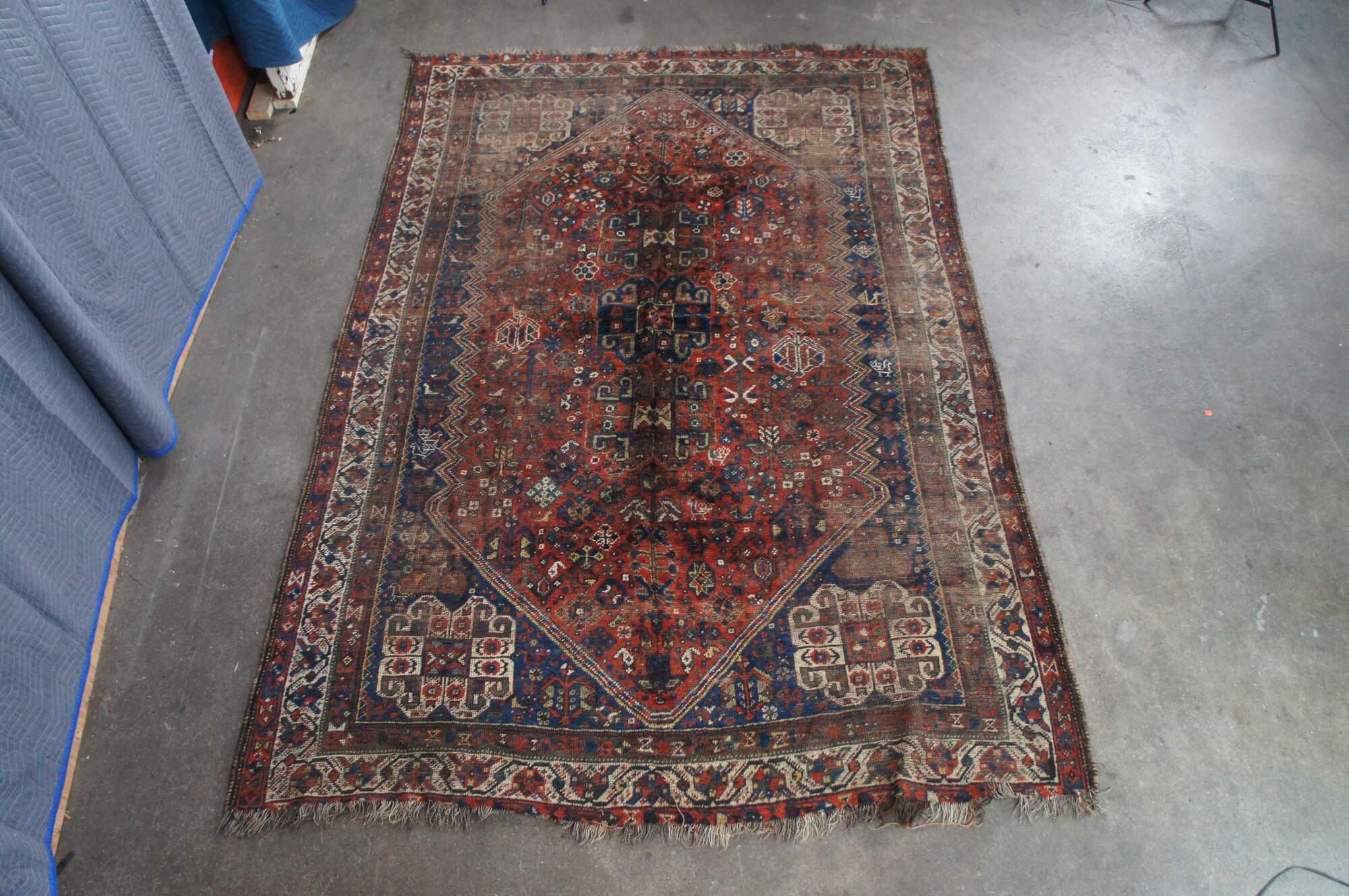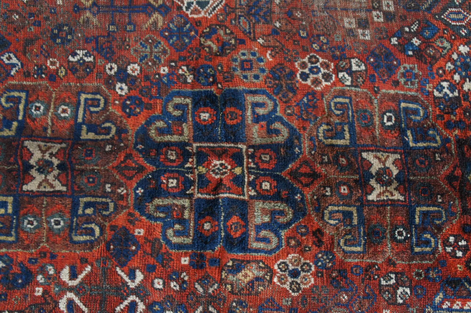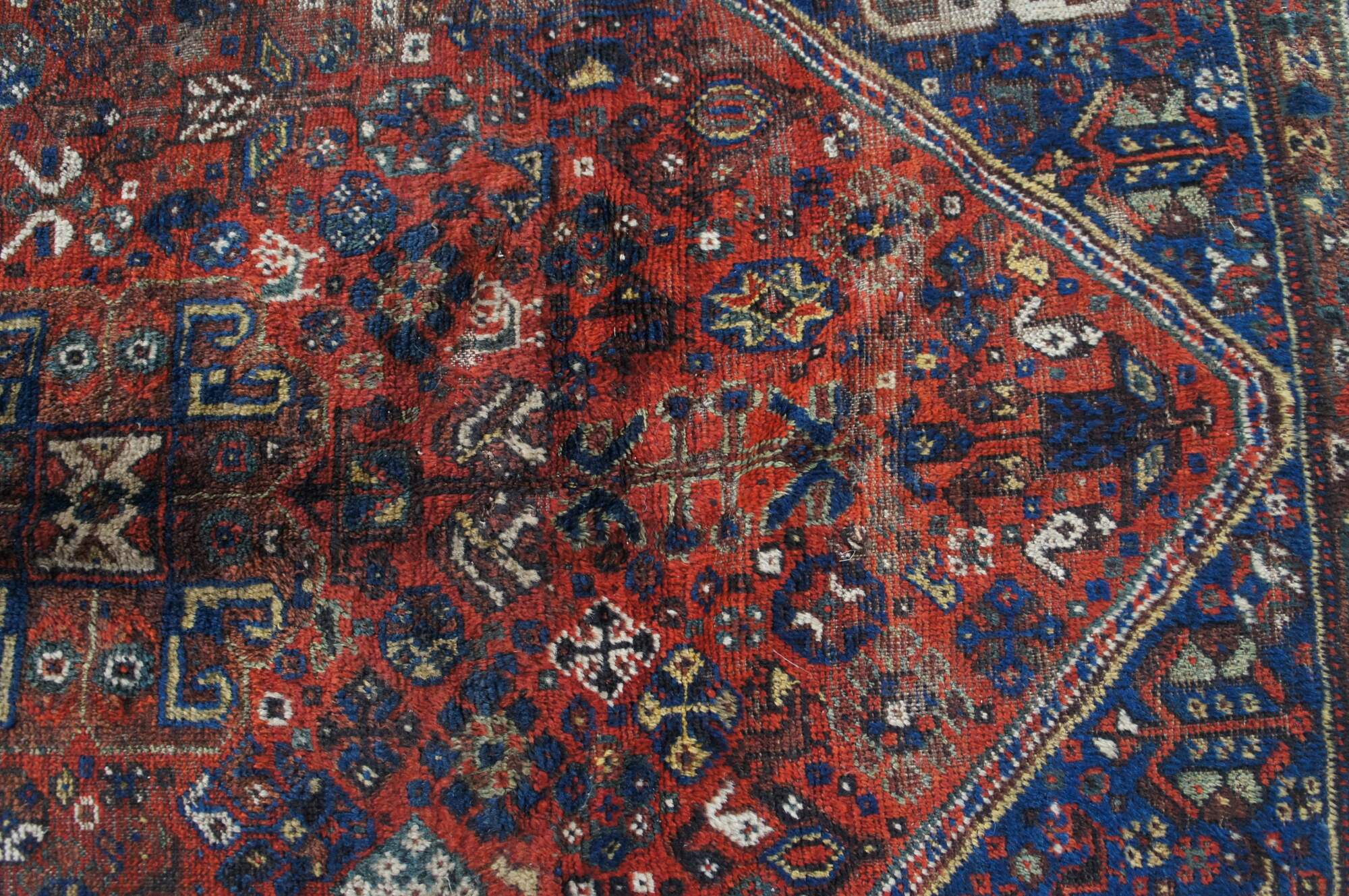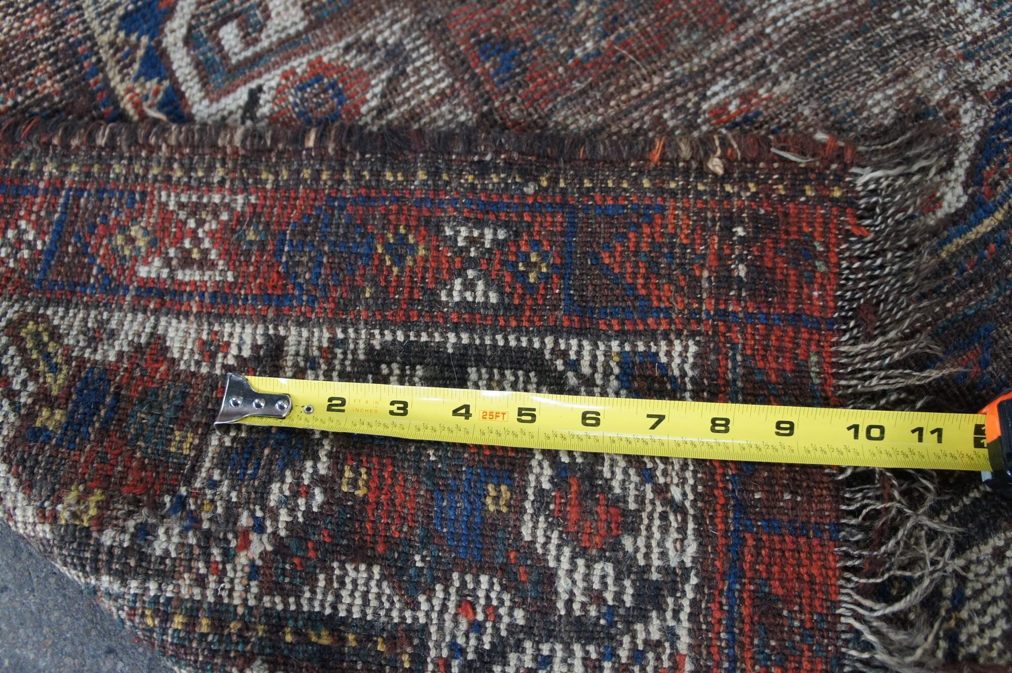 A beautiful vintage hand woven wool area rug. Features a geometric pattern with red and blue foreground accented by beige.