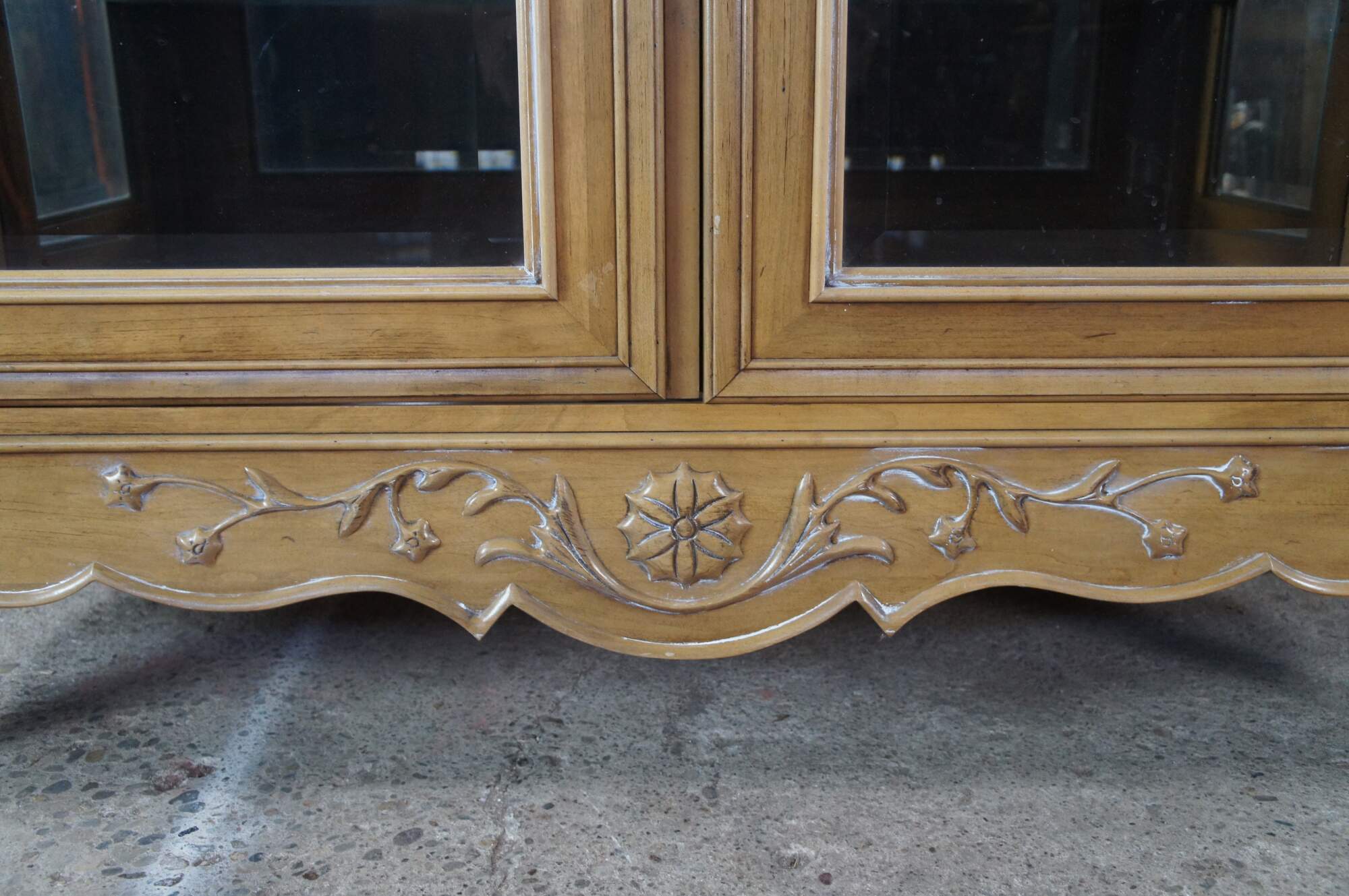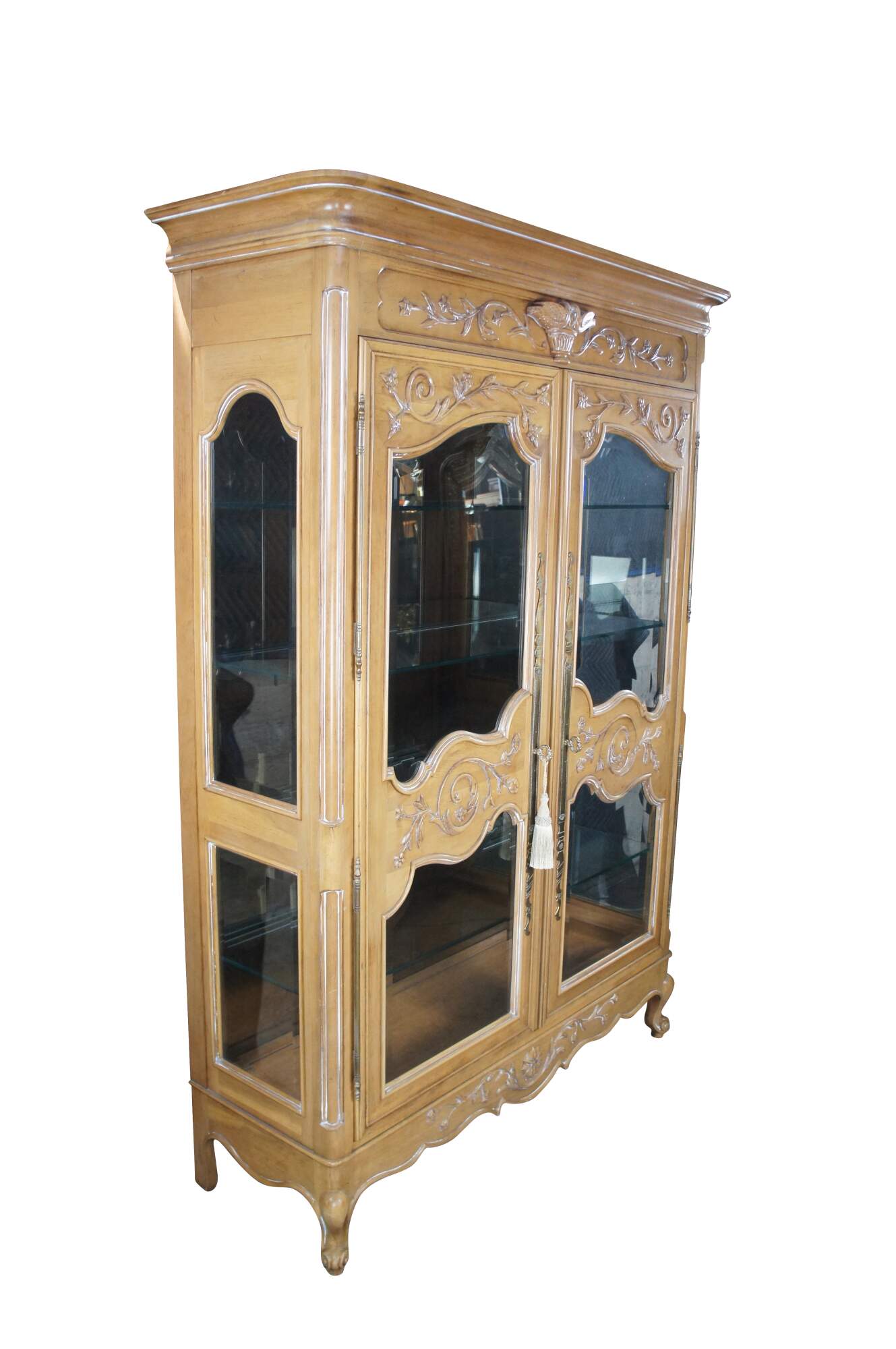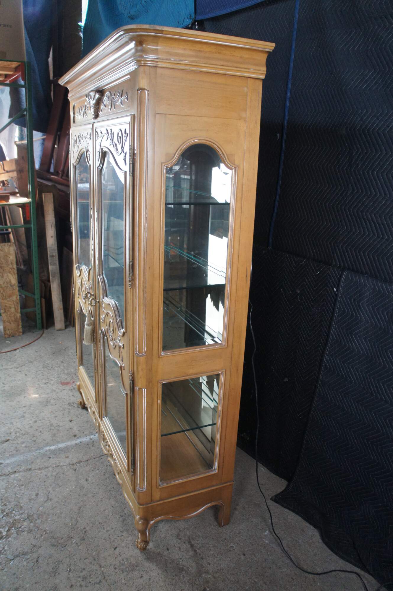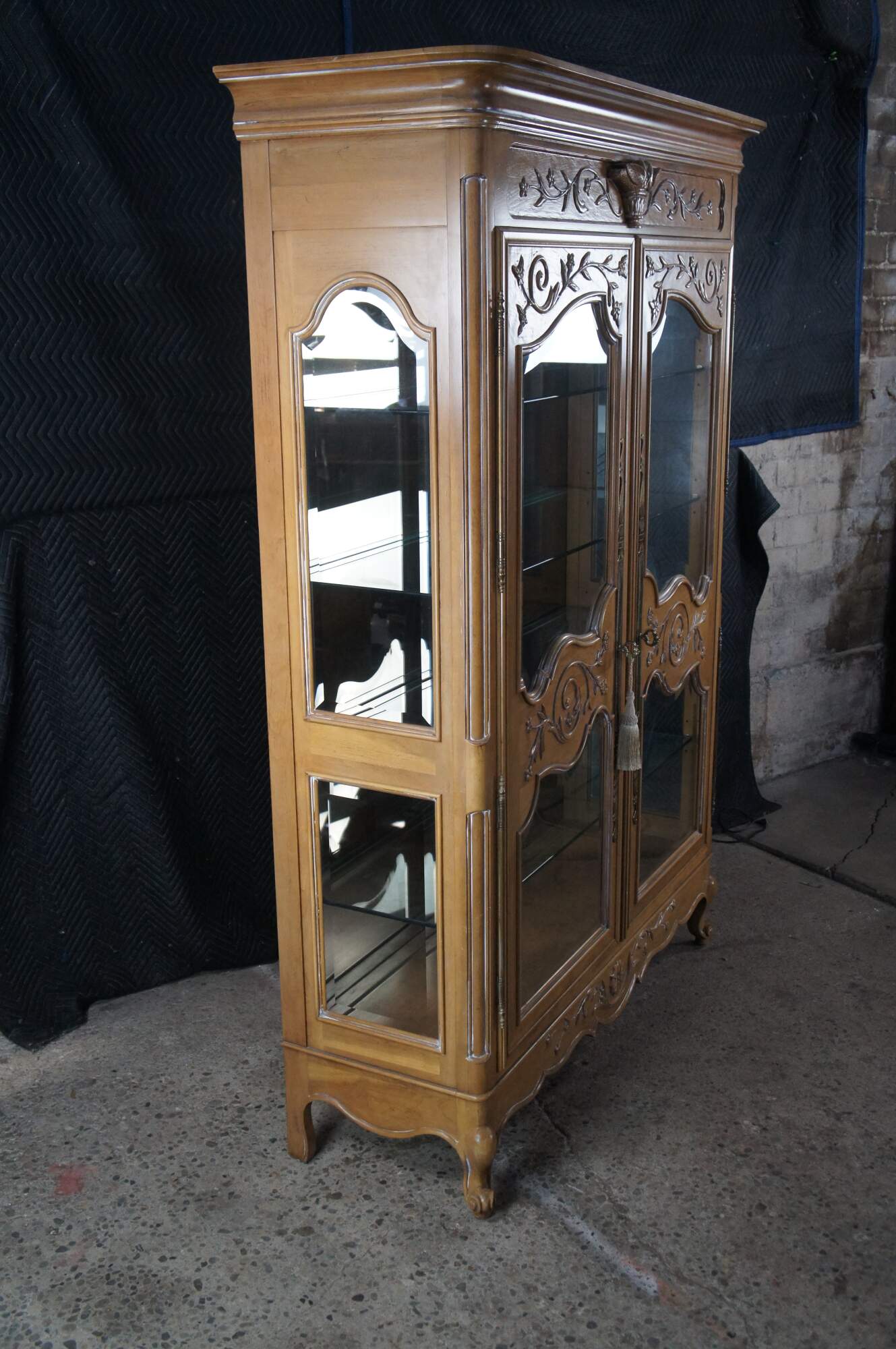 Large and impressive Louis XV / French Provincial style display cabinet, circa 1990. Features a stoud fruitwood frame with carved foliate and songbirds. The Cabinet opens to an illuminated interior with mirrored back and three glass shelves. The case is supported by cabriole scrolled legs along the front and tapered legs at the rear.