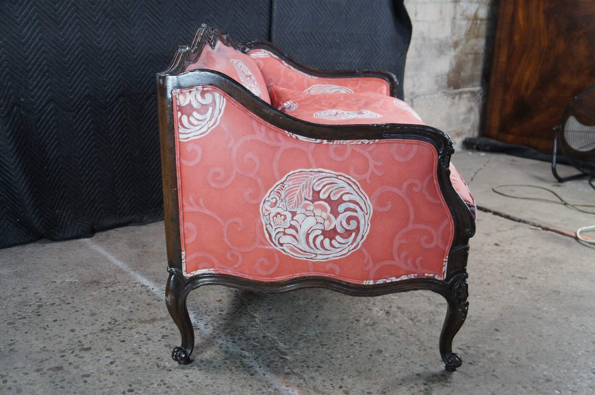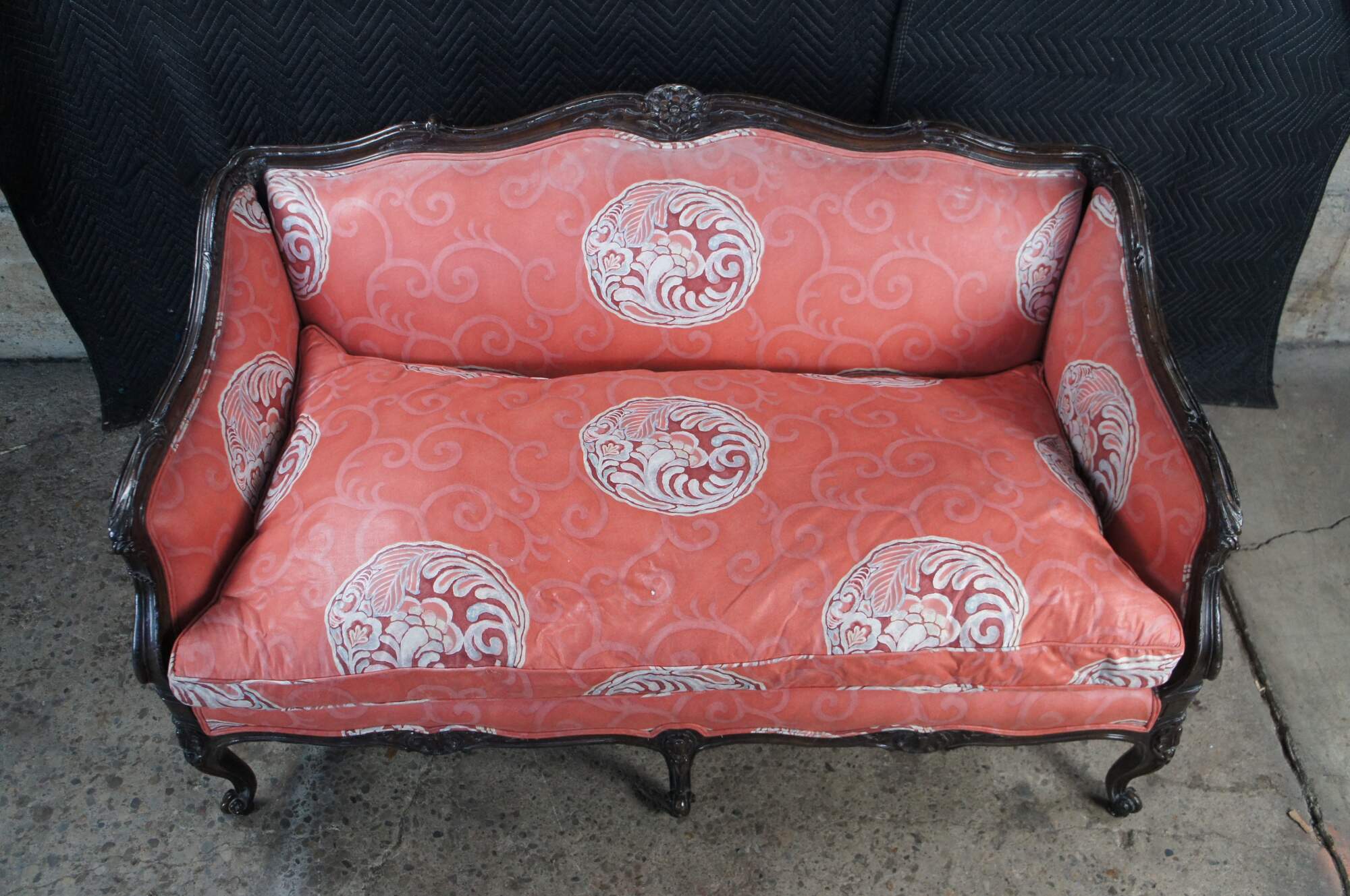 Vintage Meyer Gunther Martini Italian Baroque Louis XV Inspired Sofa, circa 1970. Features a hardwood frame with floral carved medallions and chinoiserie fabric. Supported by cabriole legs with scrolled feet.