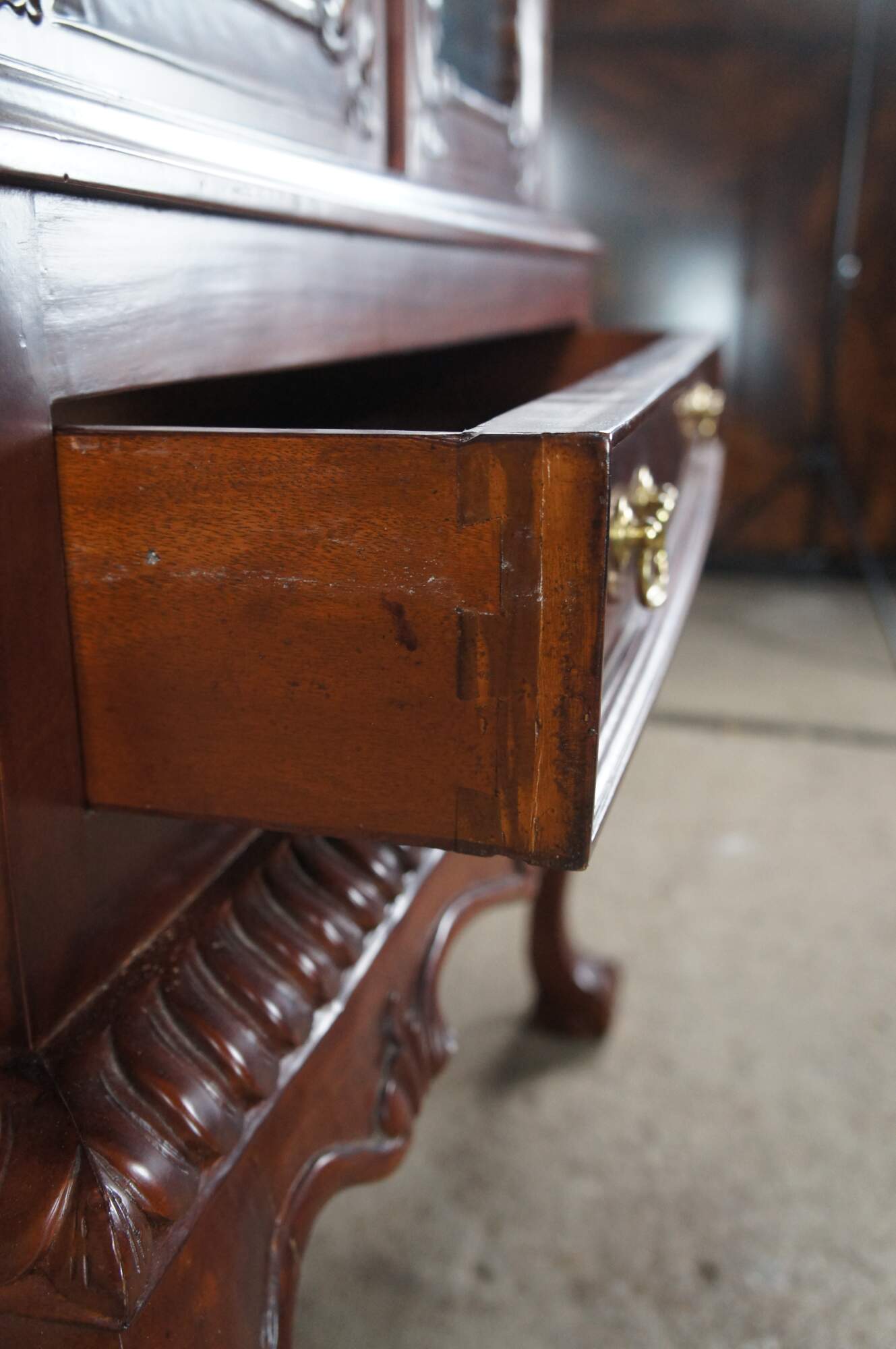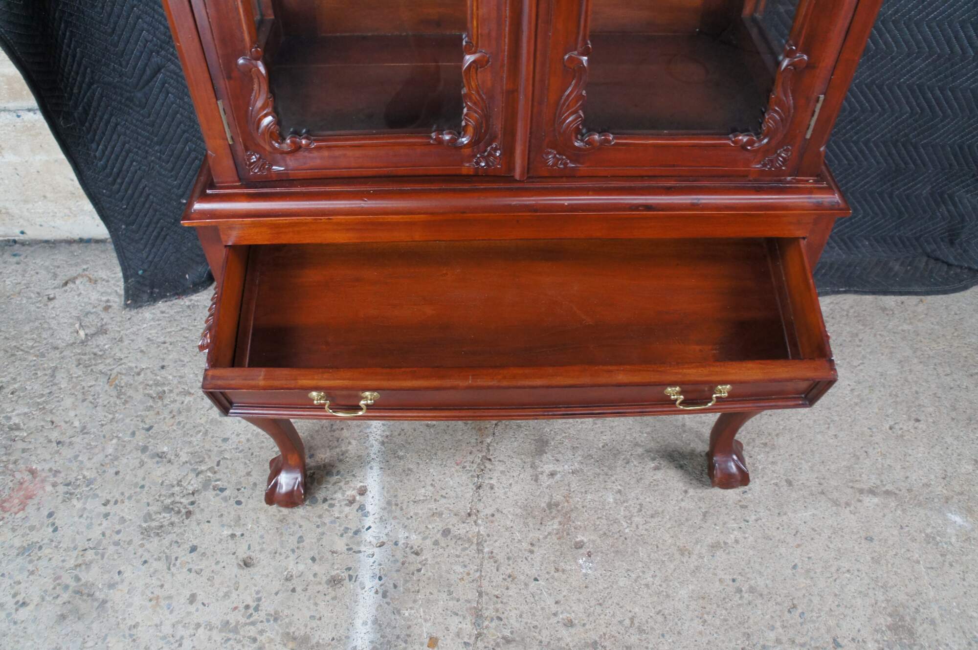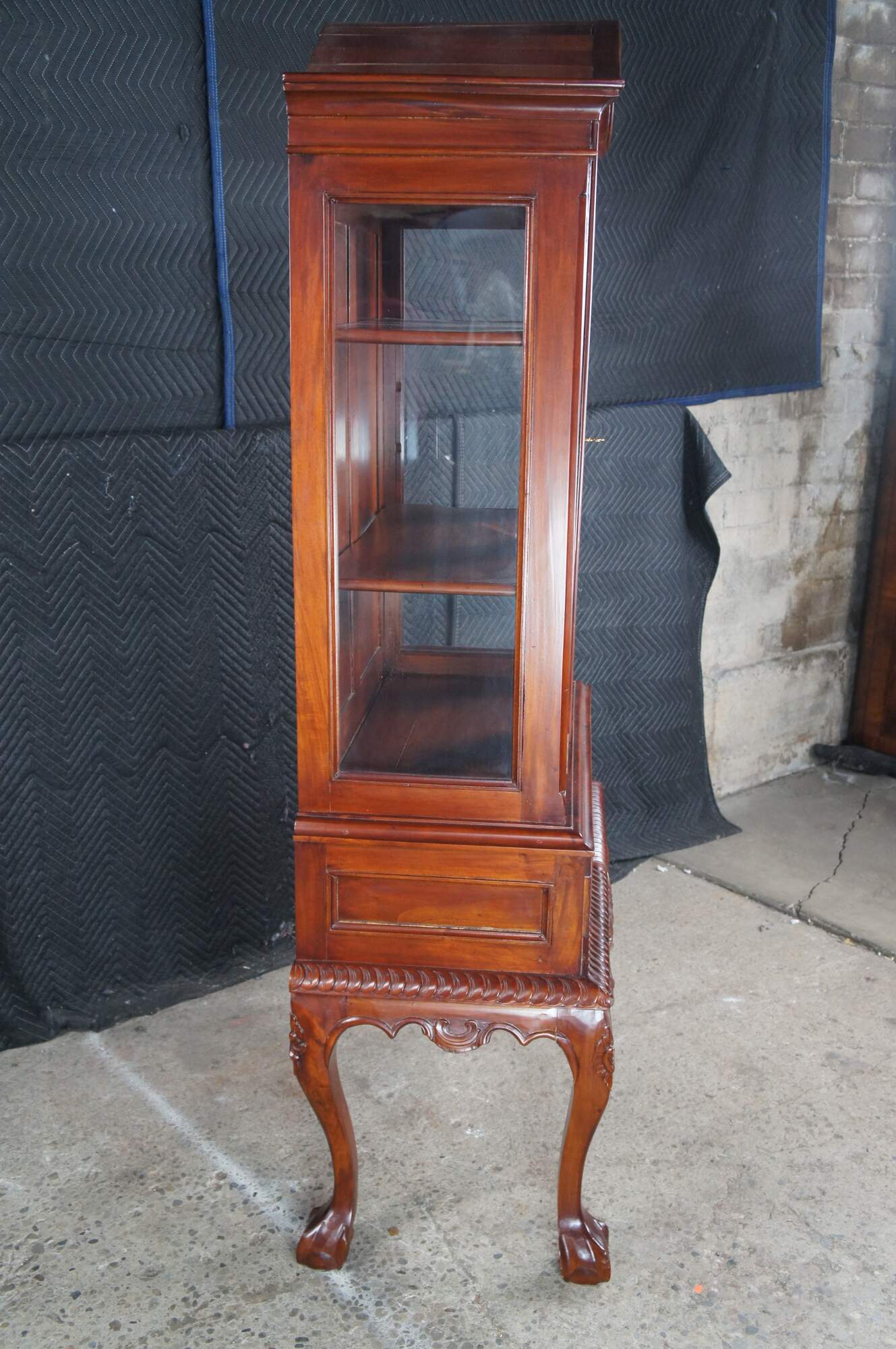 Vintage mahogany curio display case / hutch / cabinet featuring Chippendale styling with a domed top and acanthus accents. The cabinet has a large lower storage drawer, and is supported by Queen Anne style ball and claw feet. Includes working key.