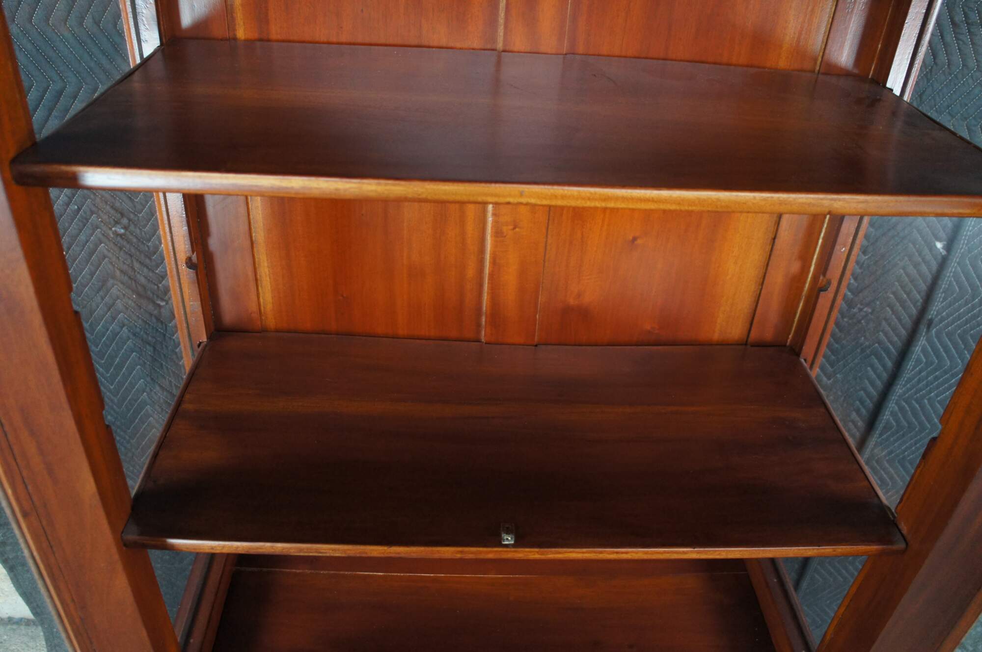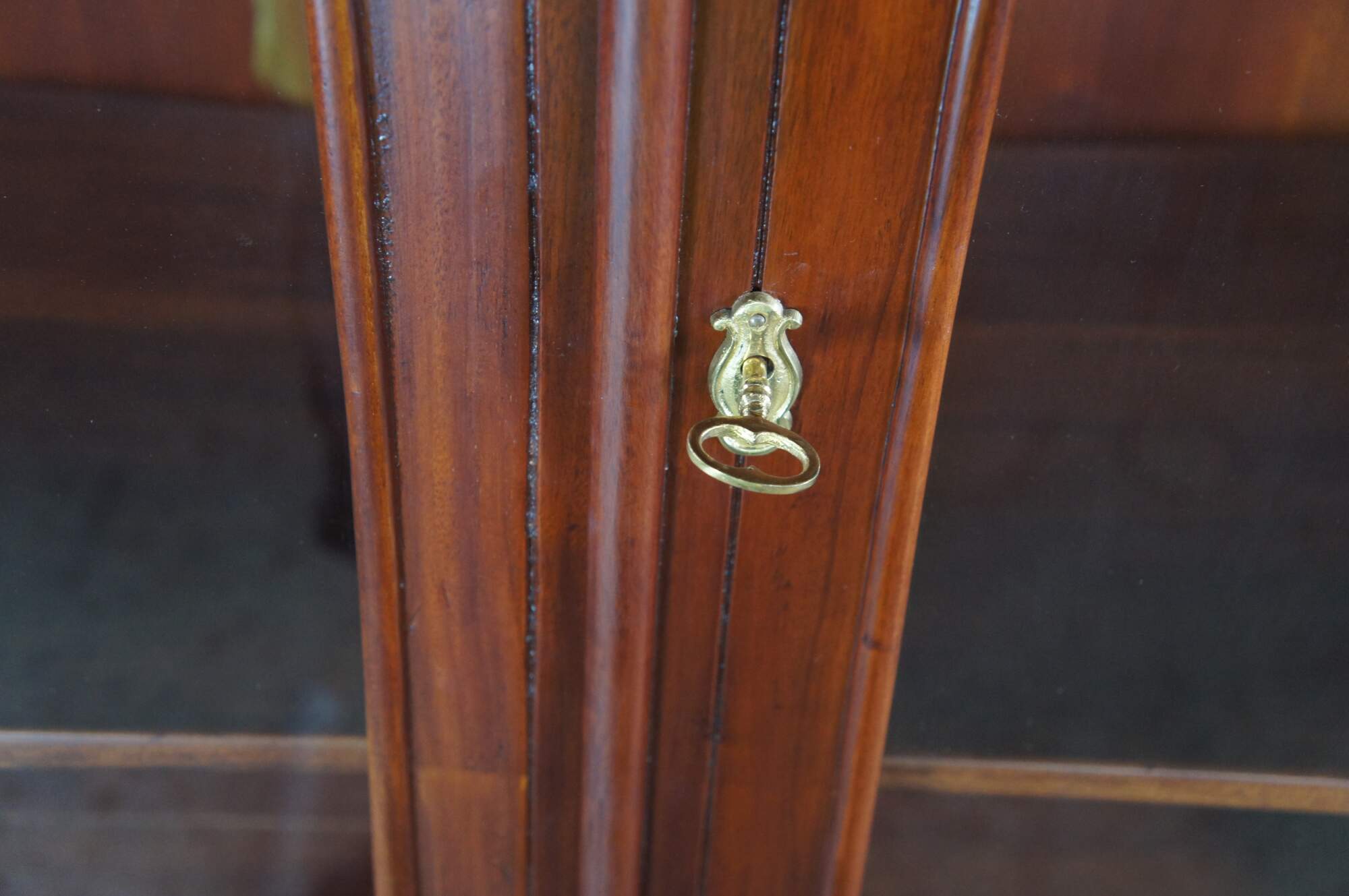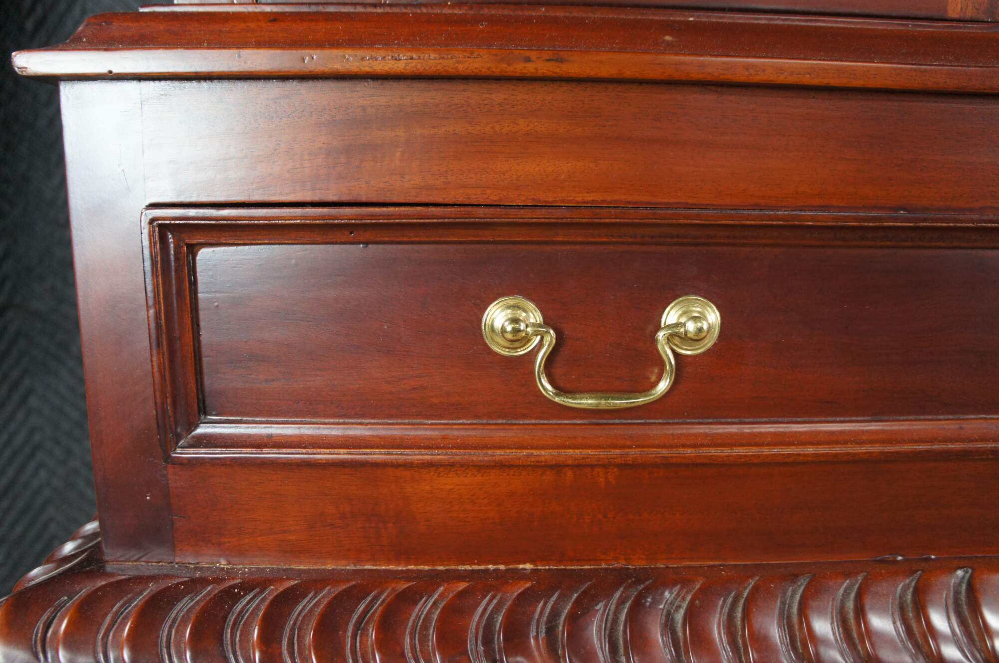 Vintage mahogany curio display case / hutch / cabinet featuring Chippendale styling with a domed top and acanthus accents. The cabinet has a large lower storage drawer, and is supported by Queen Anne style ball and claw feet. Includes working key.