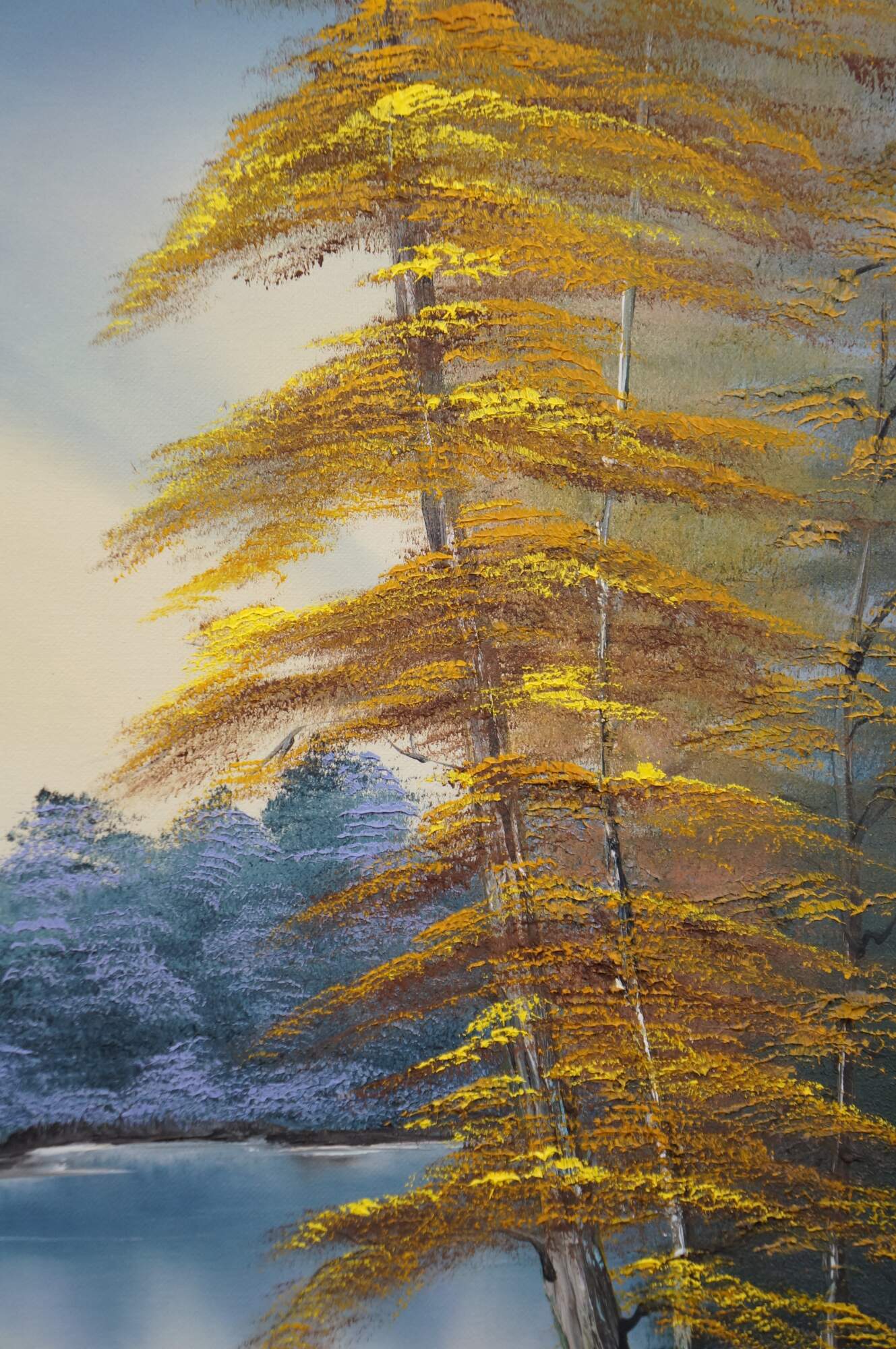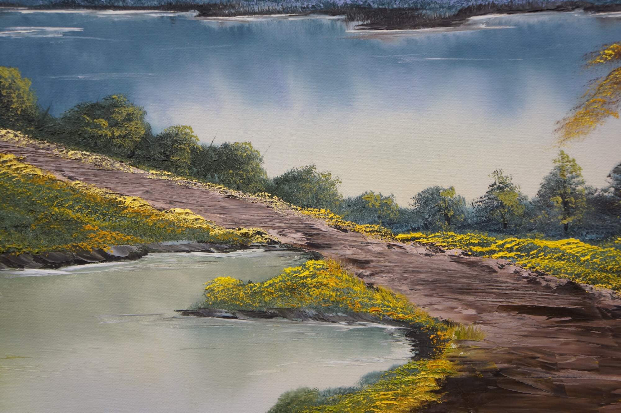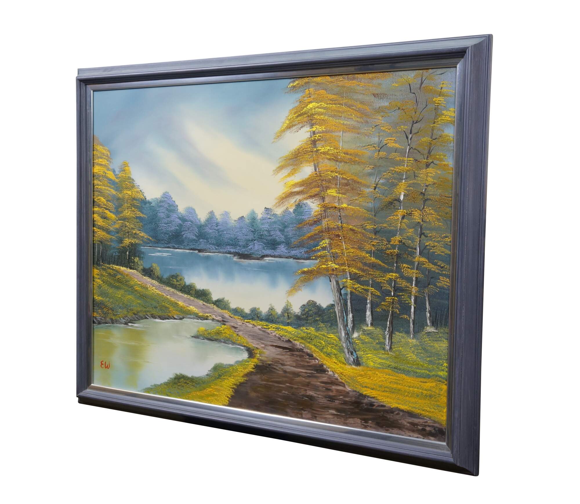 Late 20th century oil on canvas landscape titled "Bright Autumn Trees," after a tutorial by Bob Ross on his show "The Joy of Painting." Depicts a charming forested landscape of a path between lakes, surrounded by colorful autumn trees. Signed EW in lower left painted by Fred E Weber of Dayton Ohio and Weber Jewelers. Blue-gray beveled wood frame.; no mat.