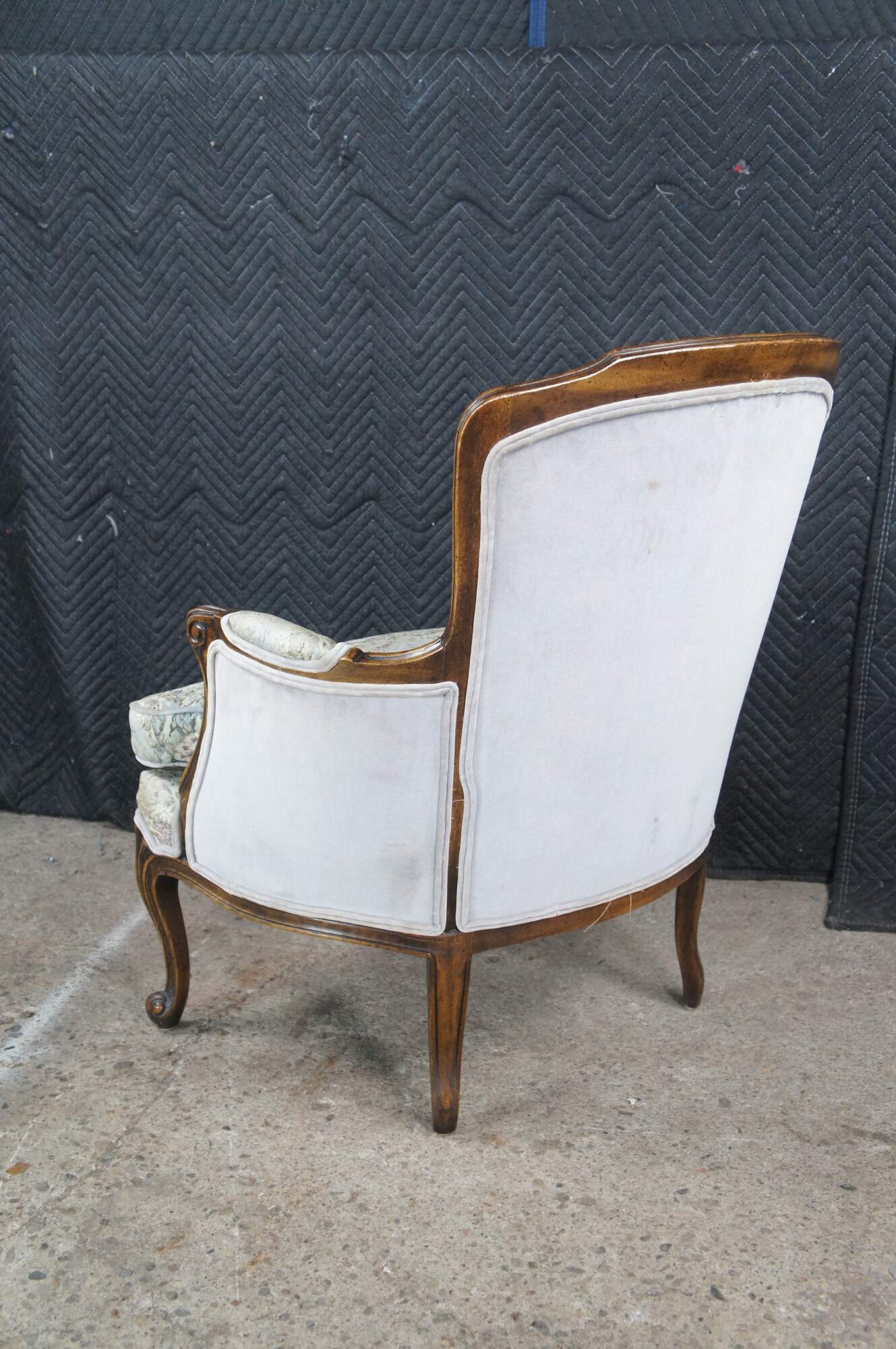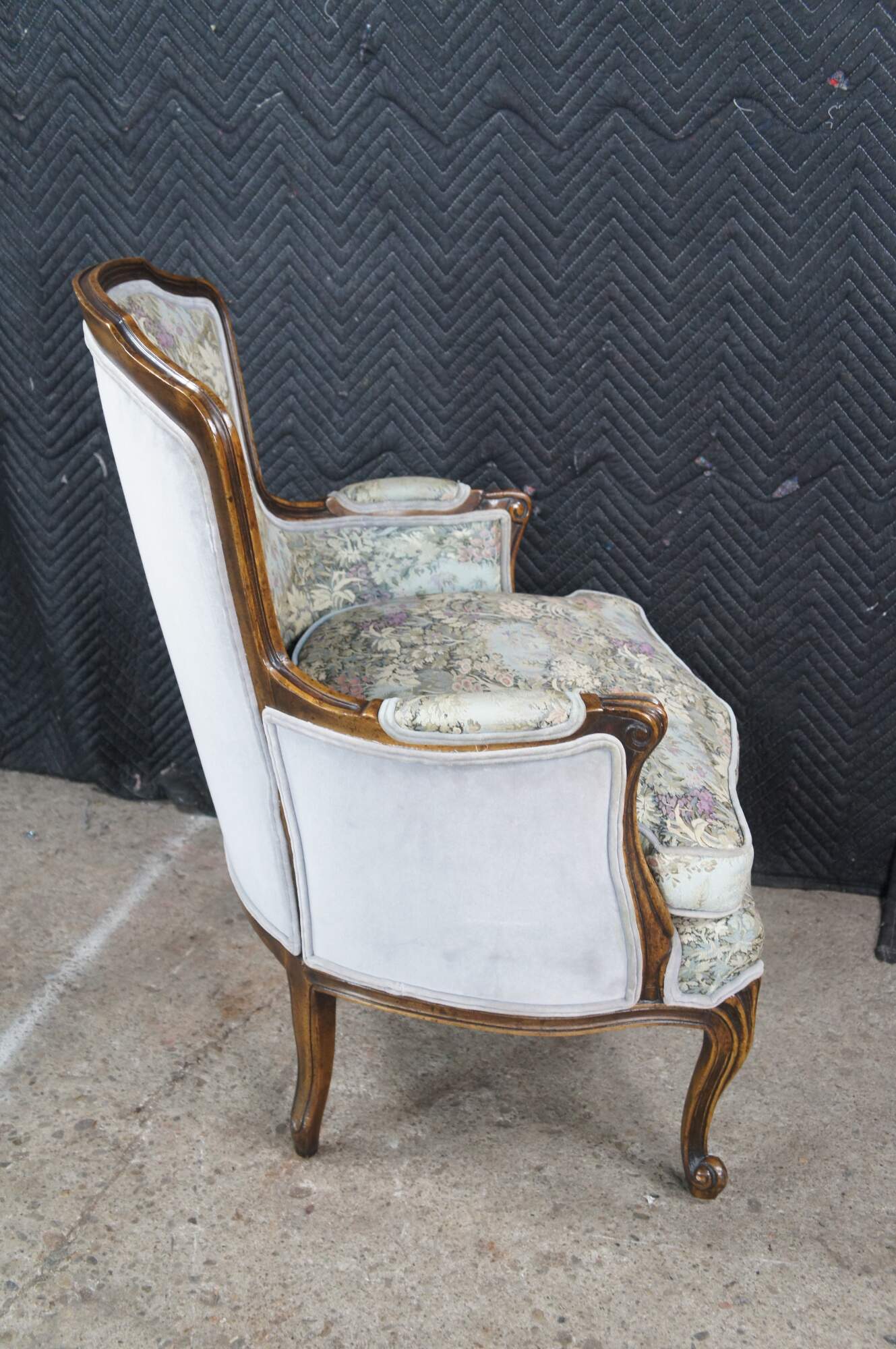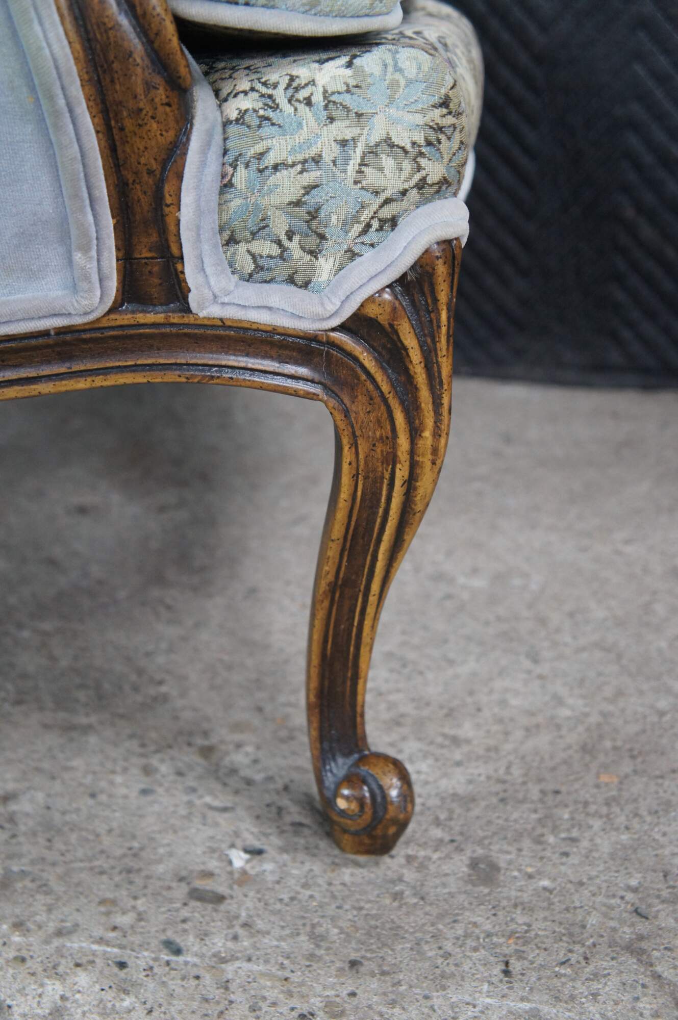 Pair of two vintage Wellington Hall floral upholstered fauteuil arm chairs. Made of walnut featuring French styling with domed wingback design, padded arms, serpentine accents and cabriole legs. Floral upholstered front, velvet back.